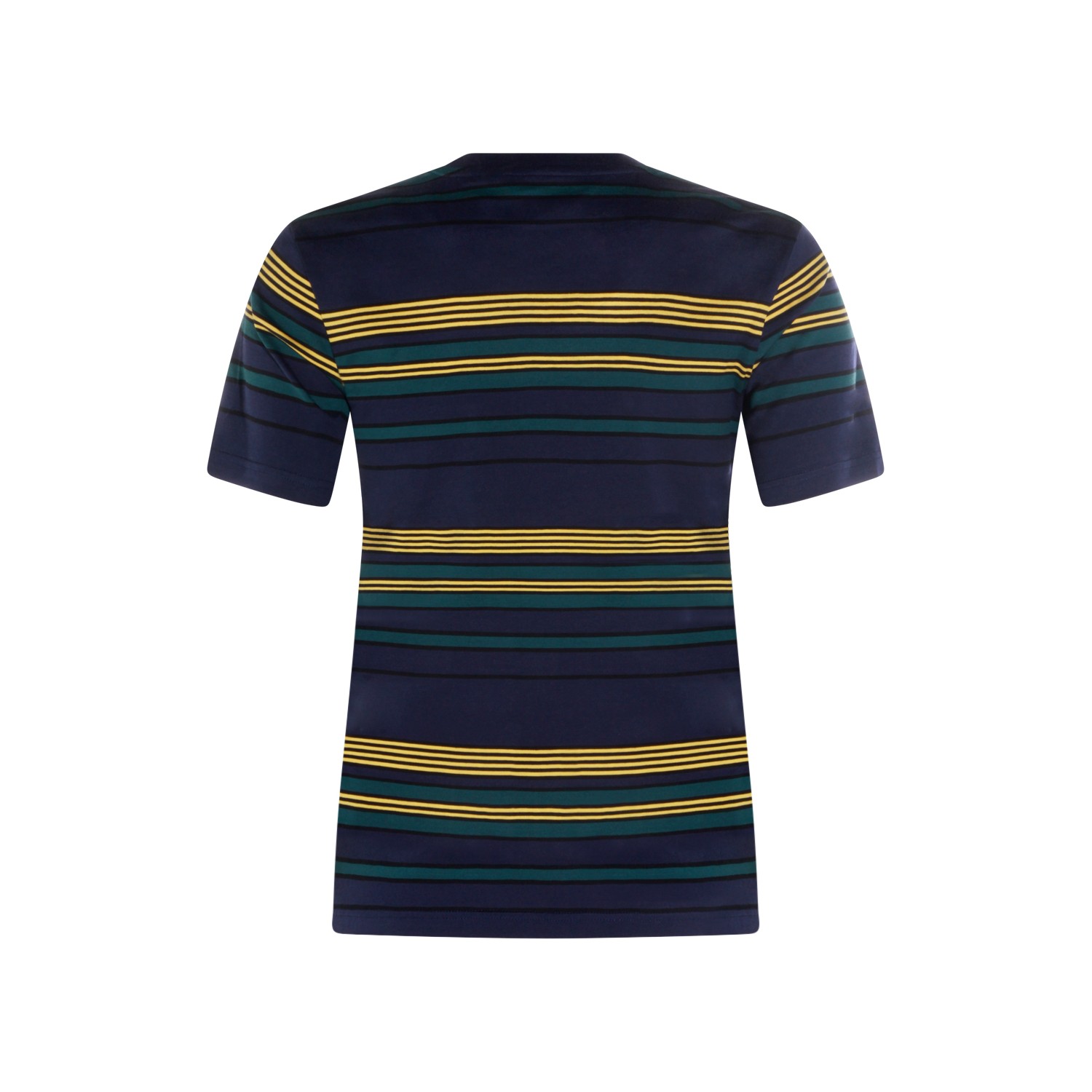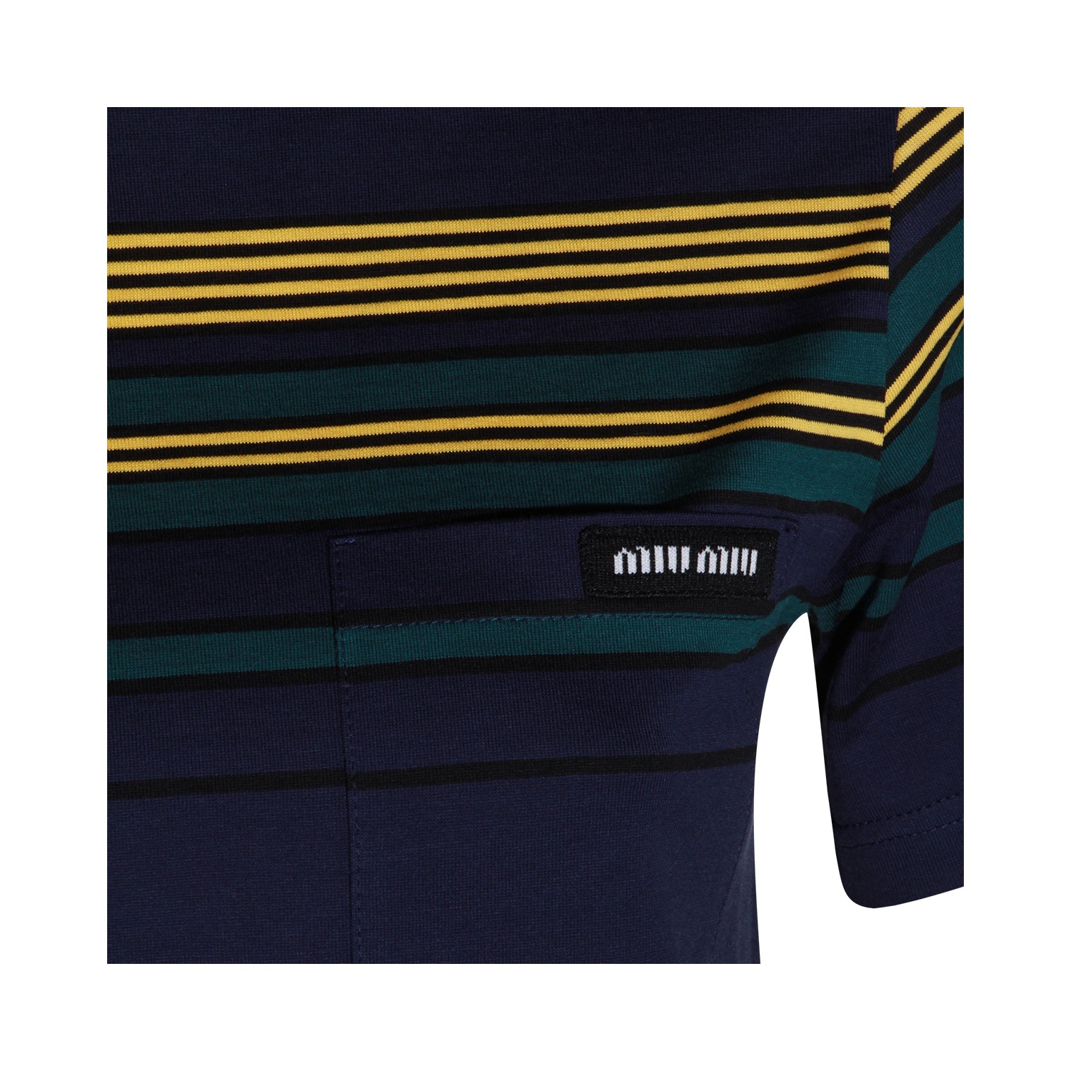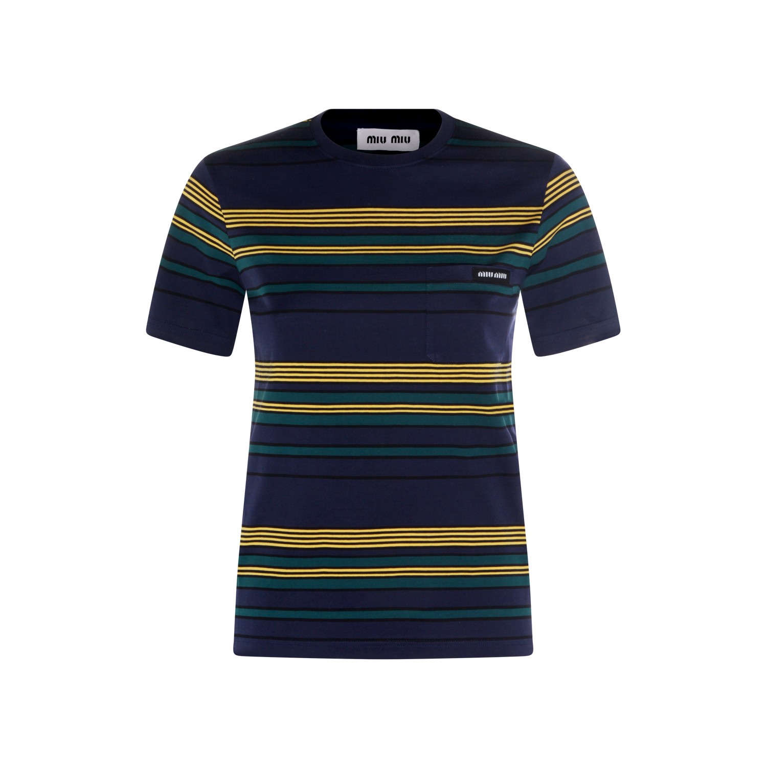 Blue cotton t-shirt from Miu Miu featuring crew neck, short sleeves, colorful stripes and regular vestibility.
