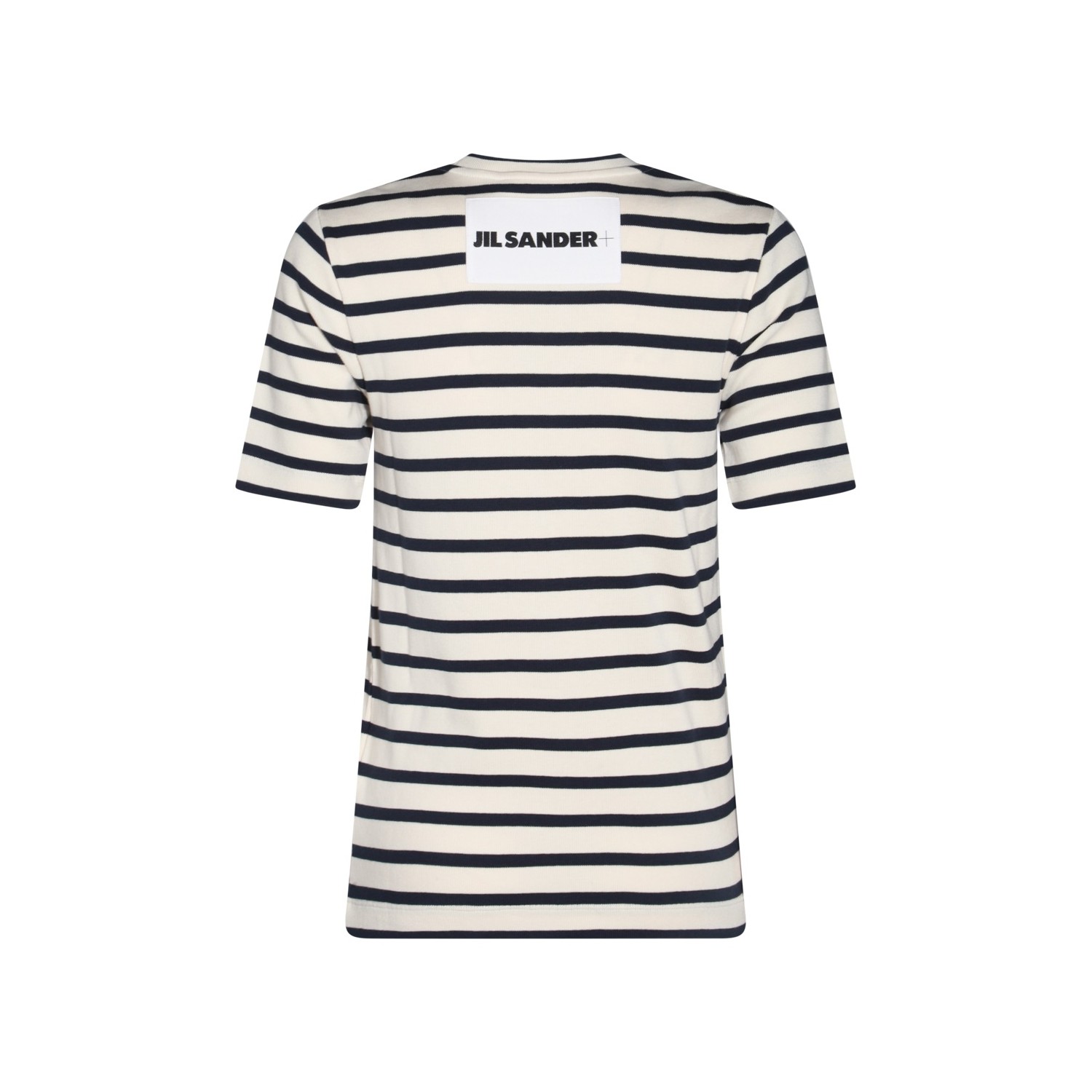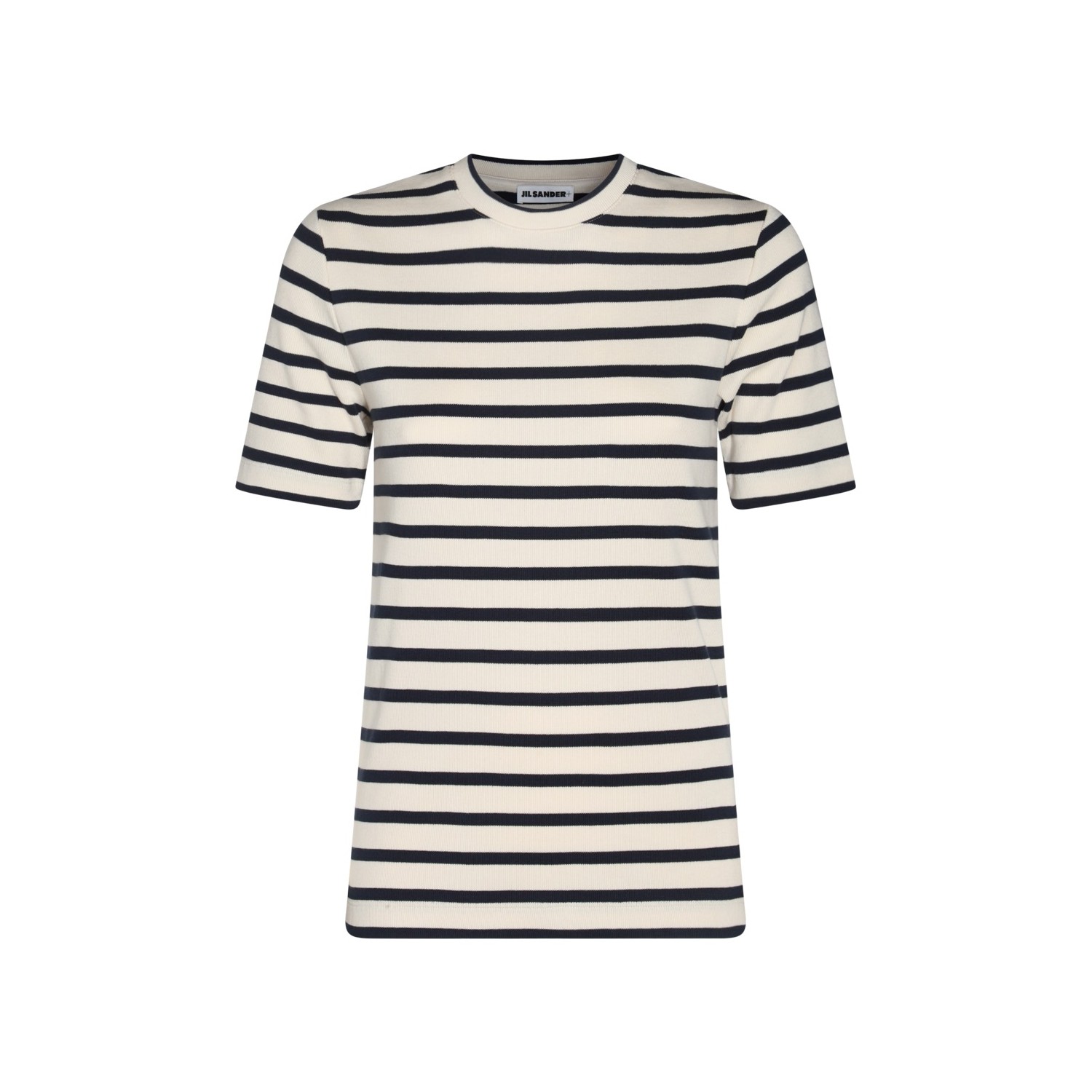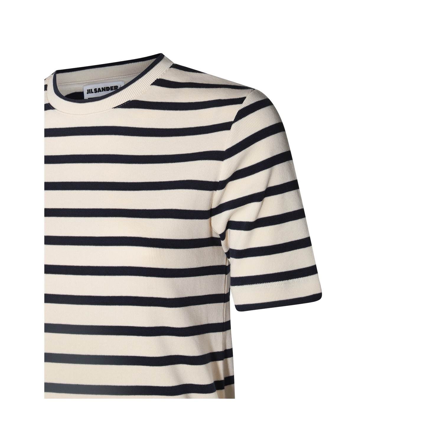 Dark blue and white cotton t-shirt from Jil Sander featuring round collar, short sleeves and all over stripes.