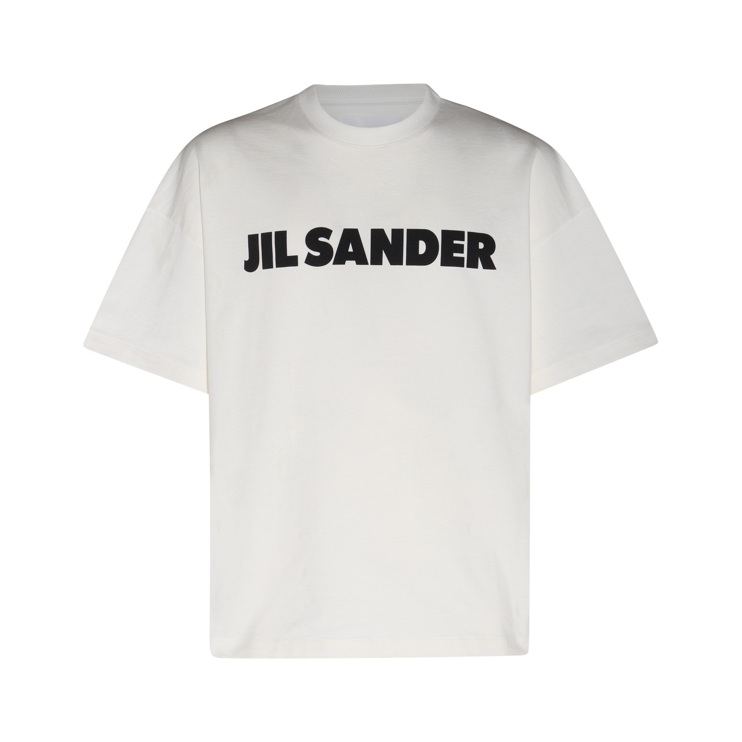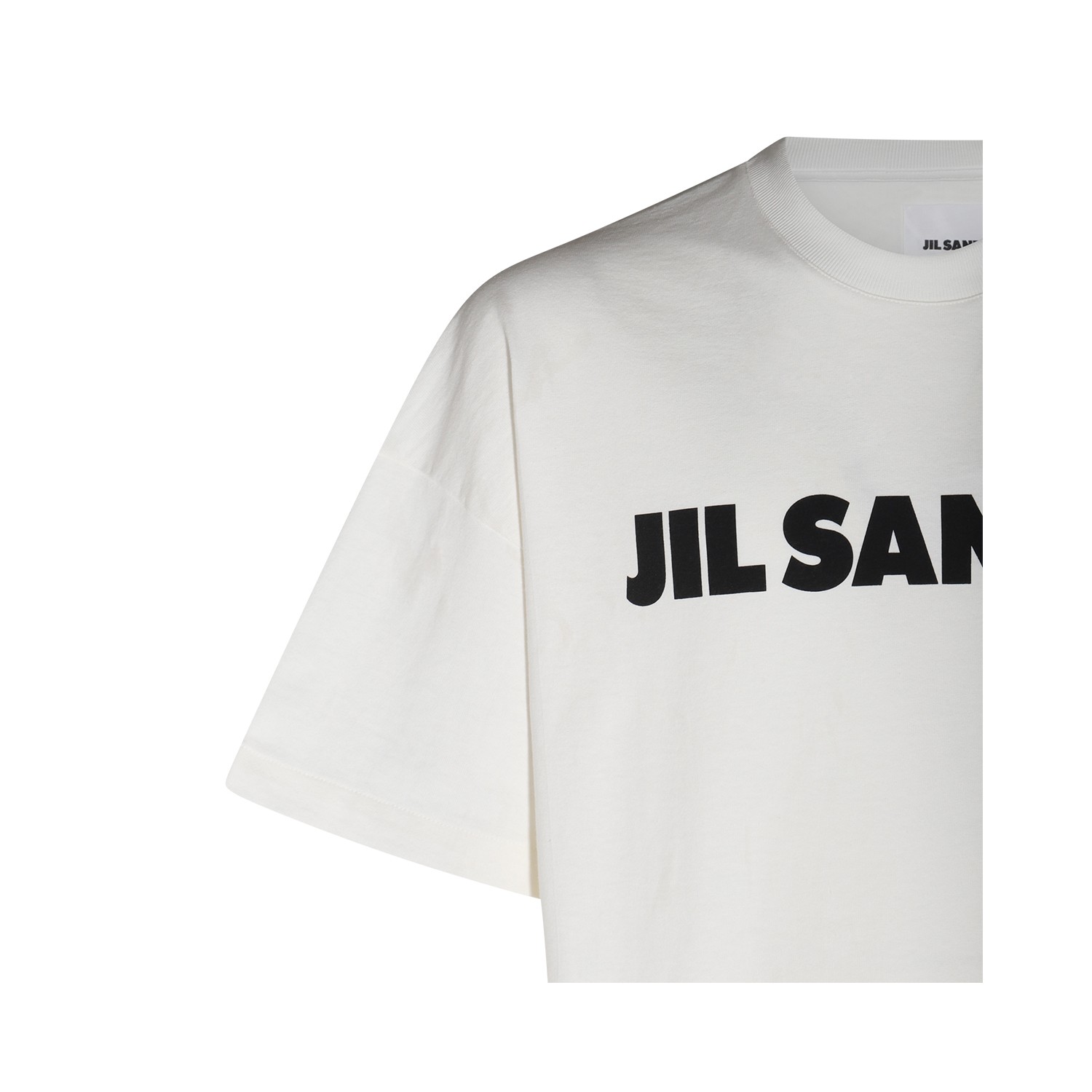 White cotton t-shirt from Jil Sander featuring round collar, short sleeves, oversize vestibility and frontal logo print.