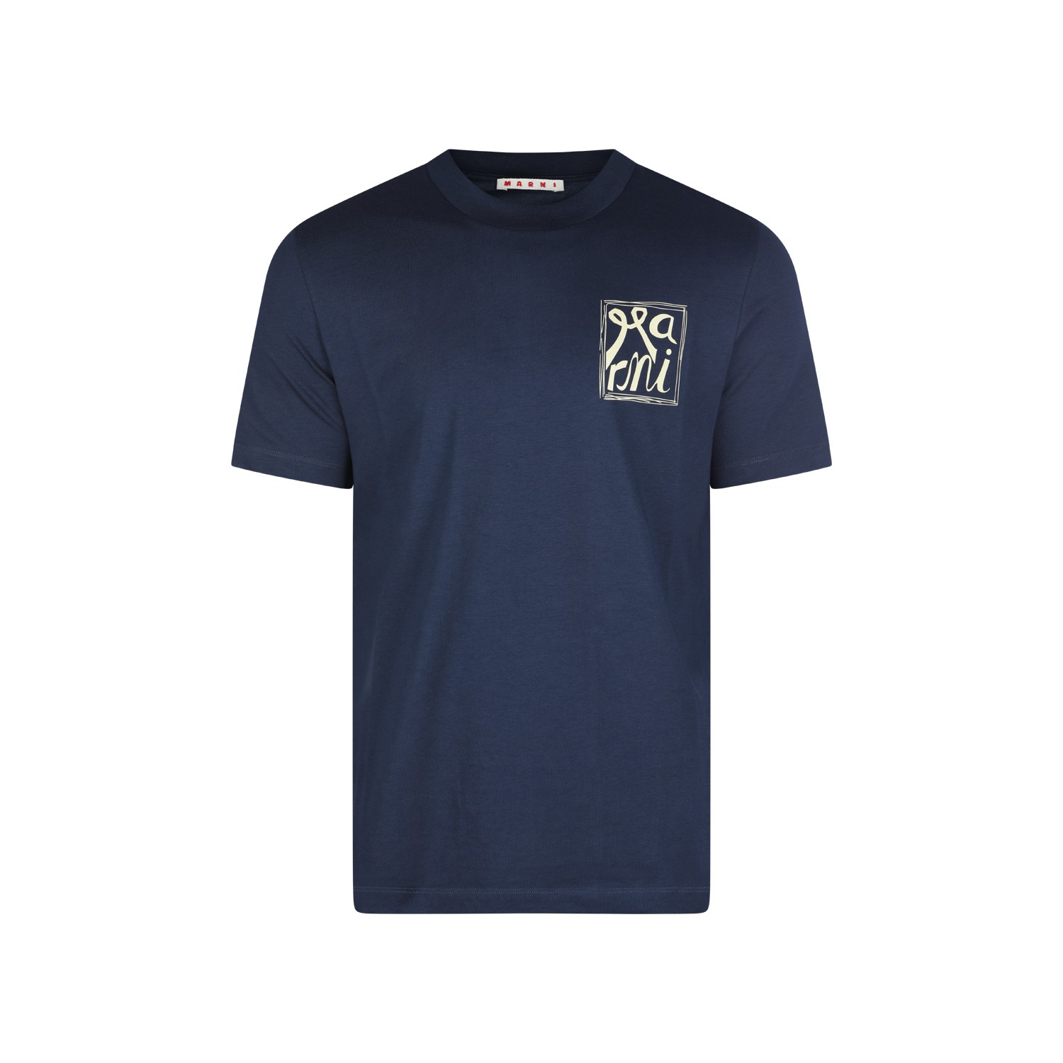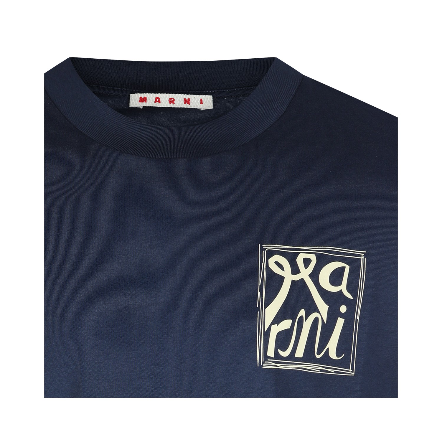 Navy cotton t-shirt from Marni featuring crew neck, short sleeves, frontal stamp and regular vestibility.
