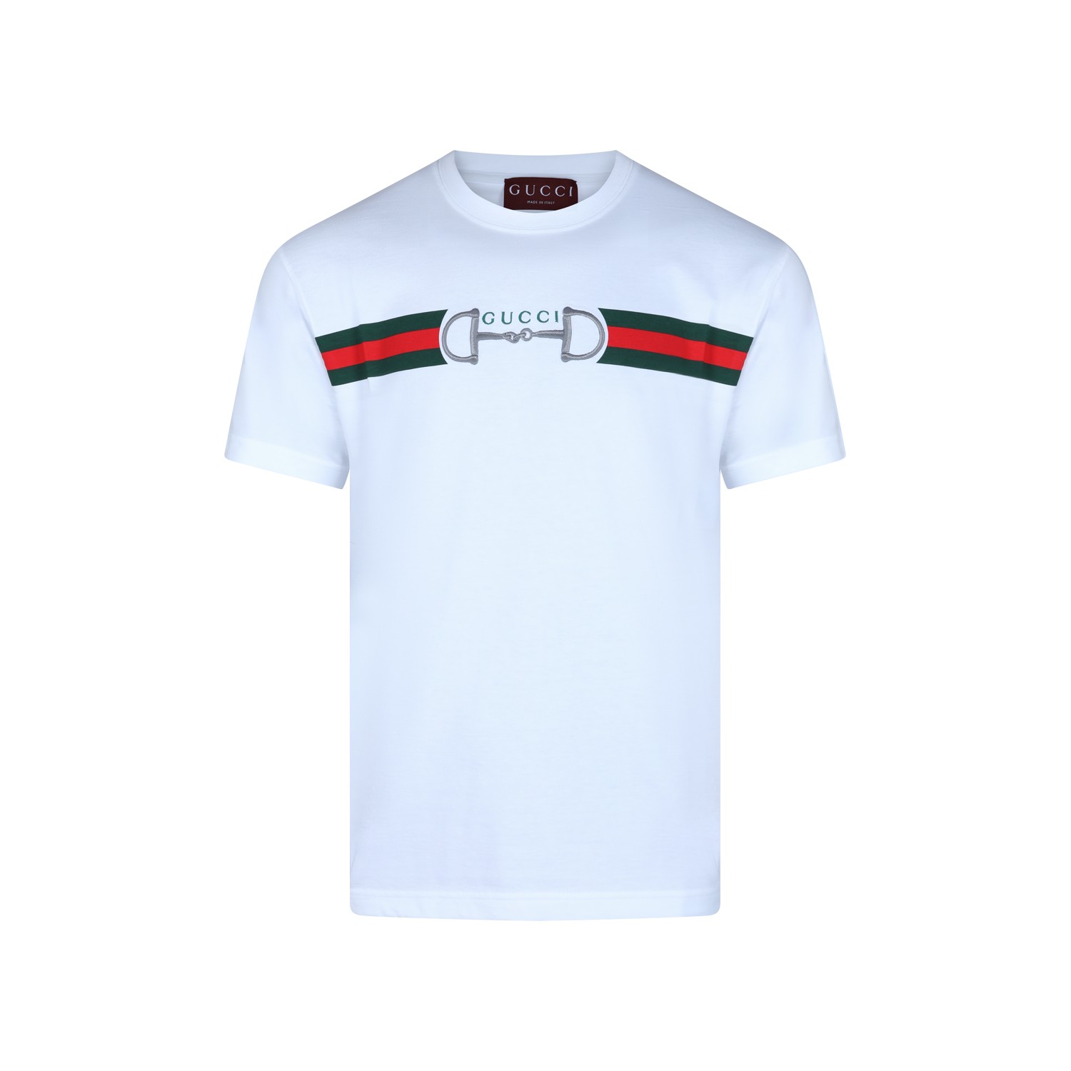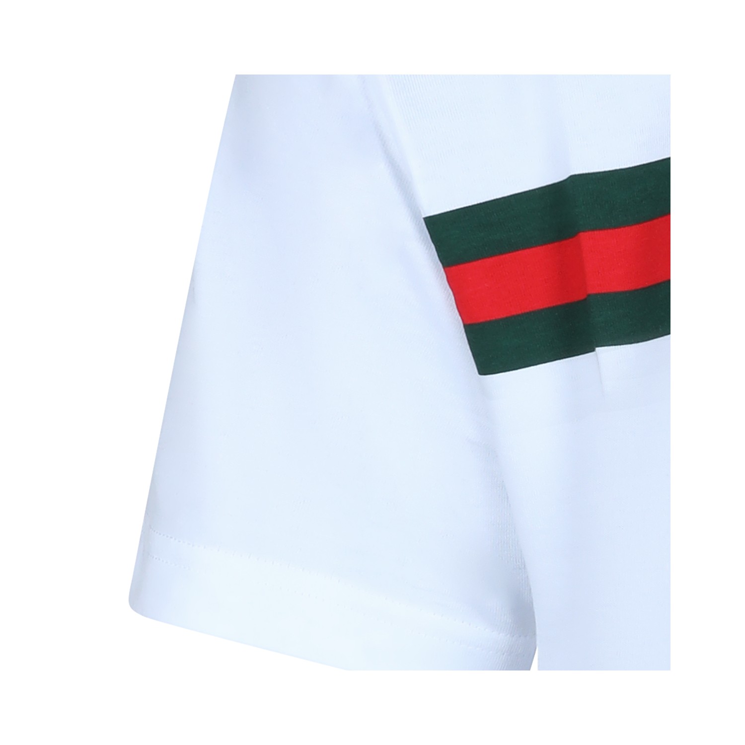 White cotton t-shirt from Gucci featuring crew neck, short sleeves, frontal stamp and regular vestibility.