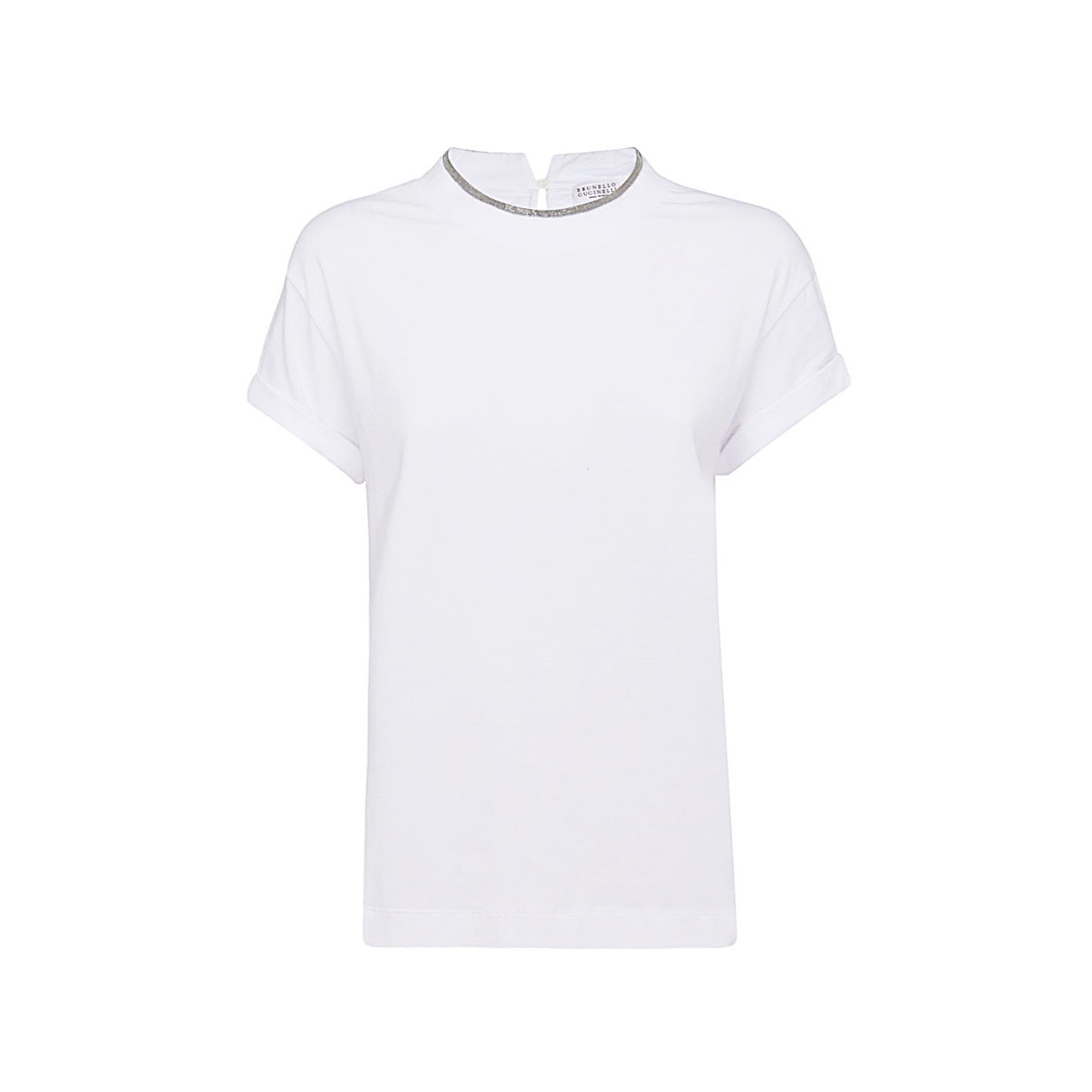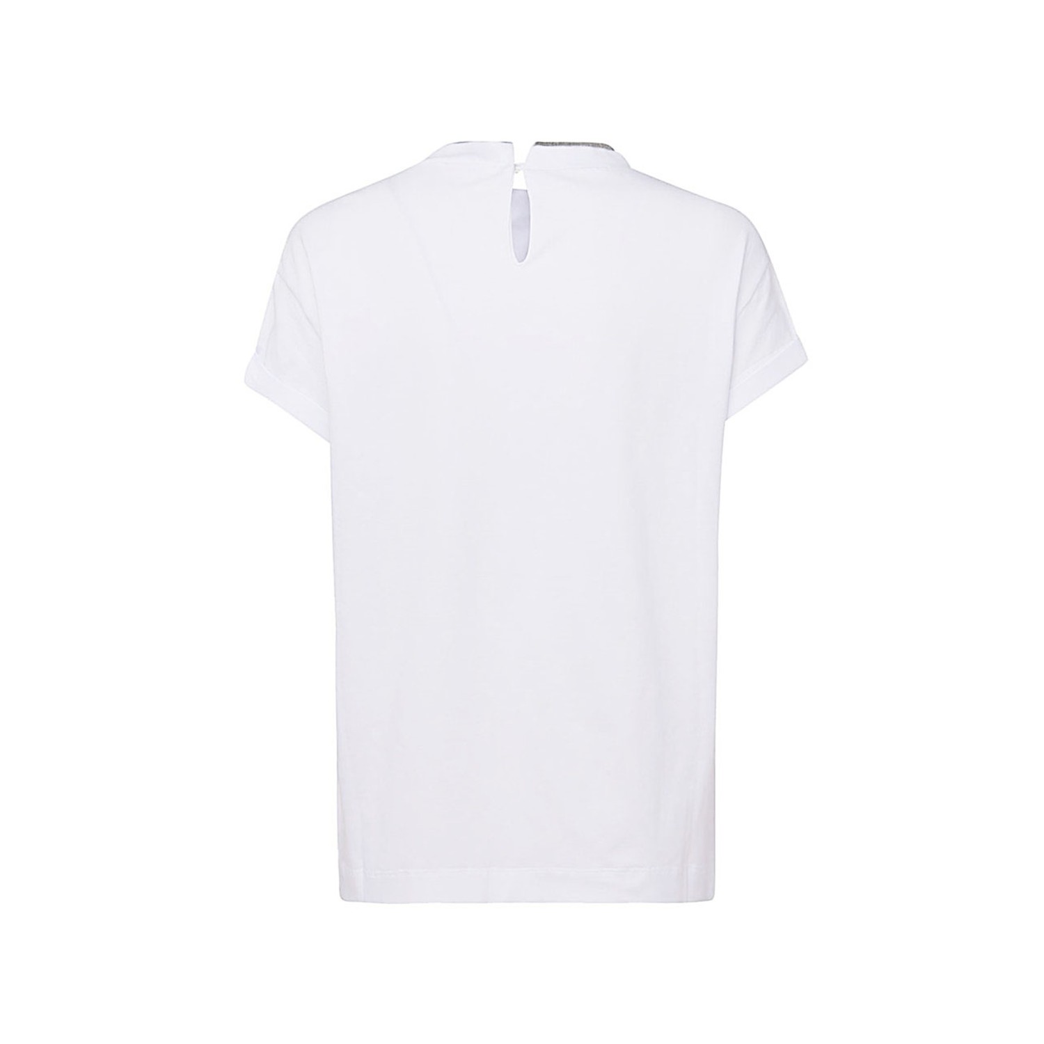 White cotton blend T-shirt from Brunello Cucinelli featuring contrasting trim, rear neck button fastening, crew neck and short sleeves.
