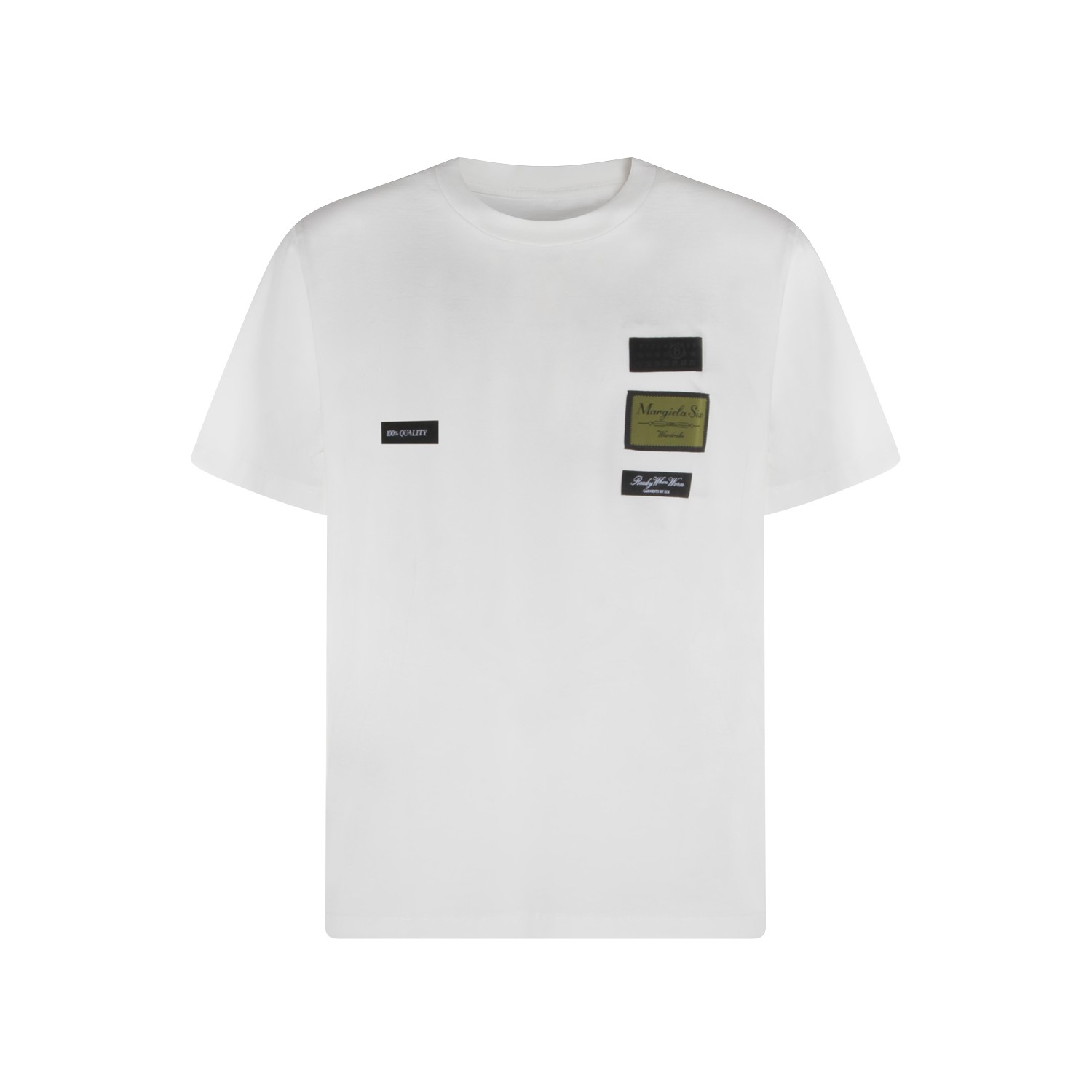 White cotton t-shirt from MM6 Maison Margiela featuring crew neck, short sleeves, frontal patches and regular vestibility.