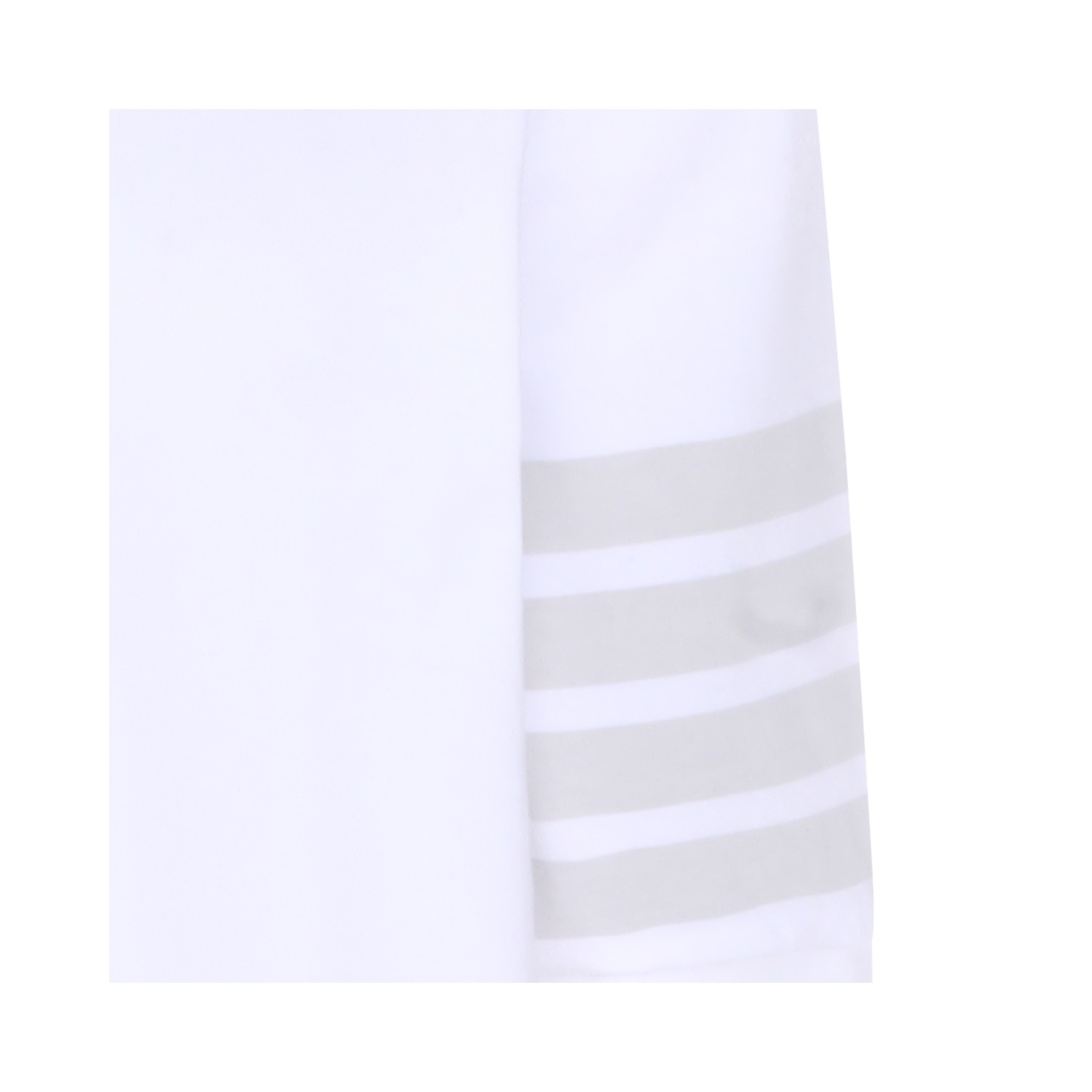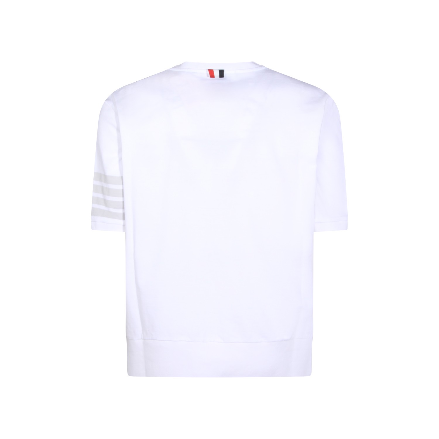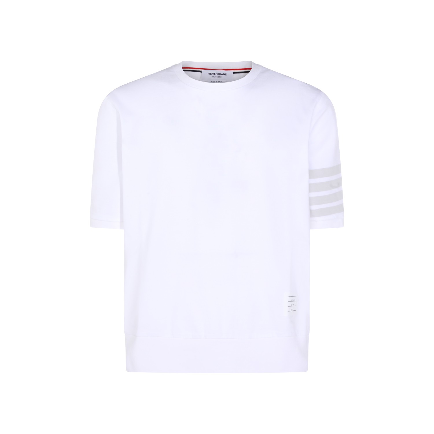 White cotton Four Band T-Shirt from Thom Browne featuring short sleeves, round neck, straight hem and classic line.
