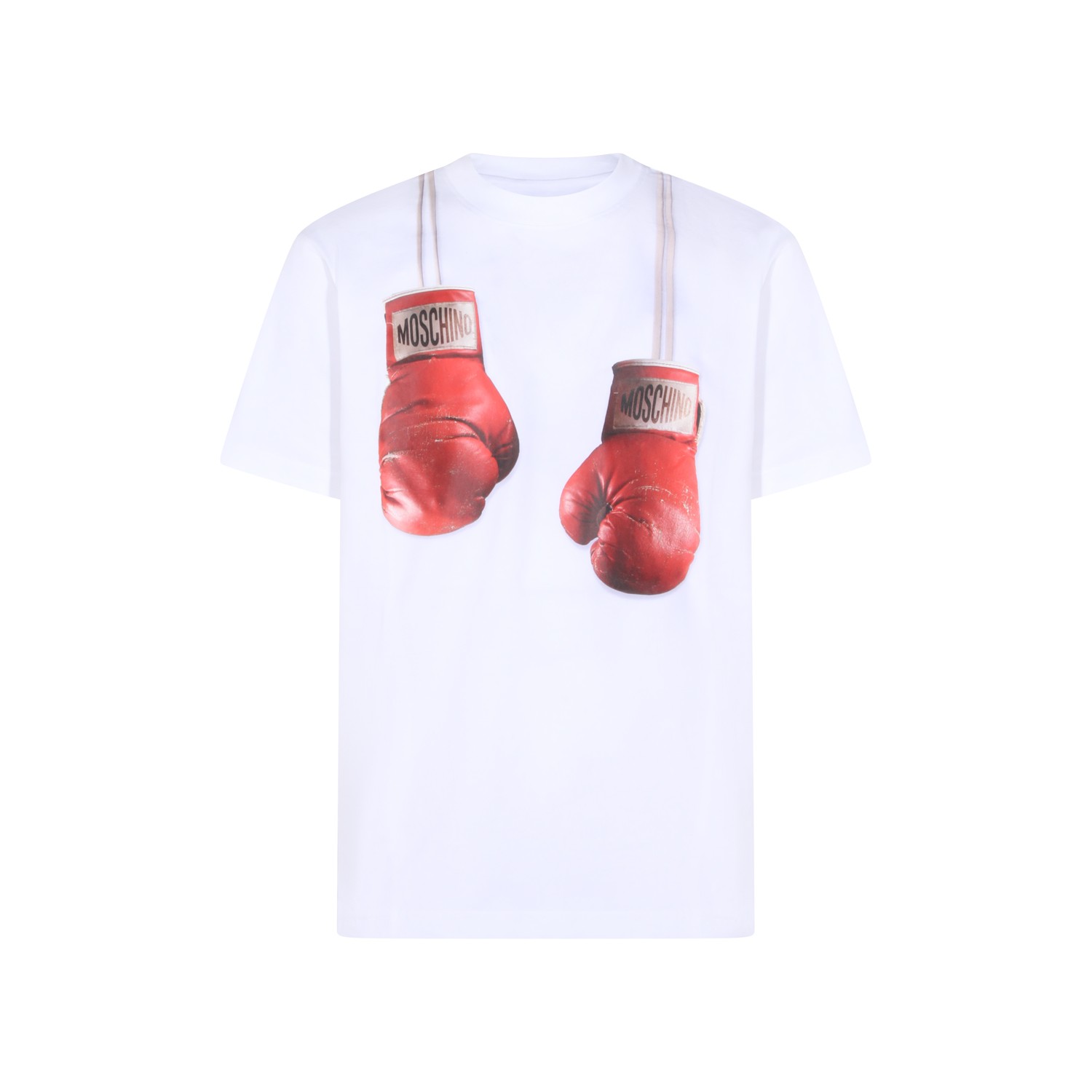 White cotton t-shirt from Moschino featuring crew neck, short sleeves, frontal stamp and regular vestibility.