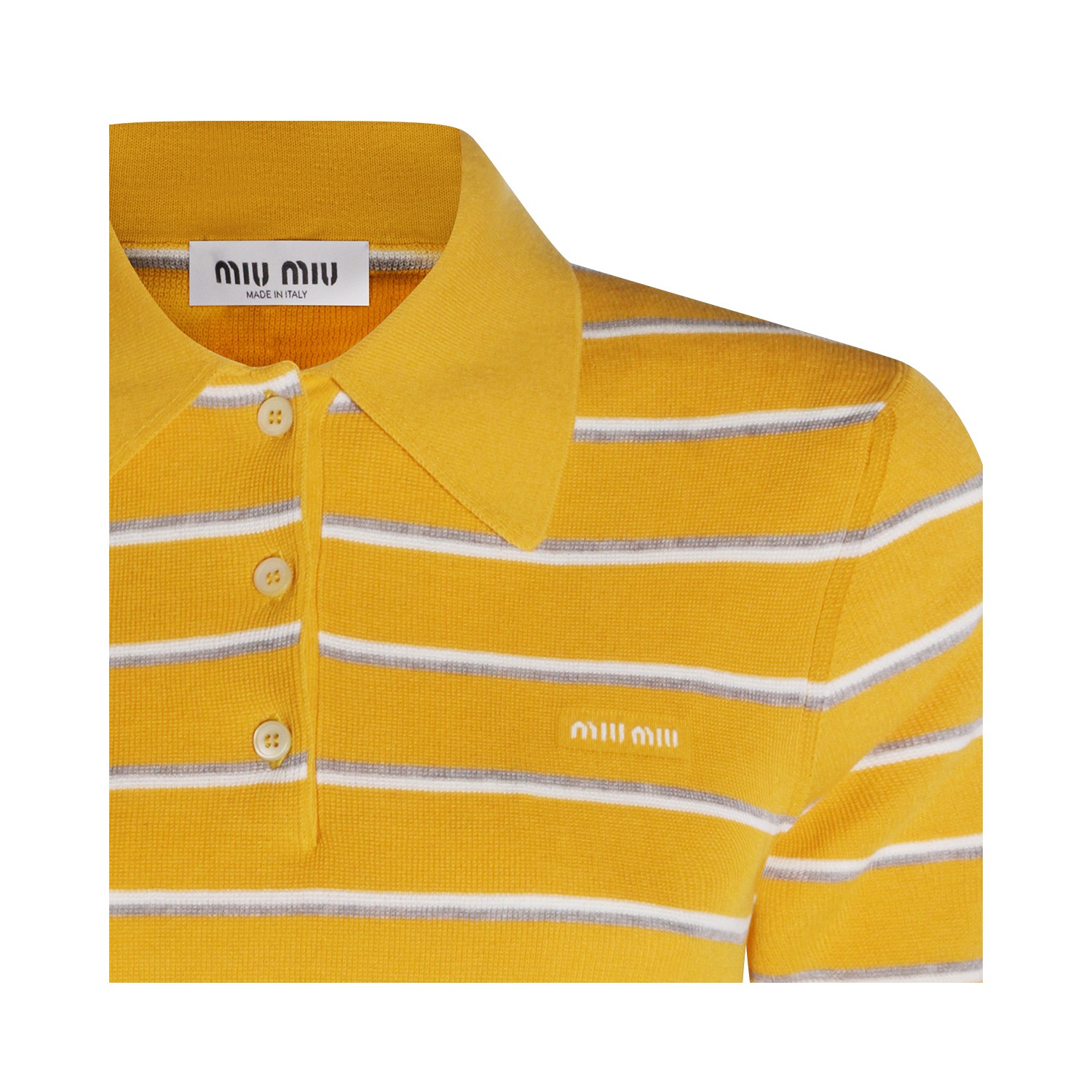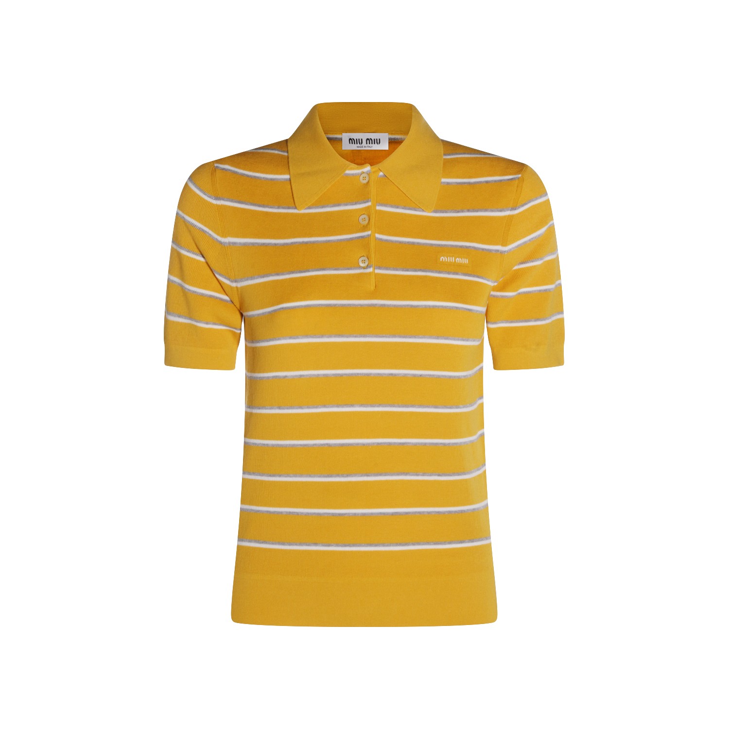 Yellow cotton polo shirt from Miu Miu featuring regular collar, buttons fastening, short sleeves, all-over stripes, frontal logo and regular vestibility.