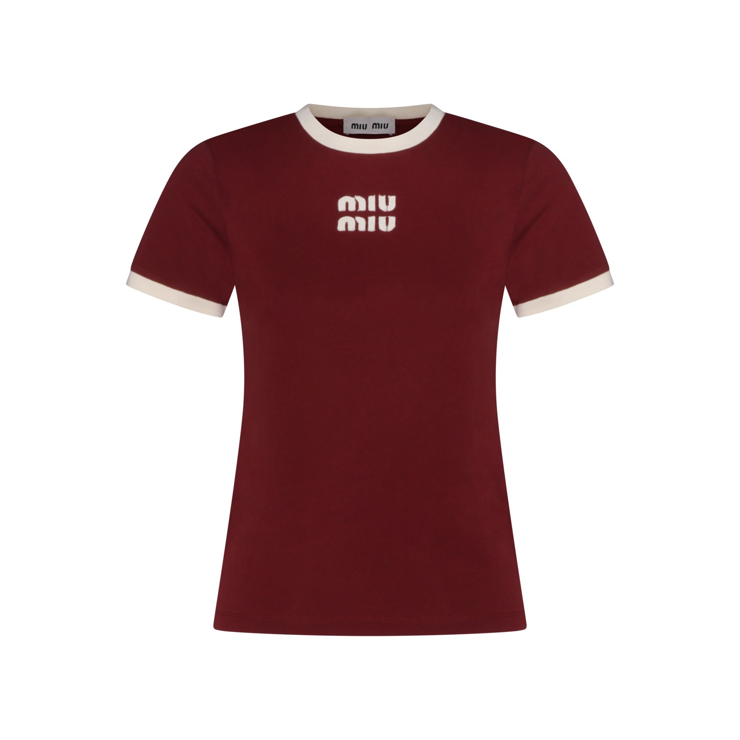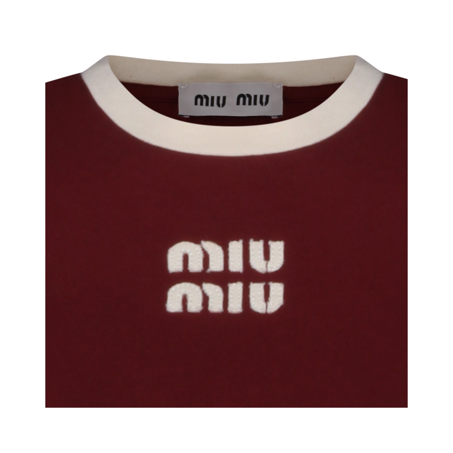 Burgundy cotton t-shirt from Miu Miu featuring crew neck, short sleeves, frontal logo and regular vestibility.