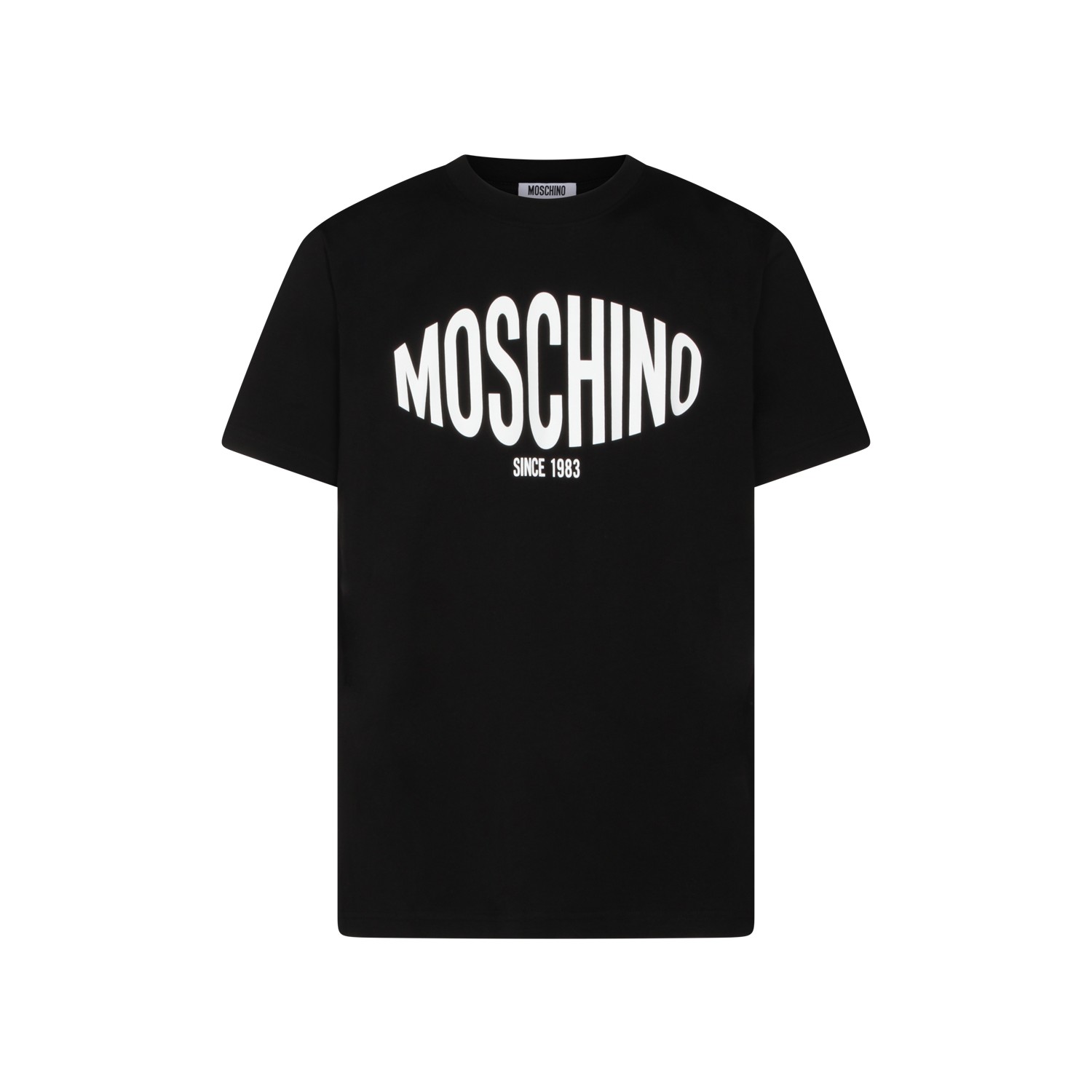 Black cotton t-shirt from Moschino featuring crew neck, short sleeves, frontal logo and regular vestibility.