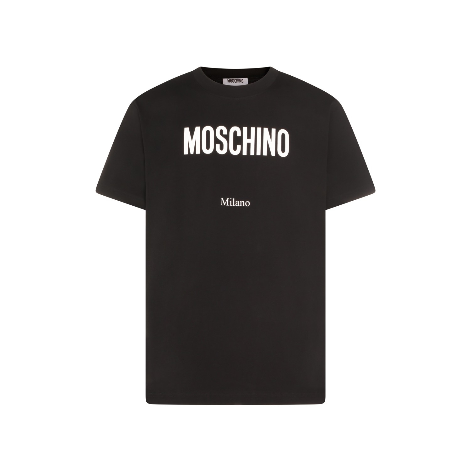 Black cotton t-shirt from Moschino featuring crew neck, short sleeves, frontal logo and regular vestibility.