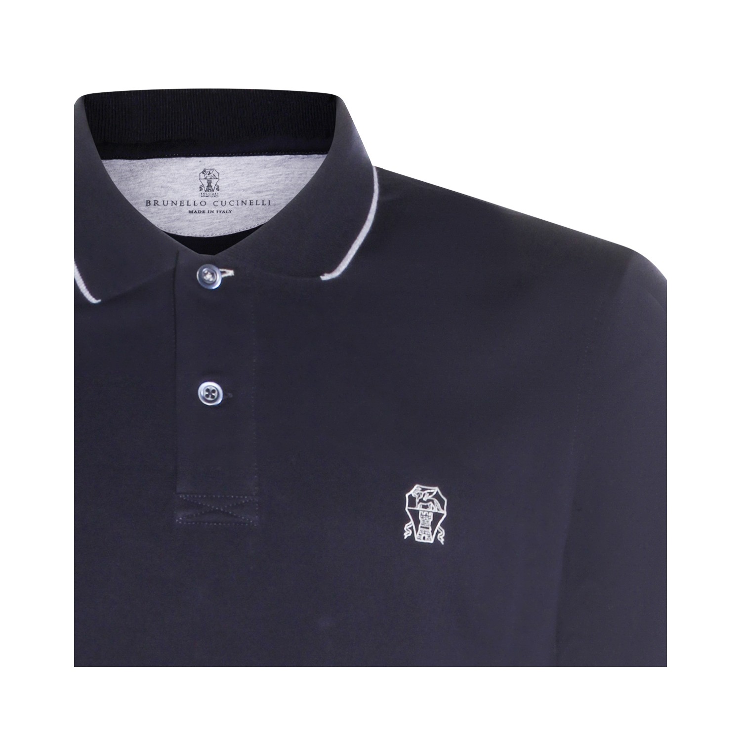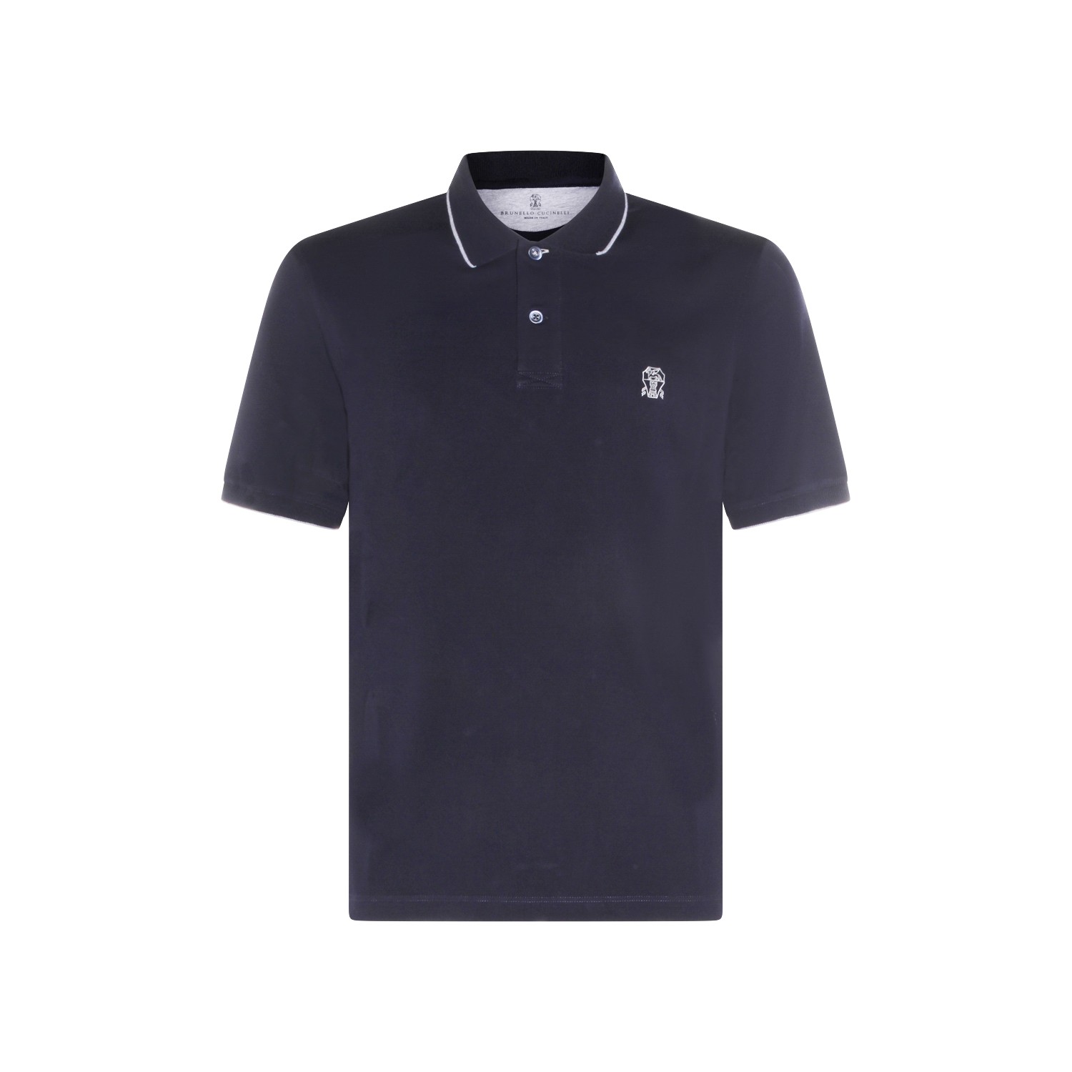 Navy cotton polo shirt from Brunello Cucinelli featuring regular collar, buttons fastening, short sleeves, frontal embroidered logo and regular vestibility.