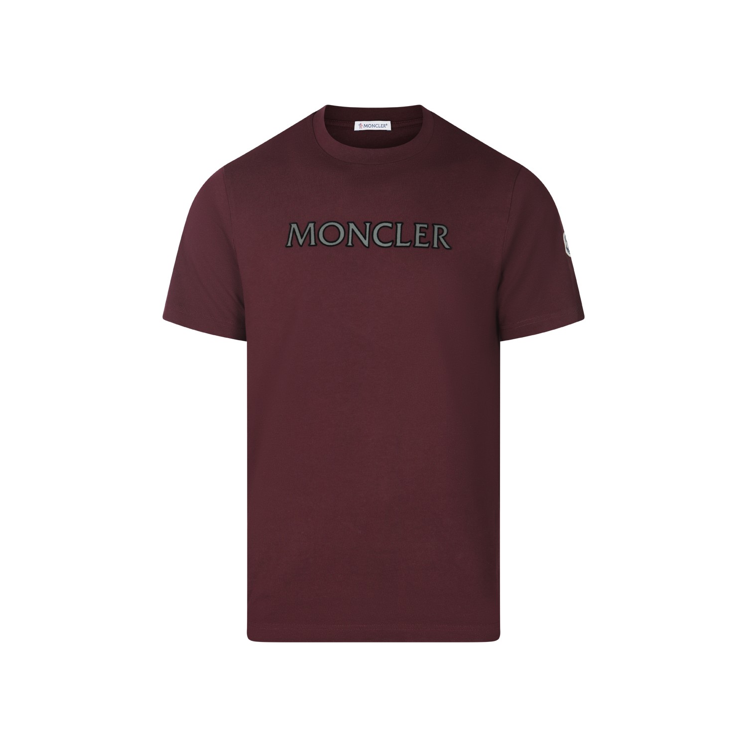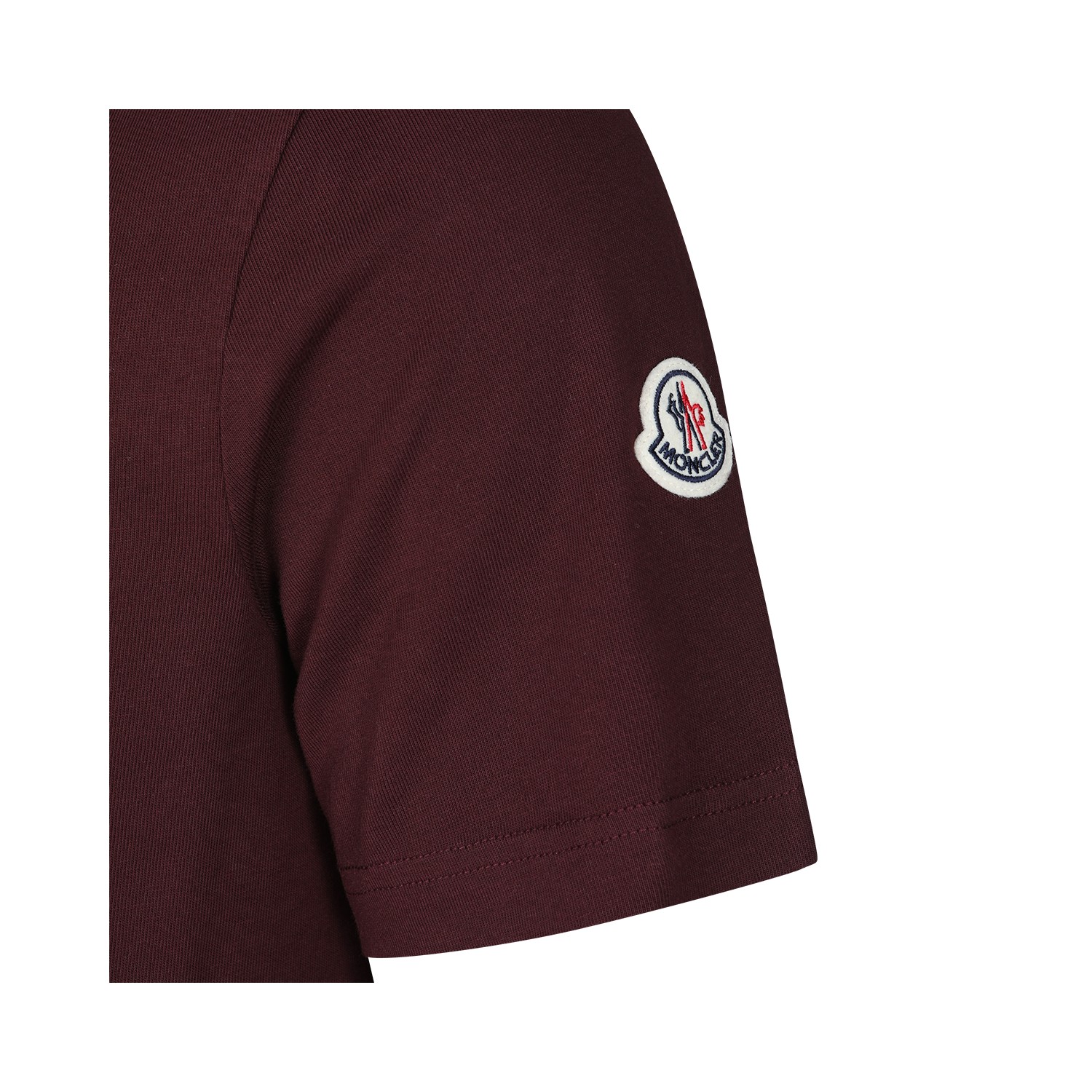 Bordeaux cotton t-shirt from Moncler featuring short sleeves, round collar, frontal logo, sleeve logo patch and regular vestibility.