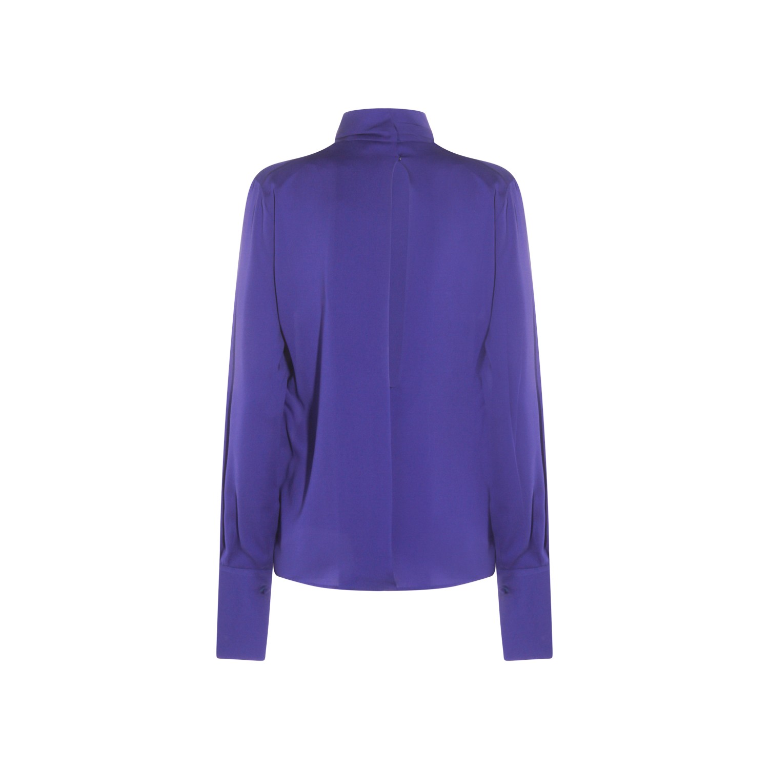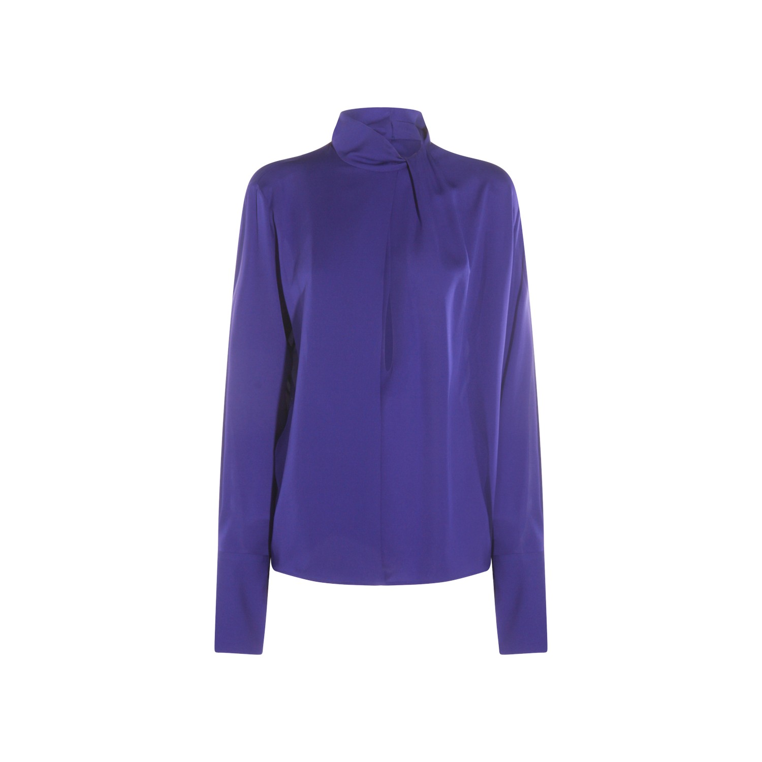 Blue silk top from Tom Ford featuring high collar with laces, long sleeves and soft vestibility.