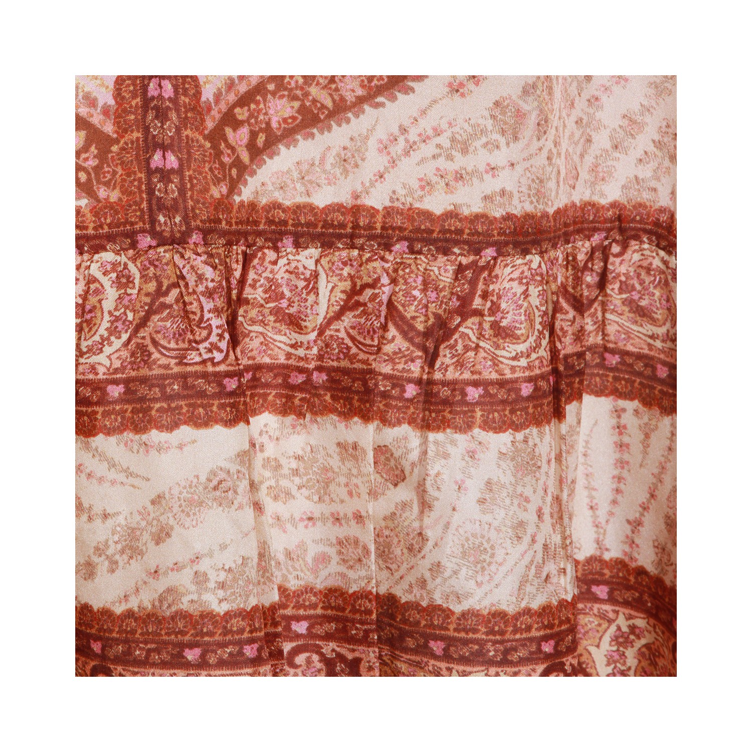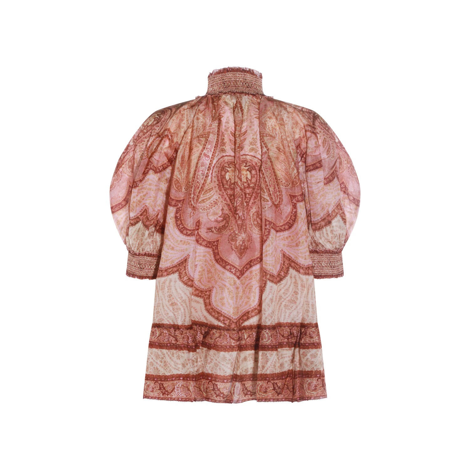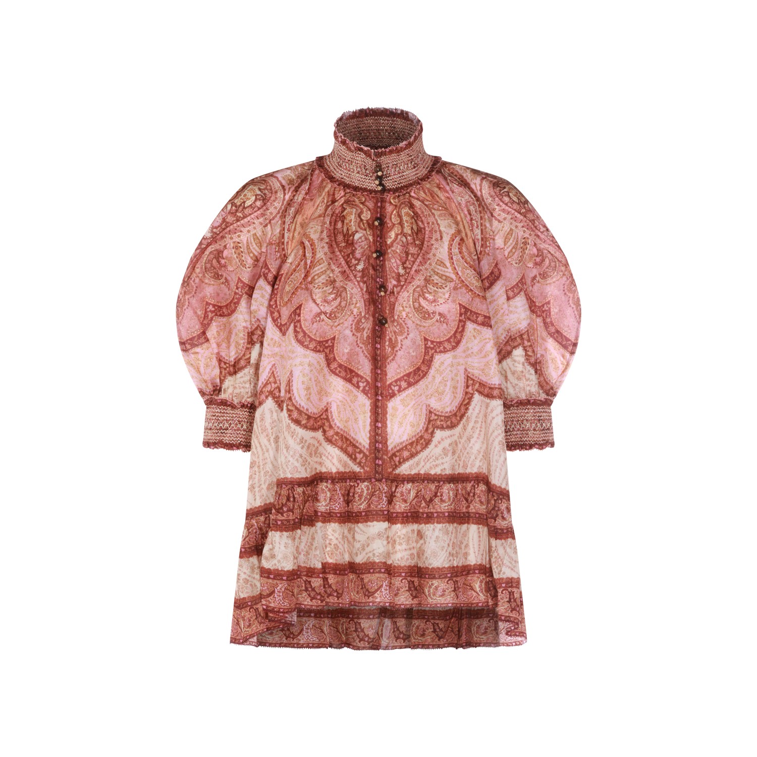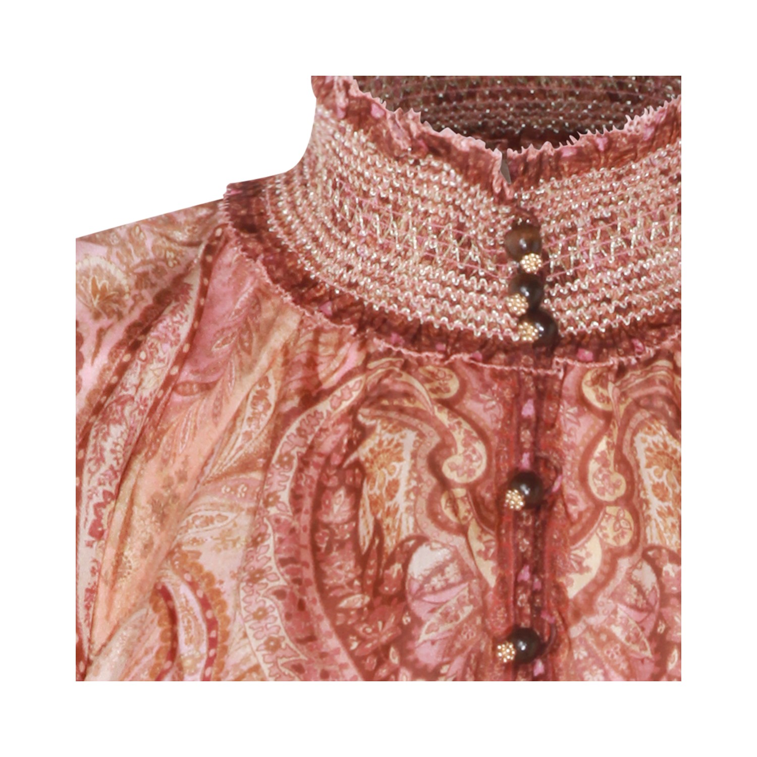 Burgundy silk top from Zimmermann featurig high collar, buttons fastening, midi length sleeves and oversize vestibility.