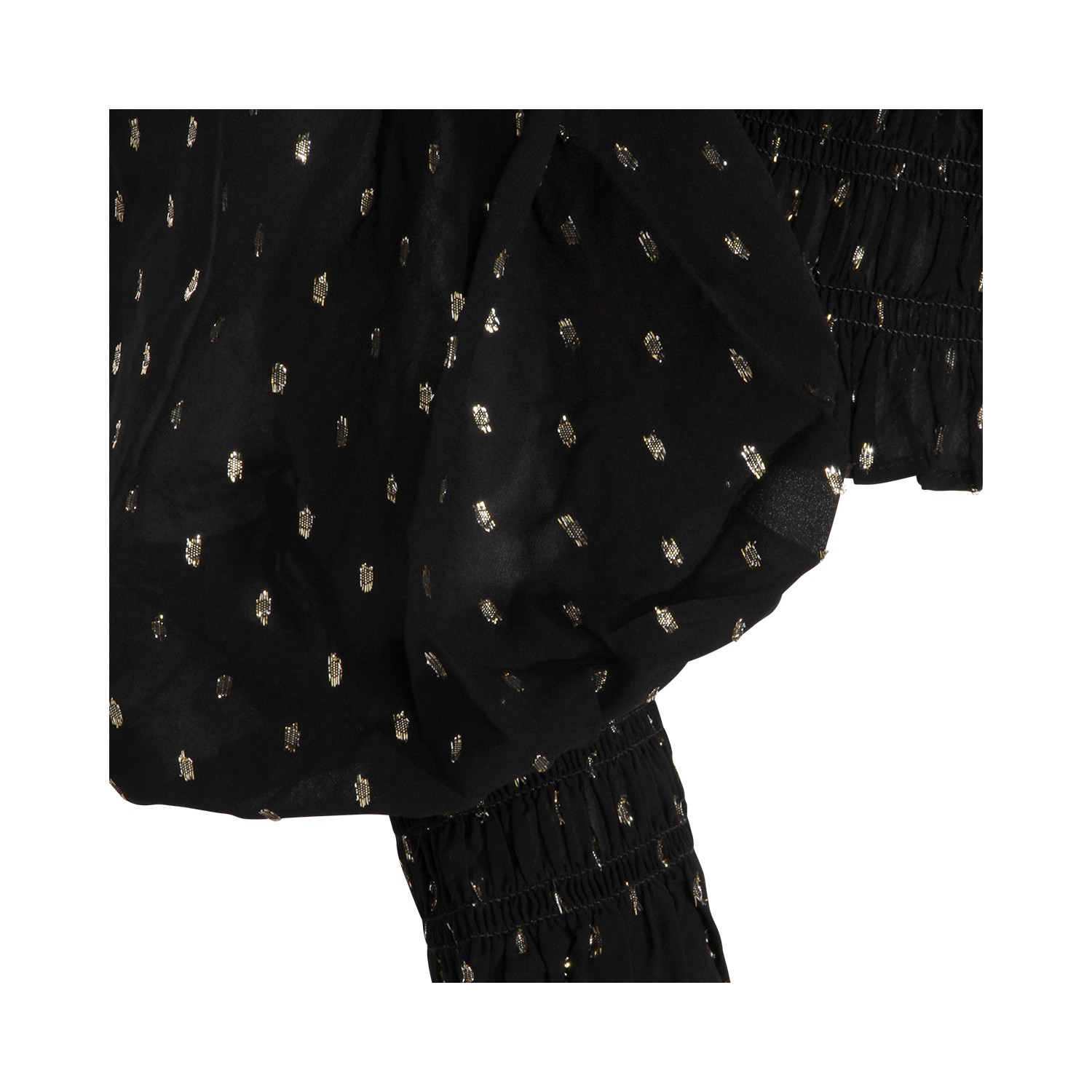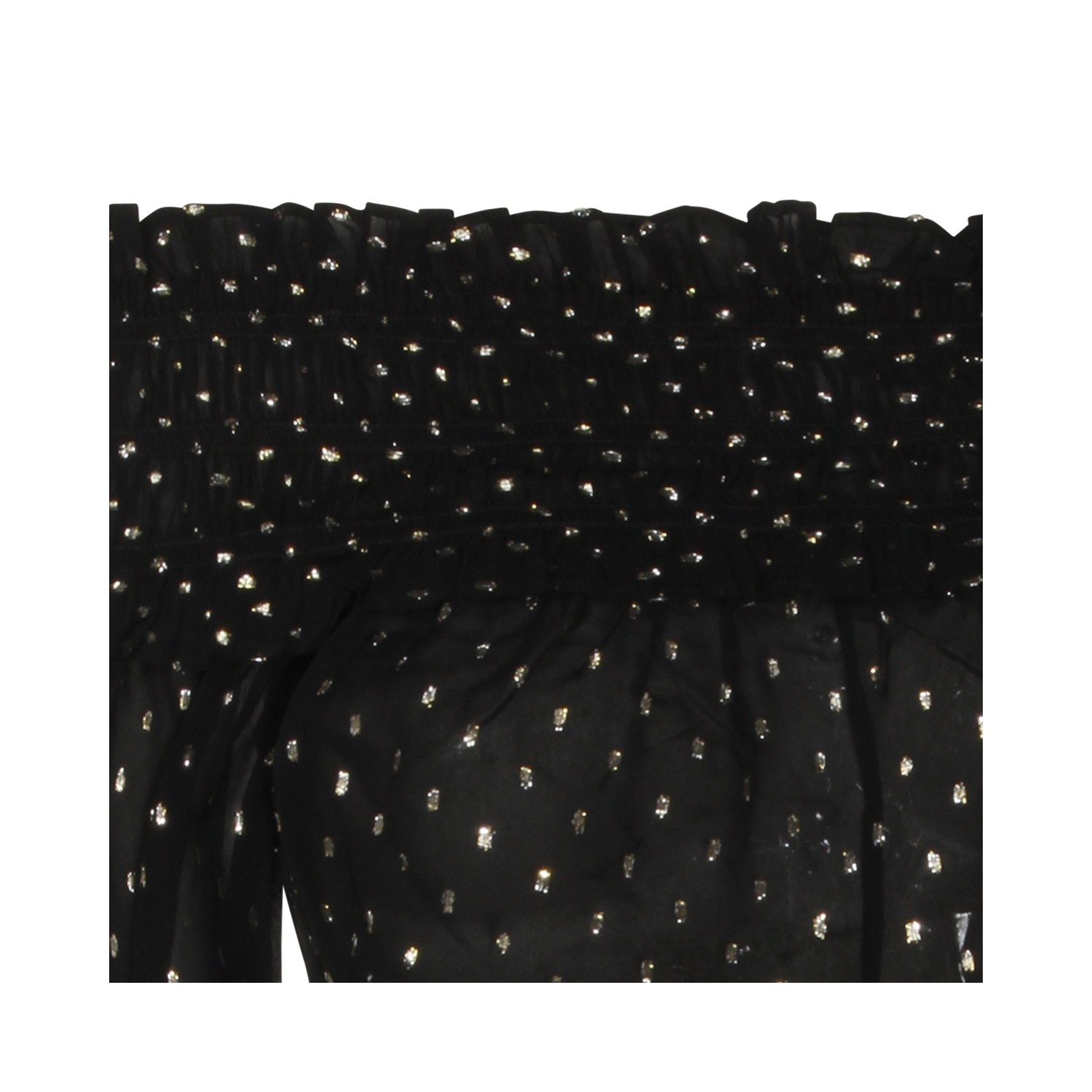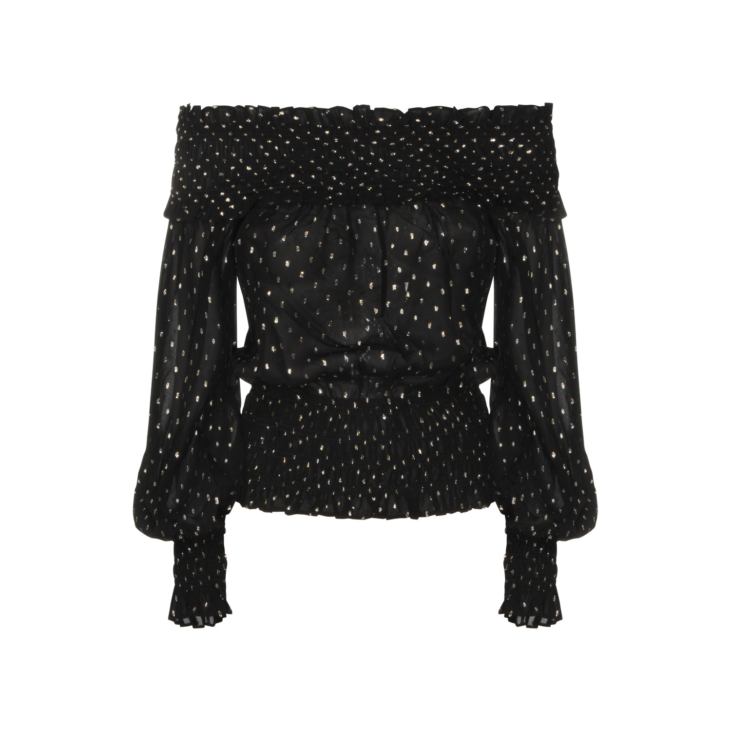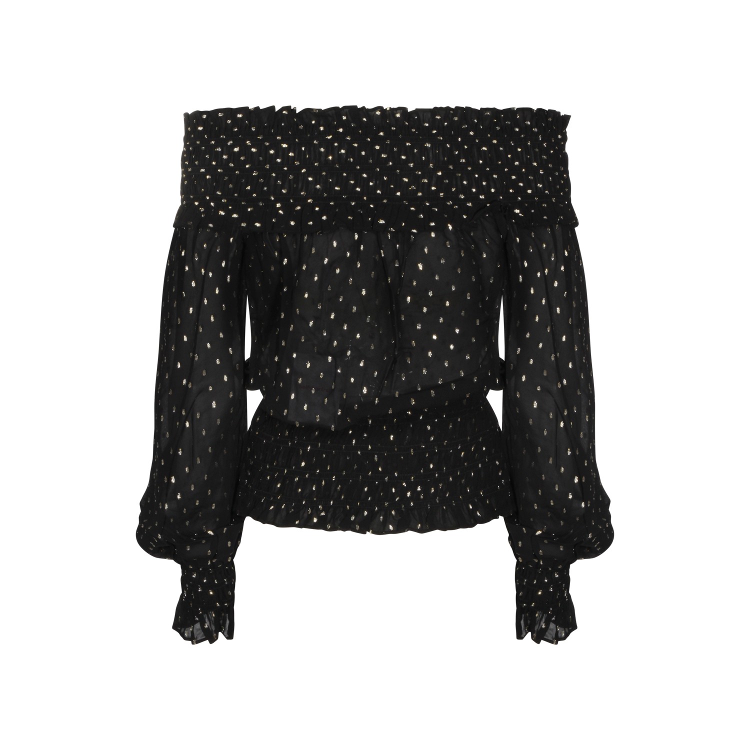 Black viscose top from Self-Portrait featuring off shoulder neck, long sleeves and all over gold details.