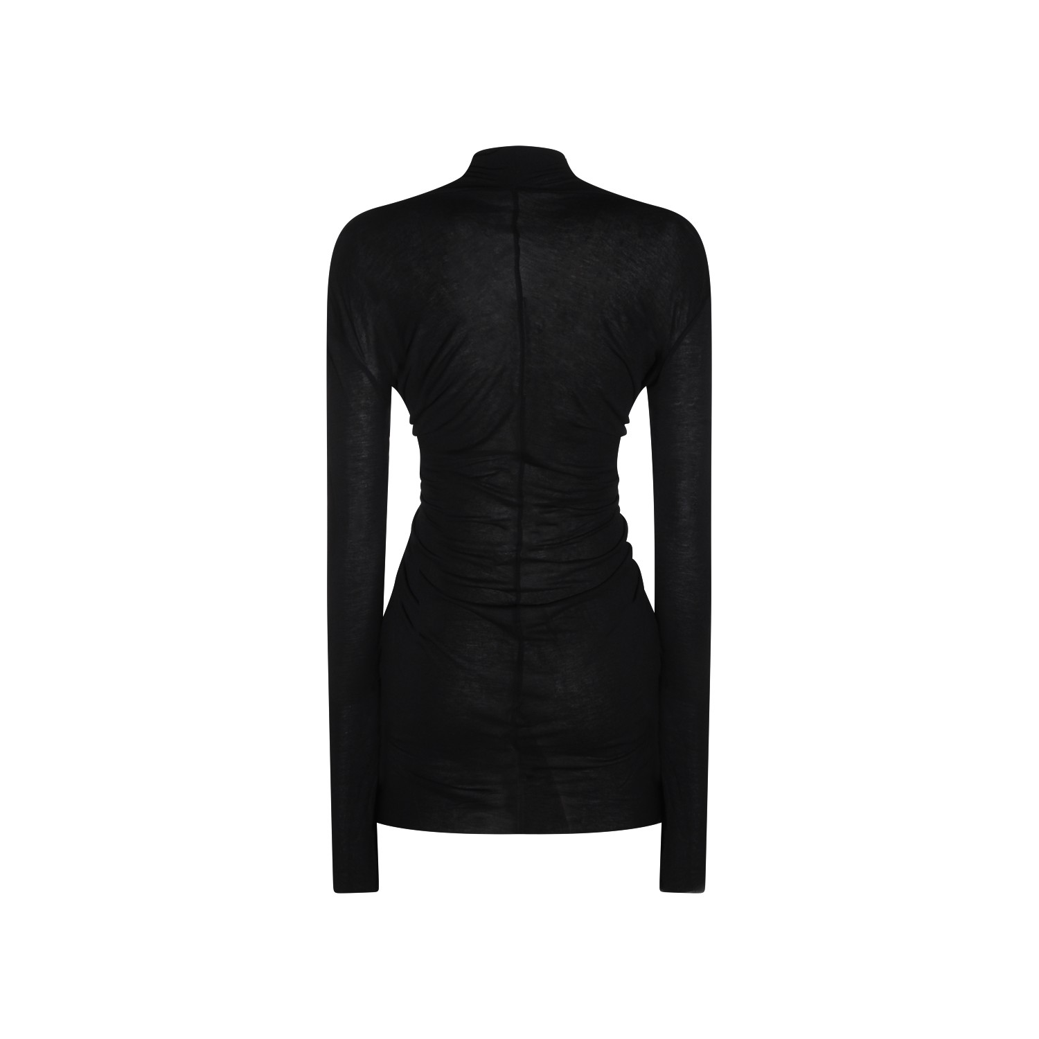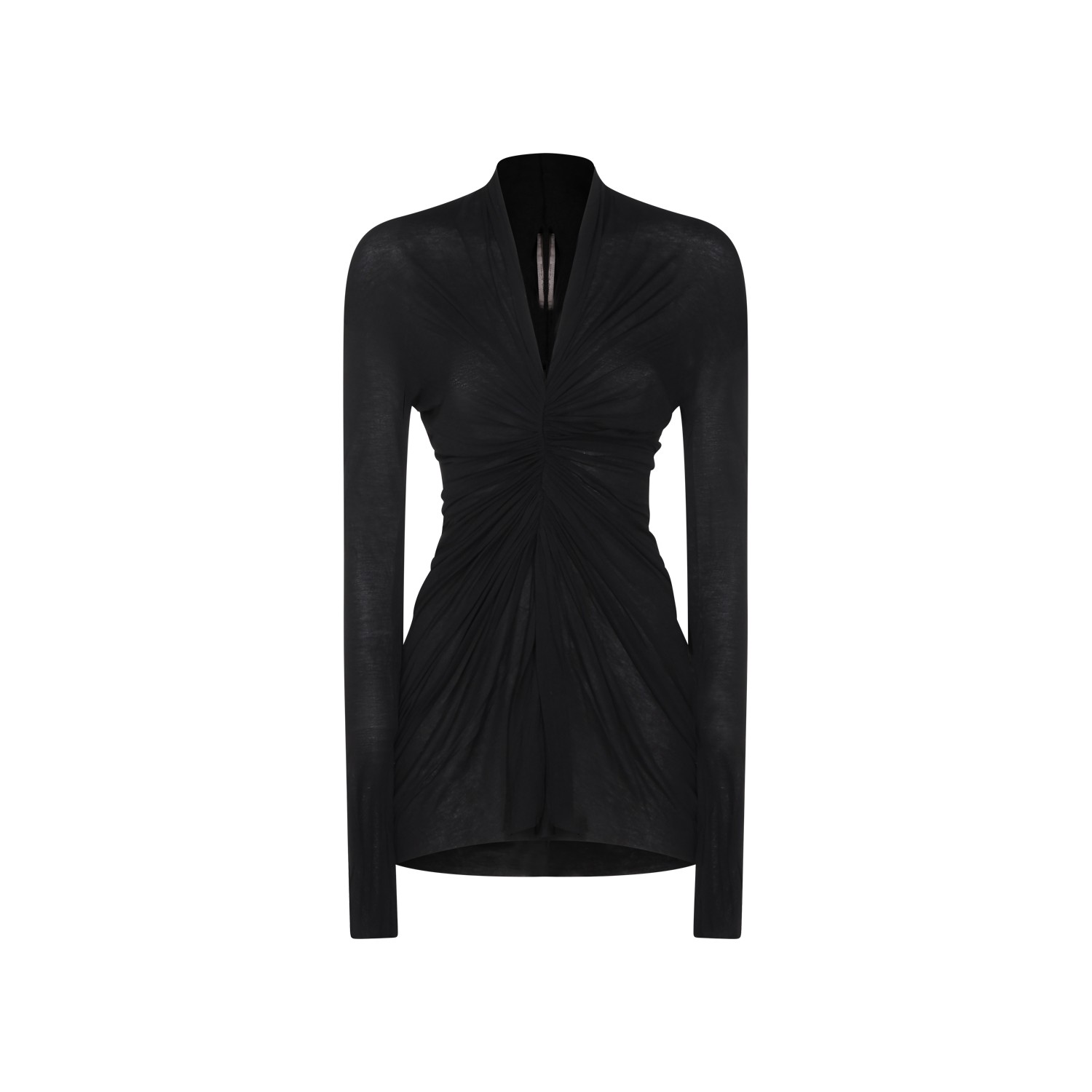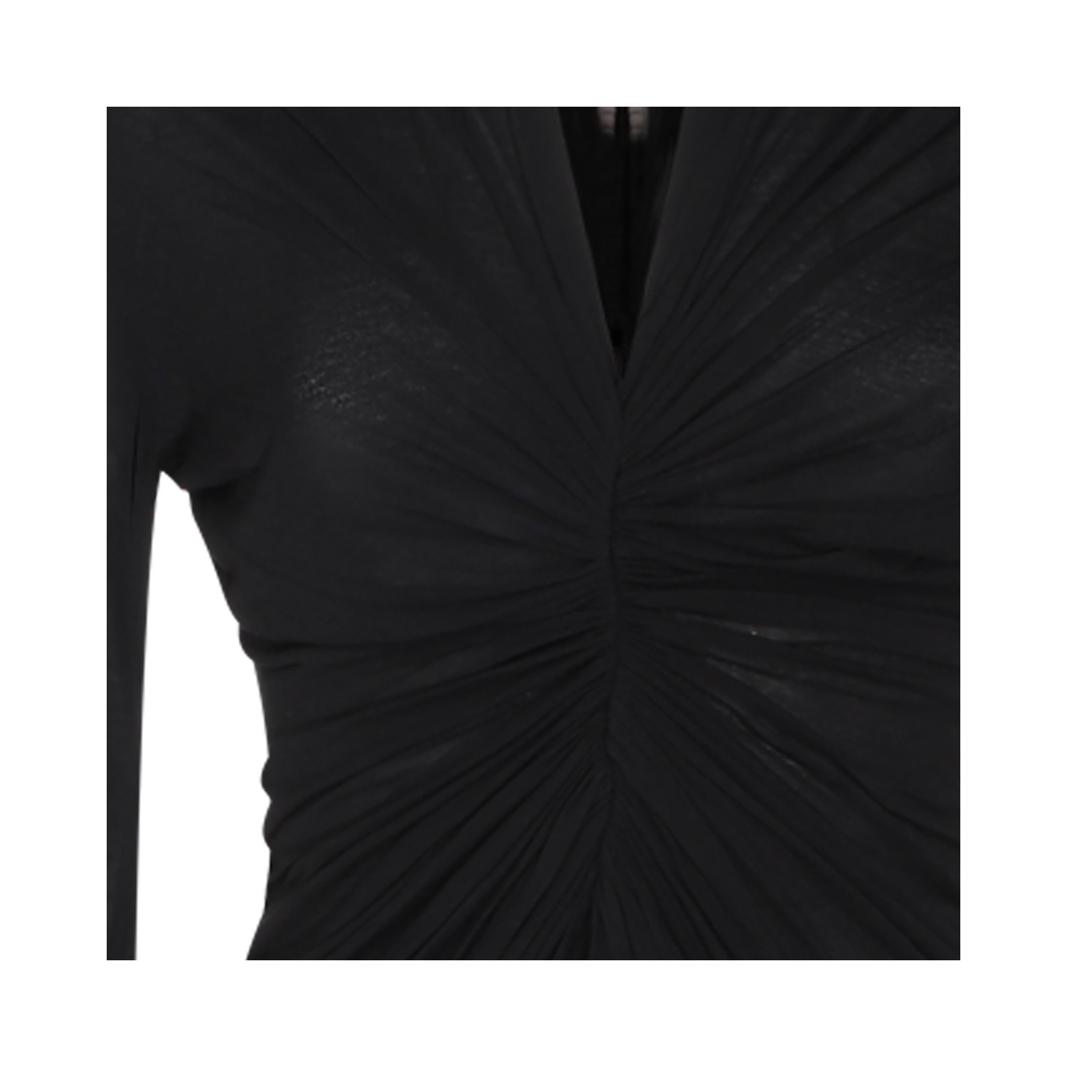 Black viscose top from Rick Owens featuring long sleeves, v neckline, frontal rouches and elasticizated vestibility.