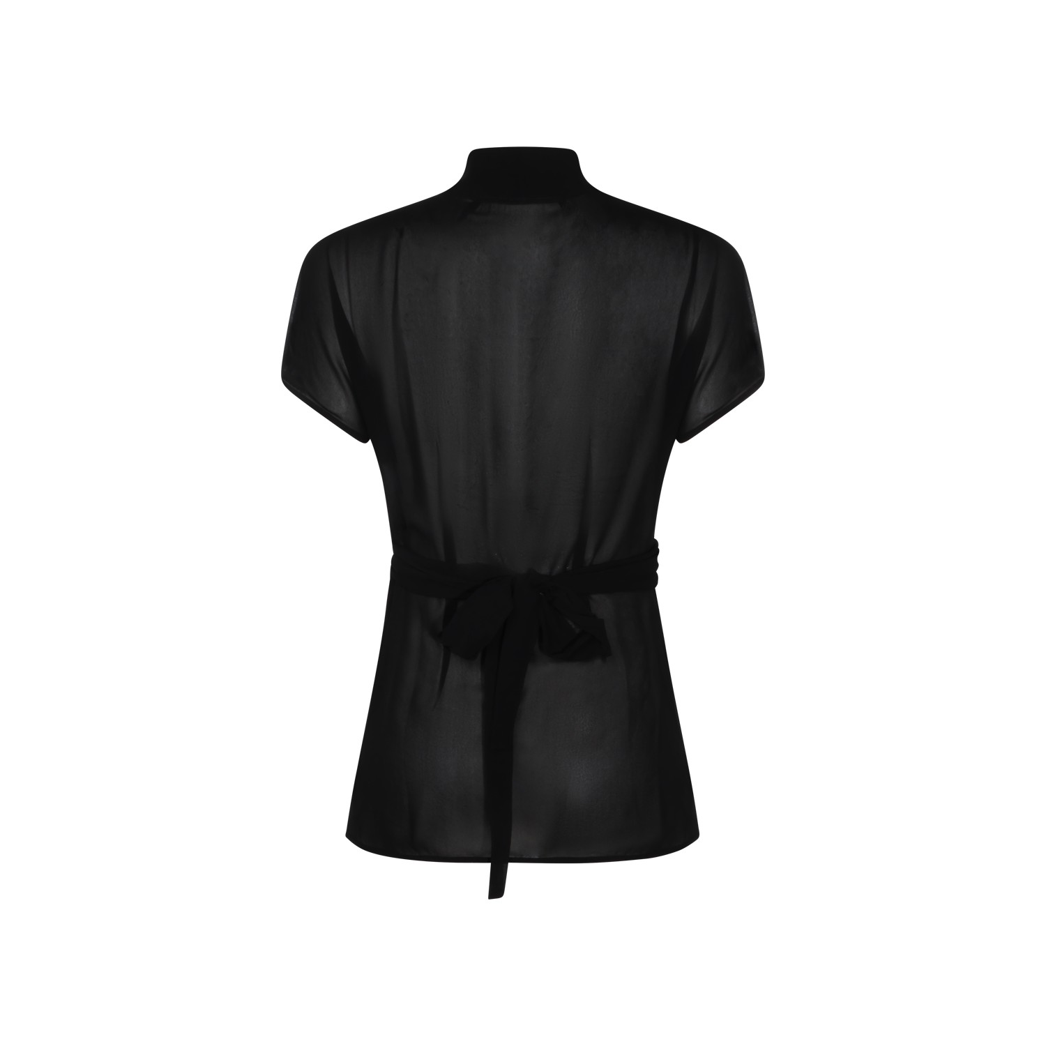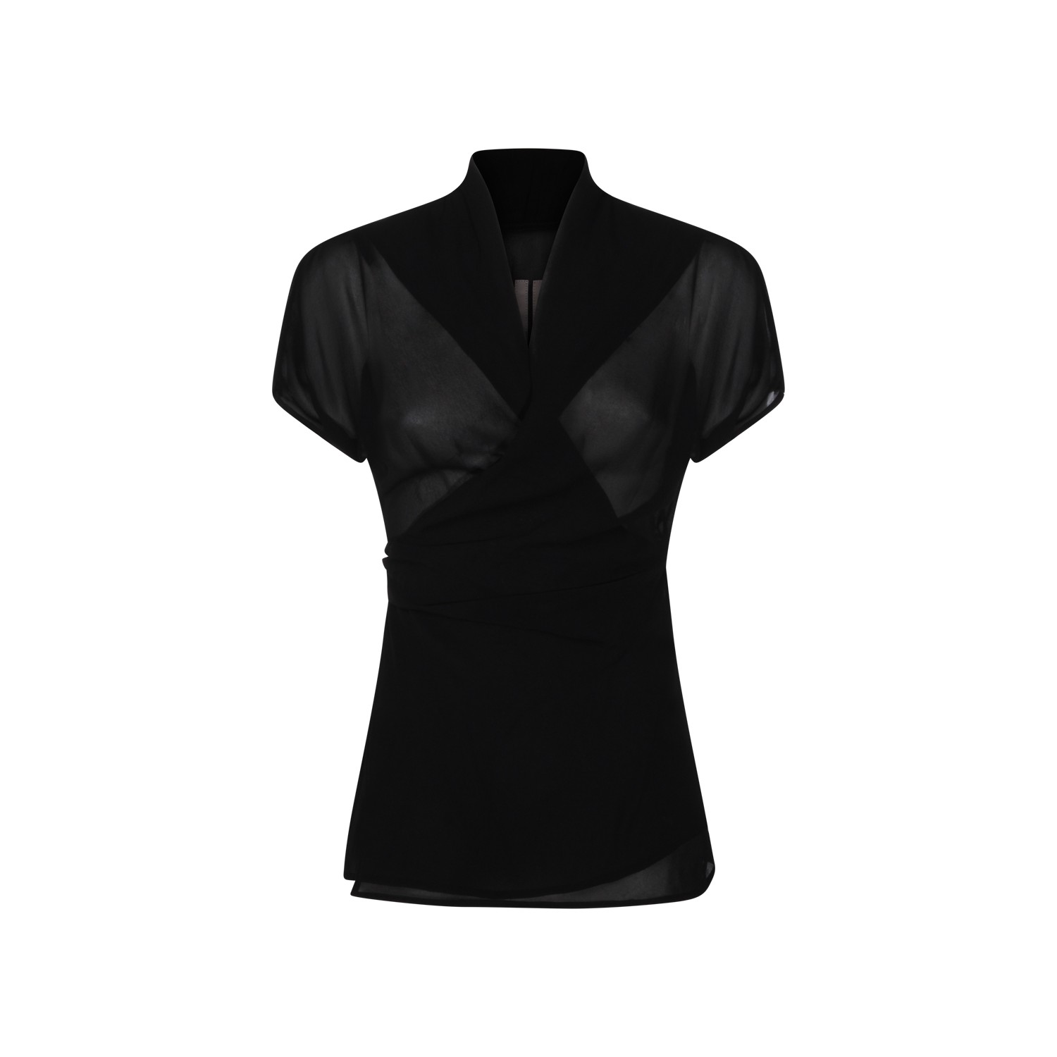 Black silk top from Rick Owens featuring high collar, V-neck, short sleeves, transparencies and slim vestibility.