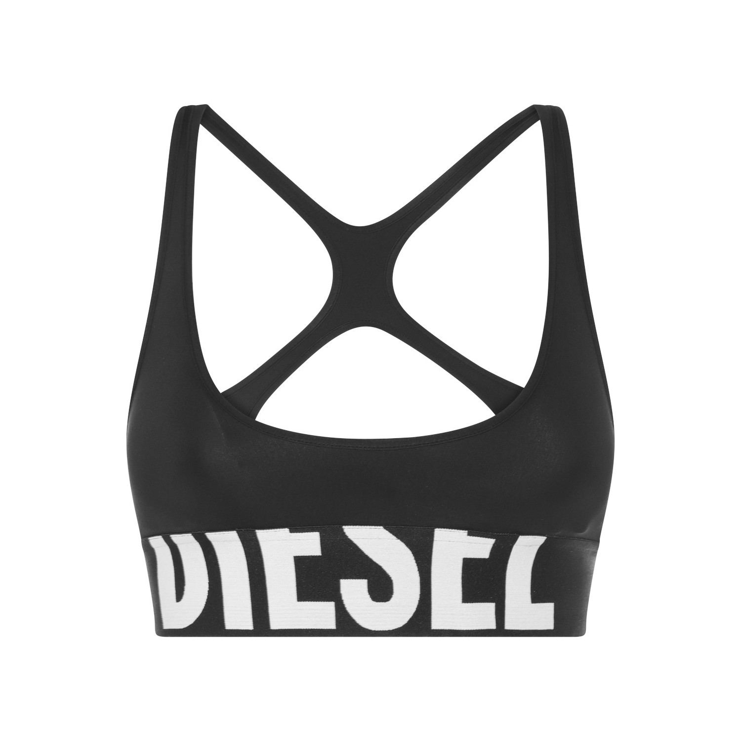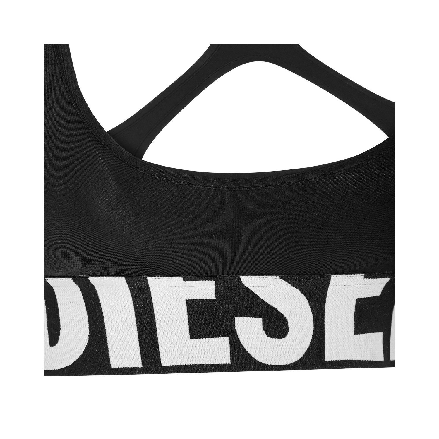 Black top from Diesel featuring round neck, sleeveless, cut out back and frontal logo.