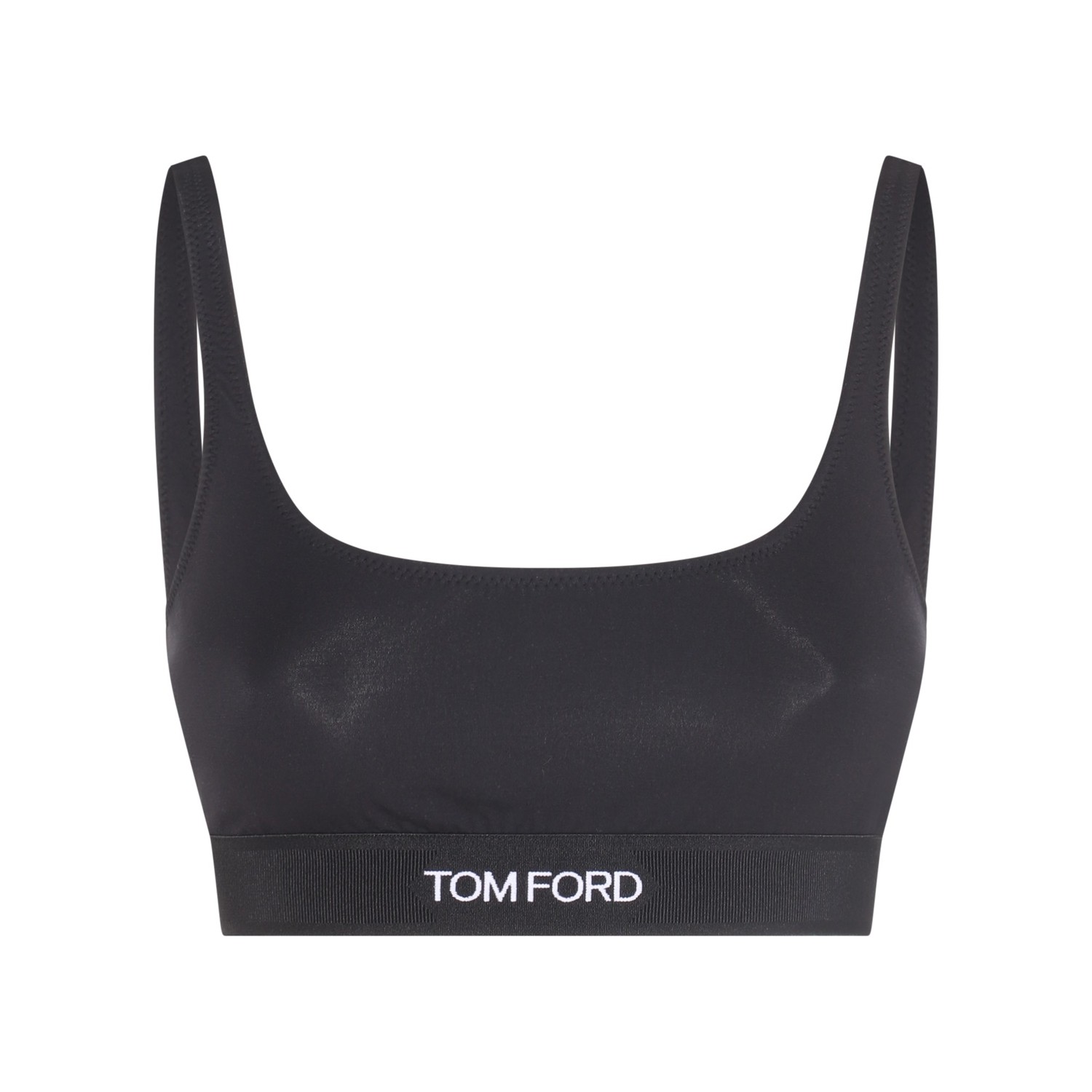 Black modal top from Tom Ford featuring wide neckline, shoulder straps and elastic waistband with logo.