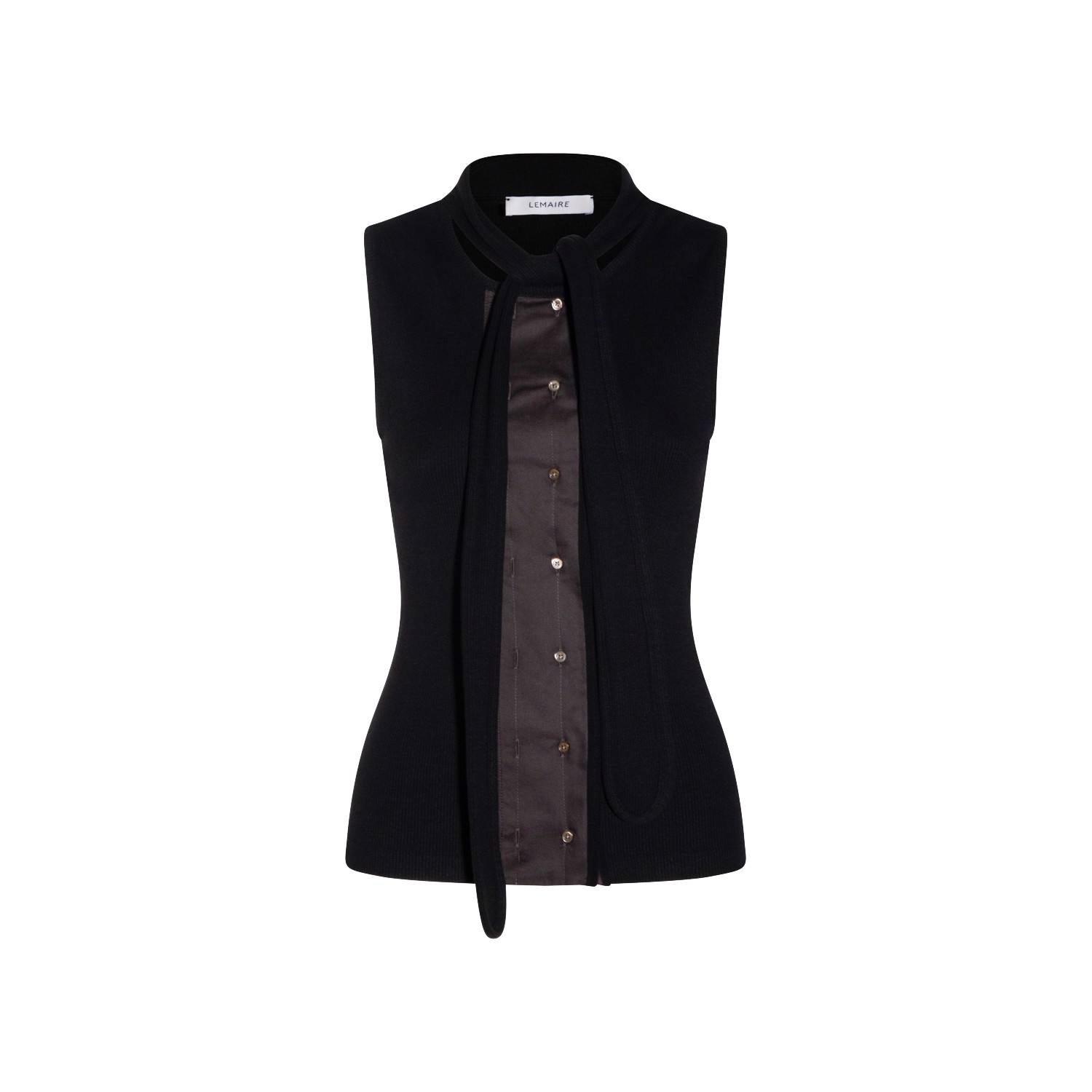 Black cotton top from Lemaire featuring crew neck, scarf, sleeveless, double buttoning placket with buttons, stitching details and regular vestibility.