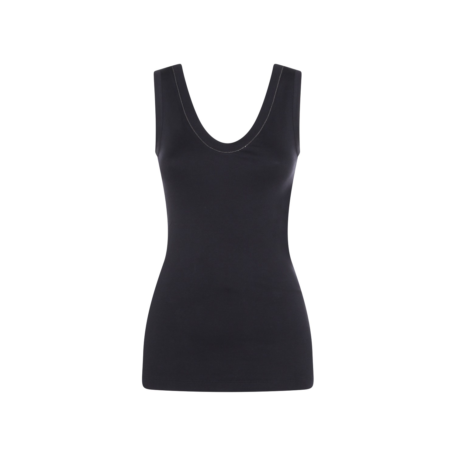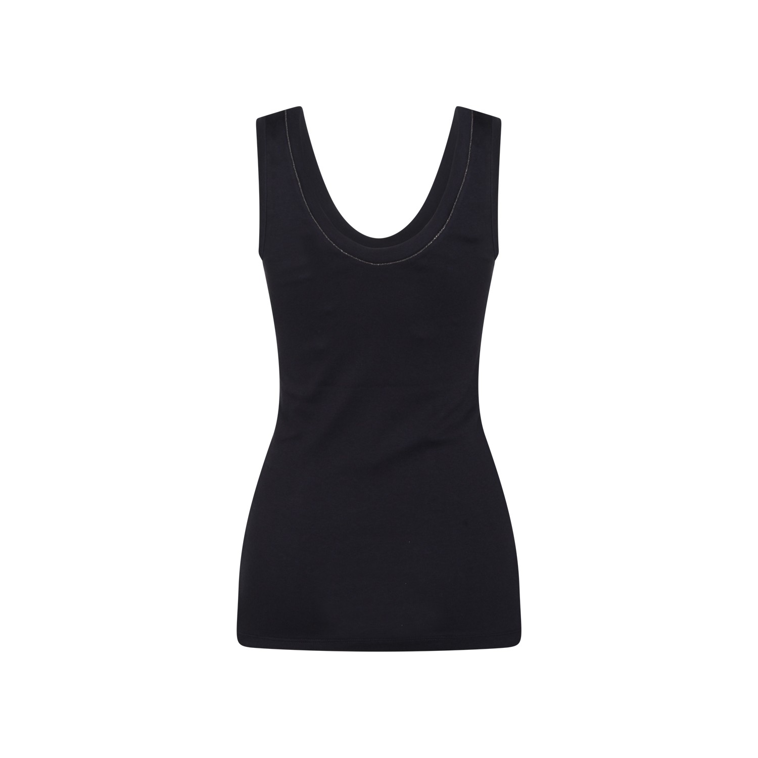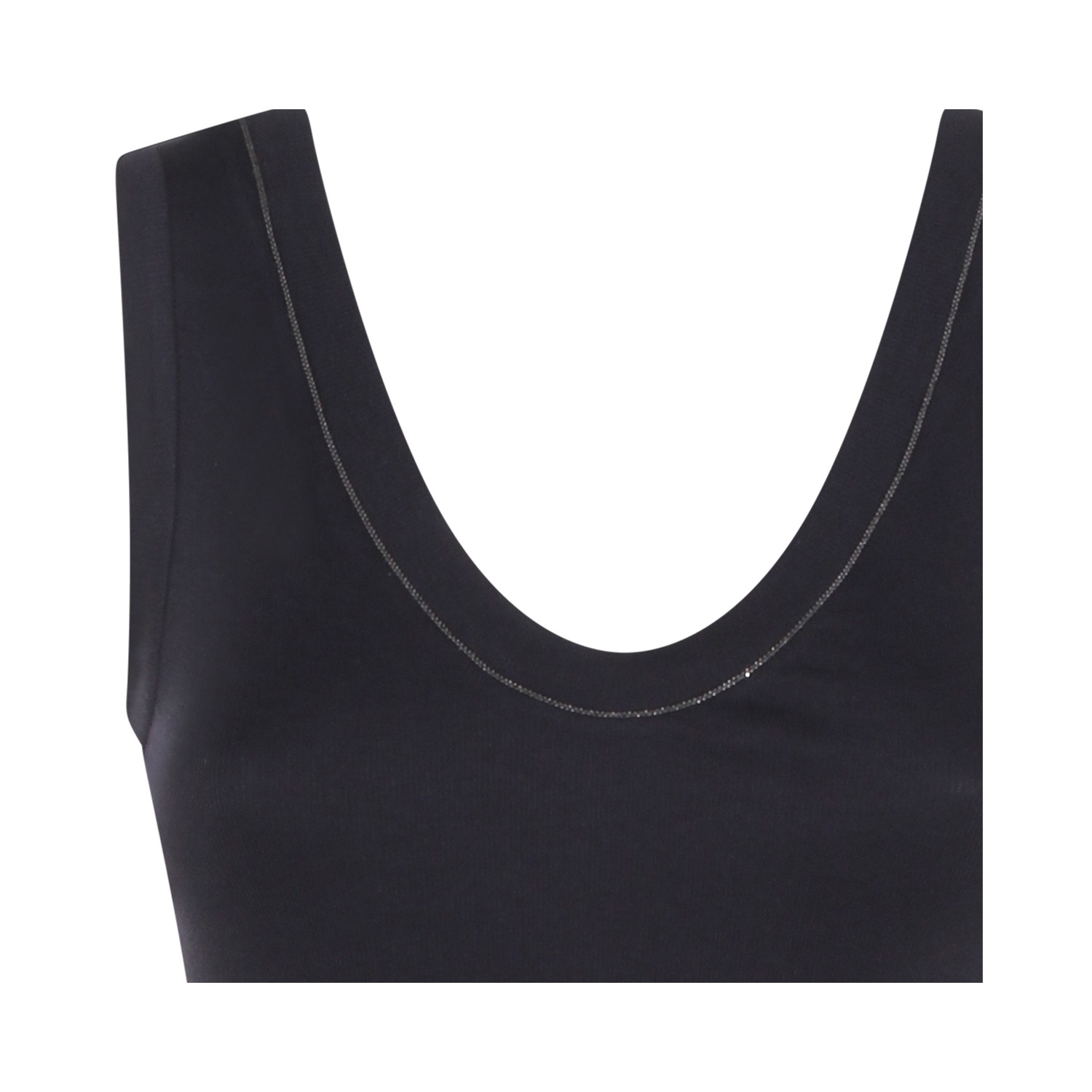 Dark blue cotton top from Brunello Cucinelli featuring round deep collar, sleeveless, wide straps and regular vestibility.