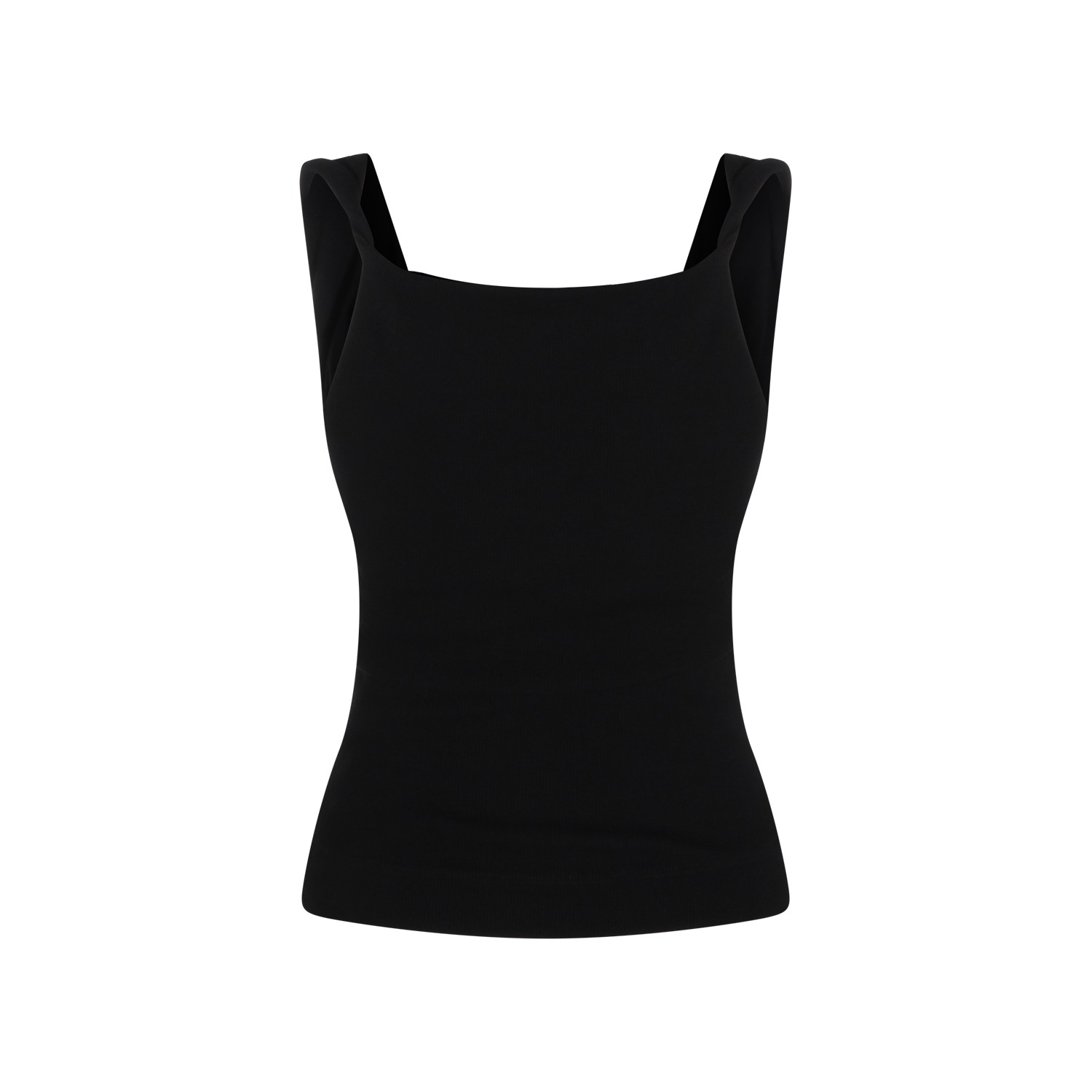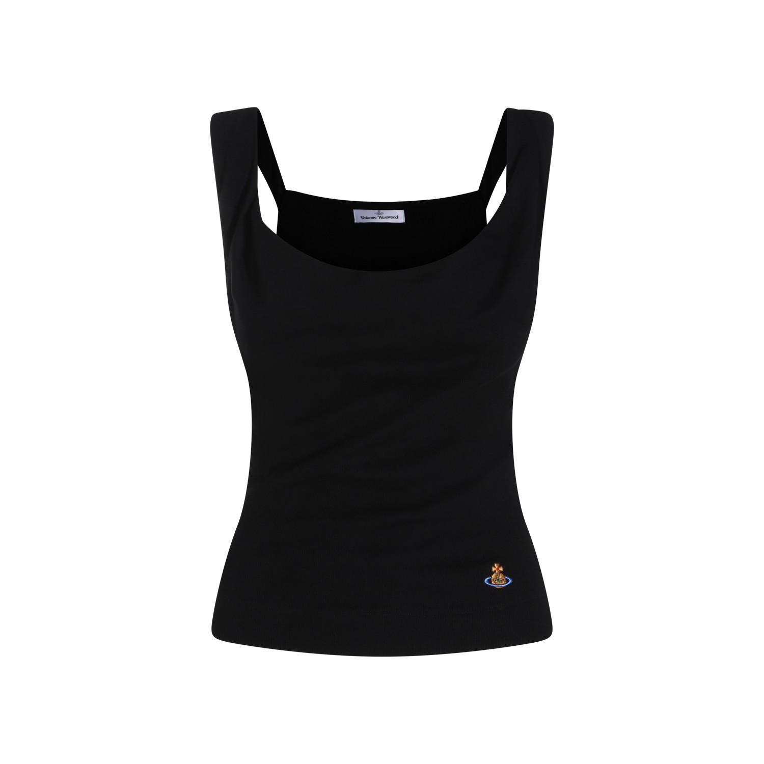 Black cotton top from Vivienne Westwood featuring round wide collar, sleeveless, mid straps, logo and regular fit.