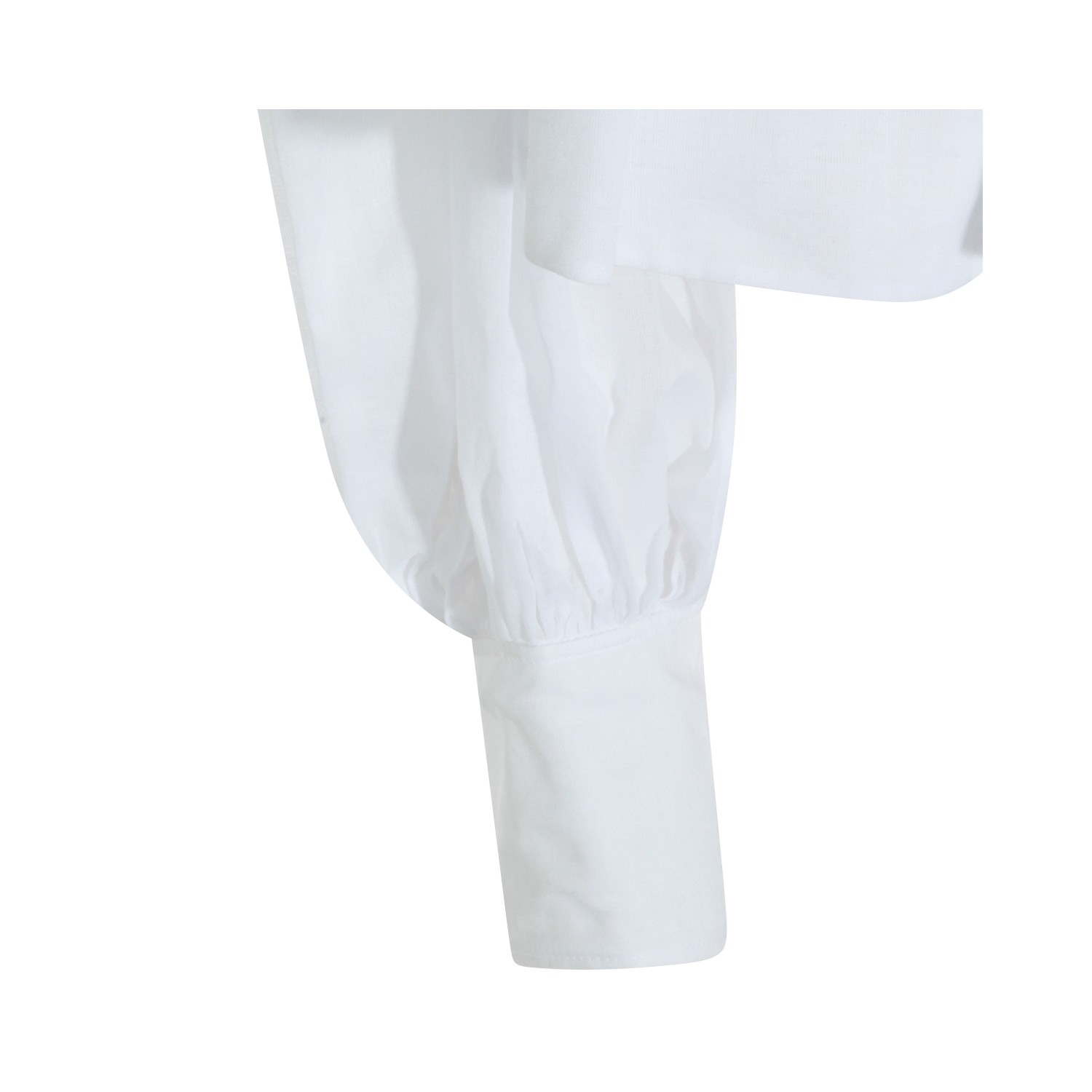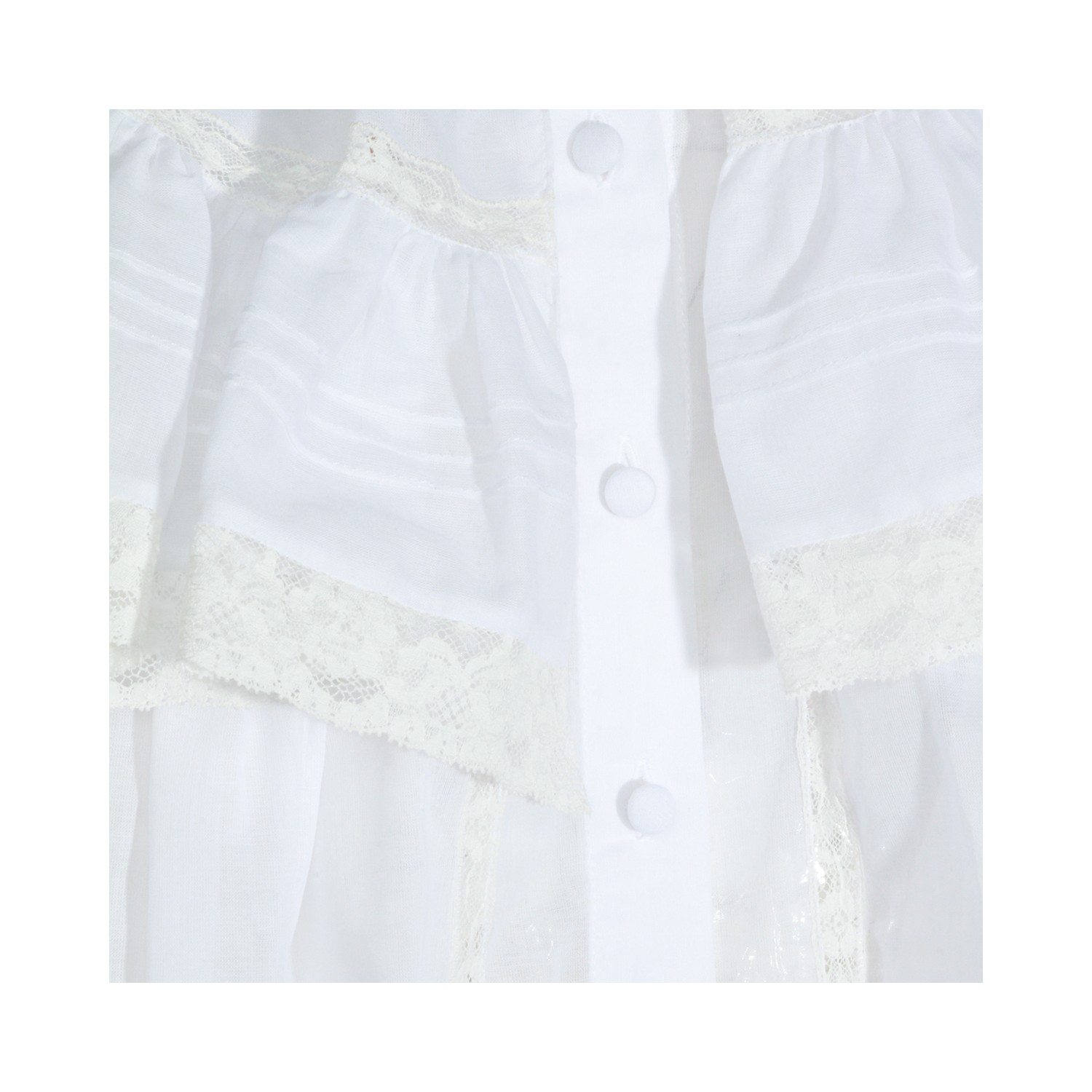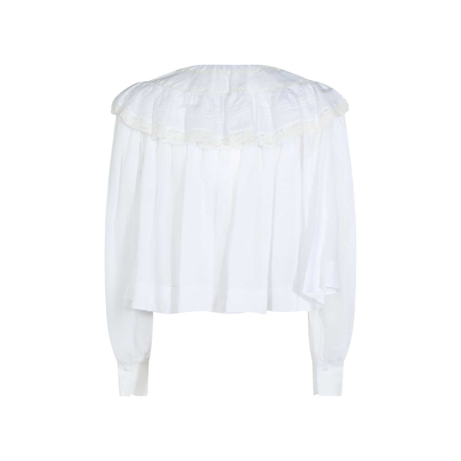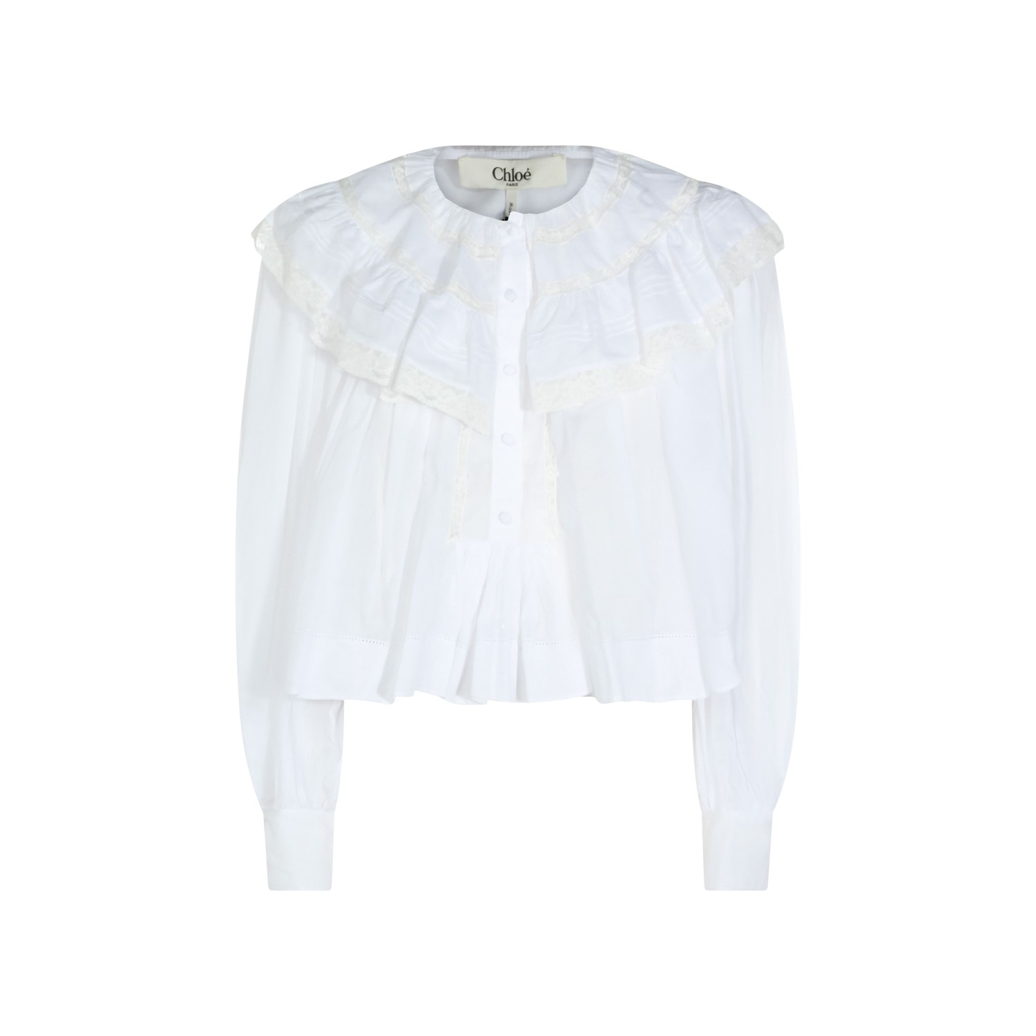 White silk top from Chlofeaturing round collar, long sleeves, ruffles, buttoned cuffs, lace details and cropped.
