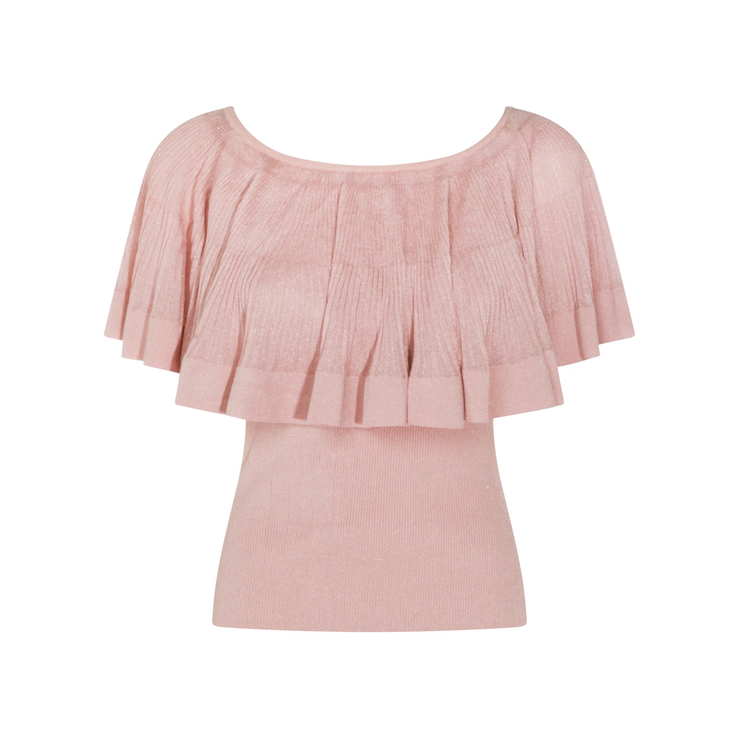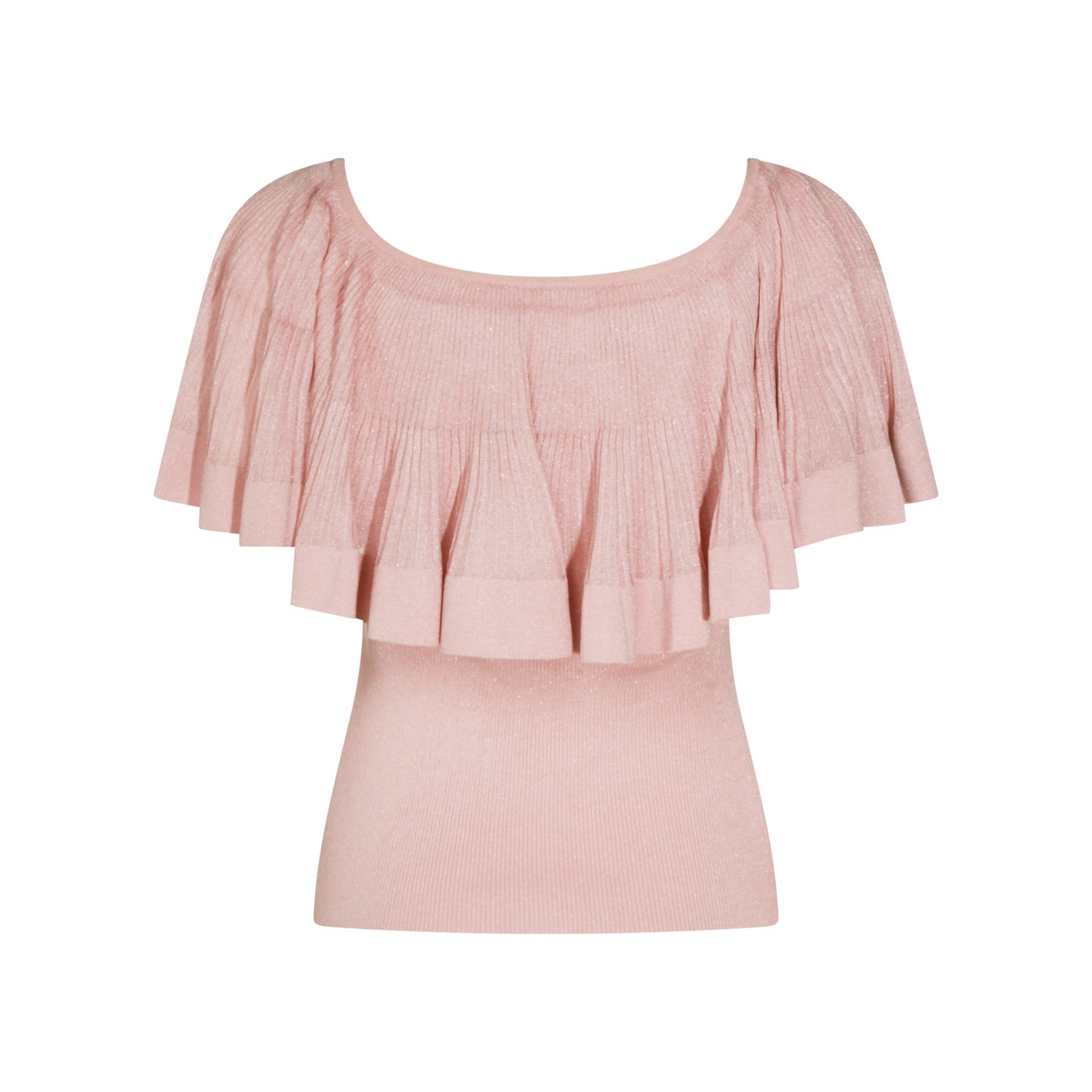 Pink viscose top from Zimmermann featuring wide rounded collar, short sleeves, ruffles and tight fit.