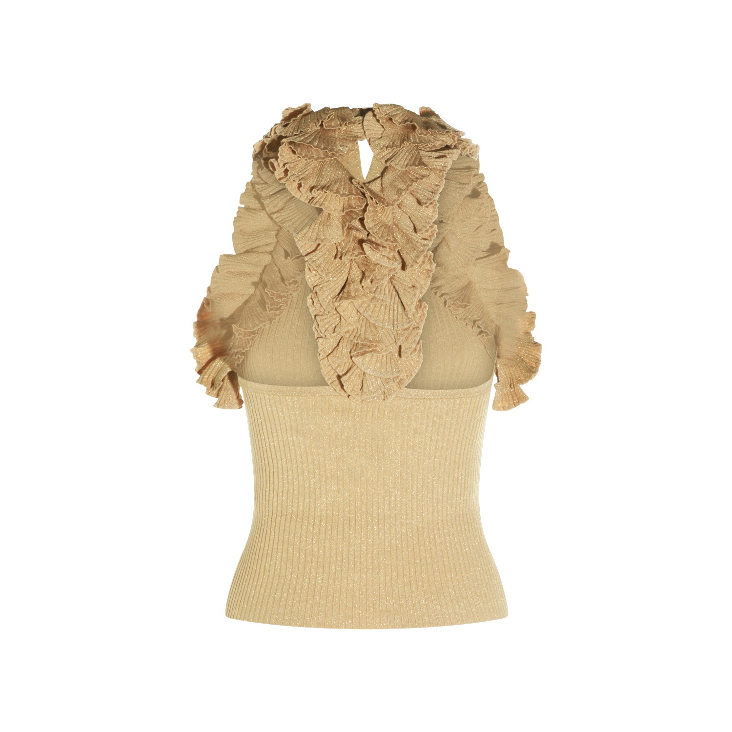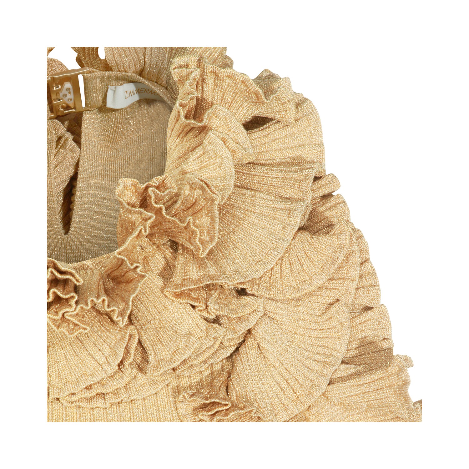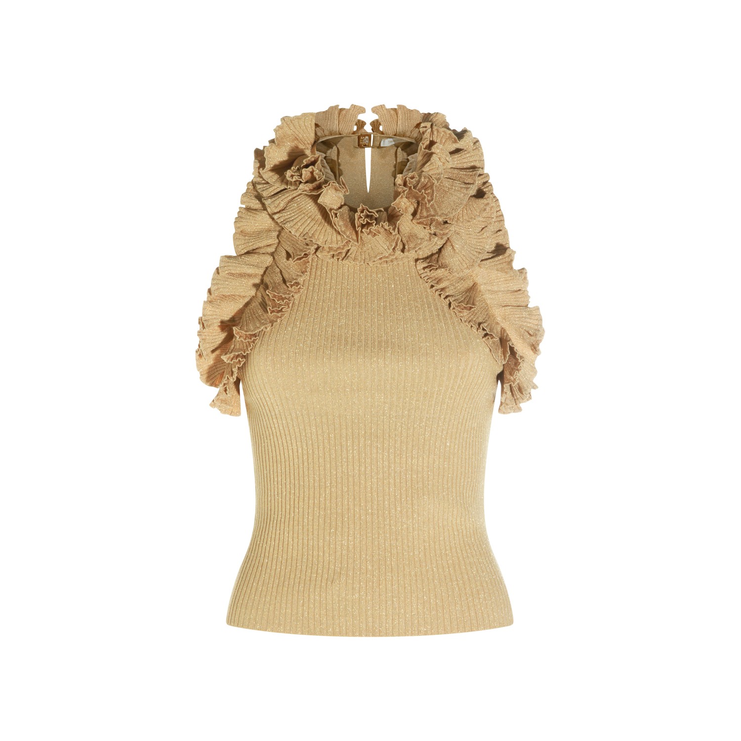 Gold viscose top from Zimmermann featuring round collar, sleeveless, ruffles and tight fit.