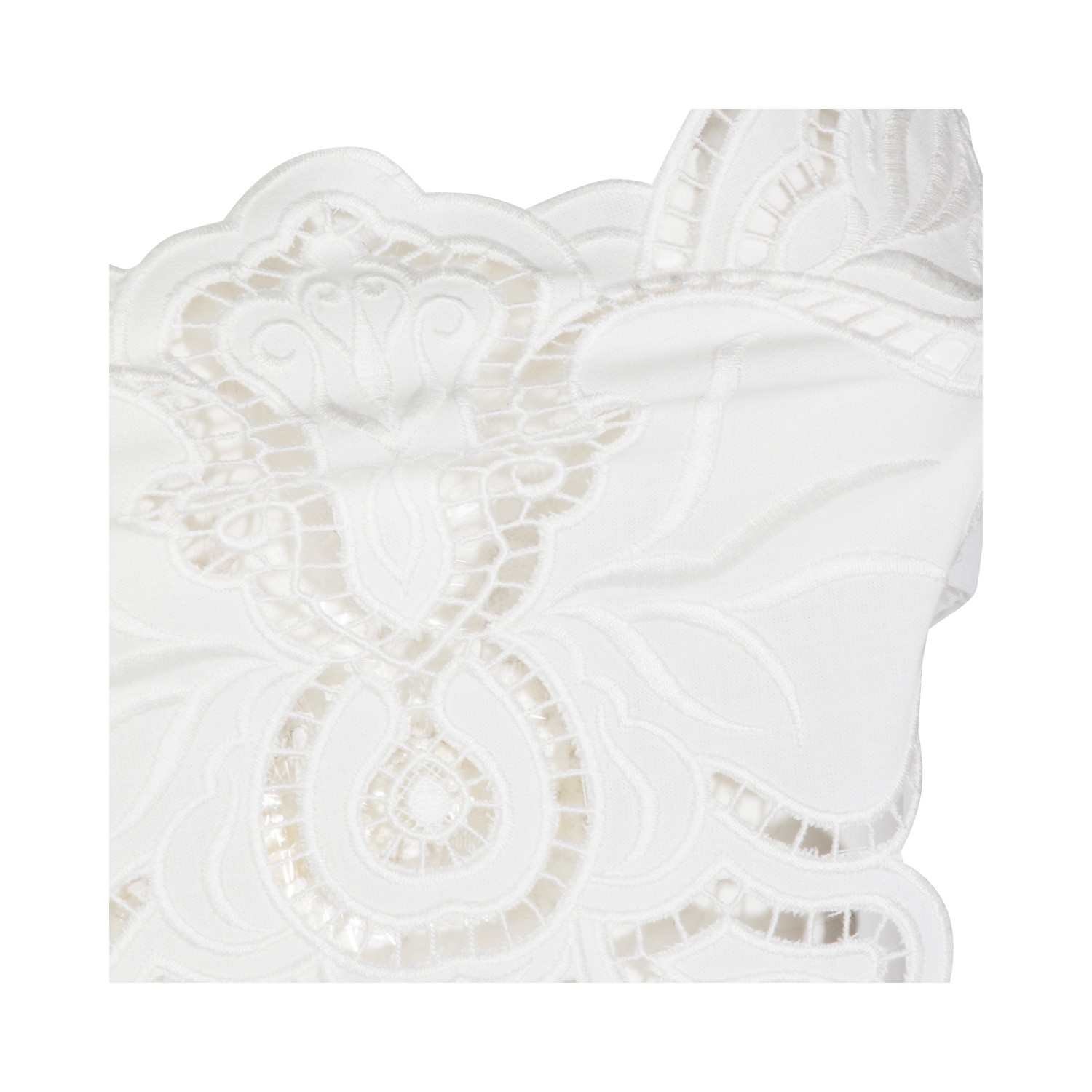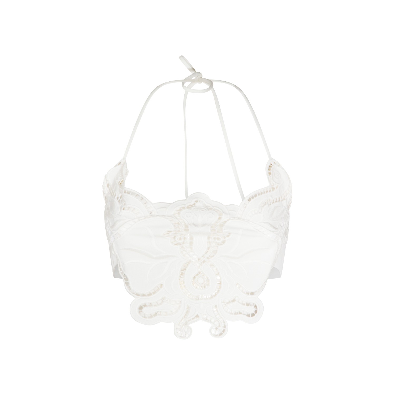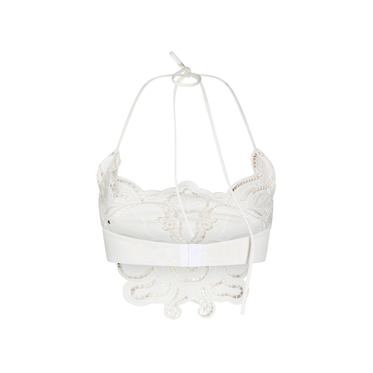 White pearl floreal top from Blumarine featuring cropped line, lace details and thin lace closure at back.