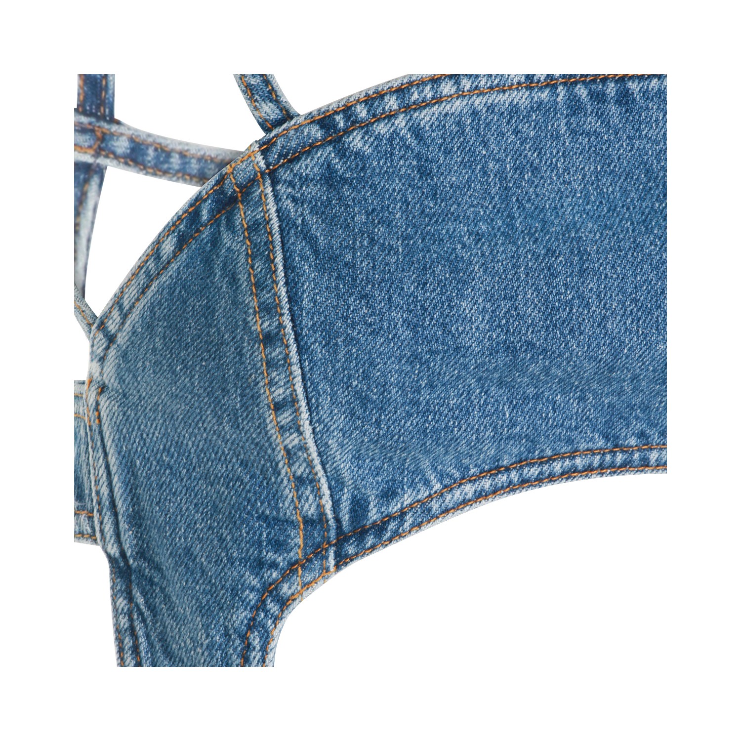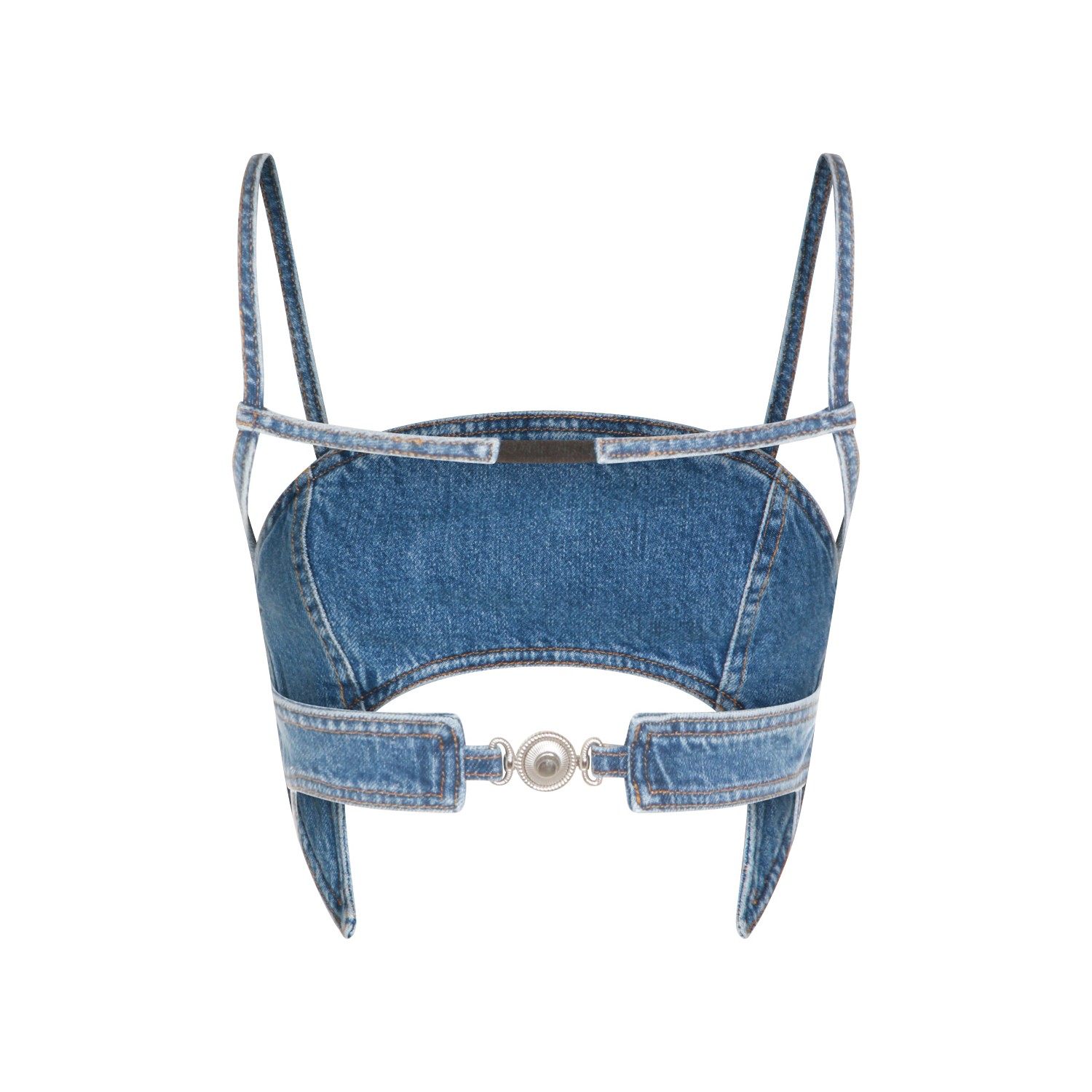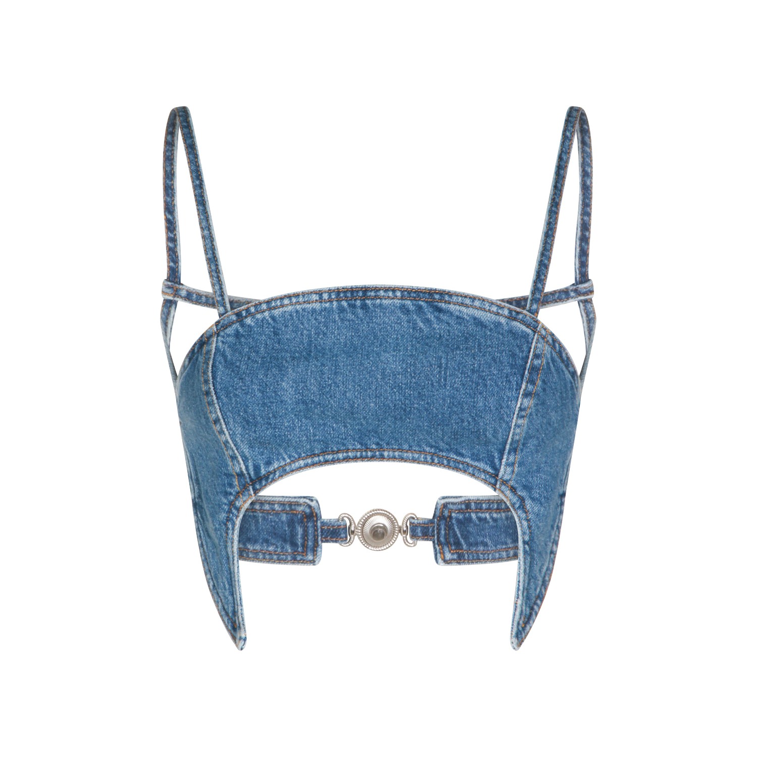 Light blue cotton top from Marine Serre featuring moon shape, square neck, thin straps, open back and cropped.