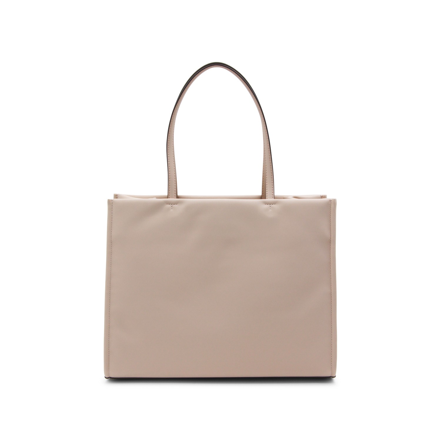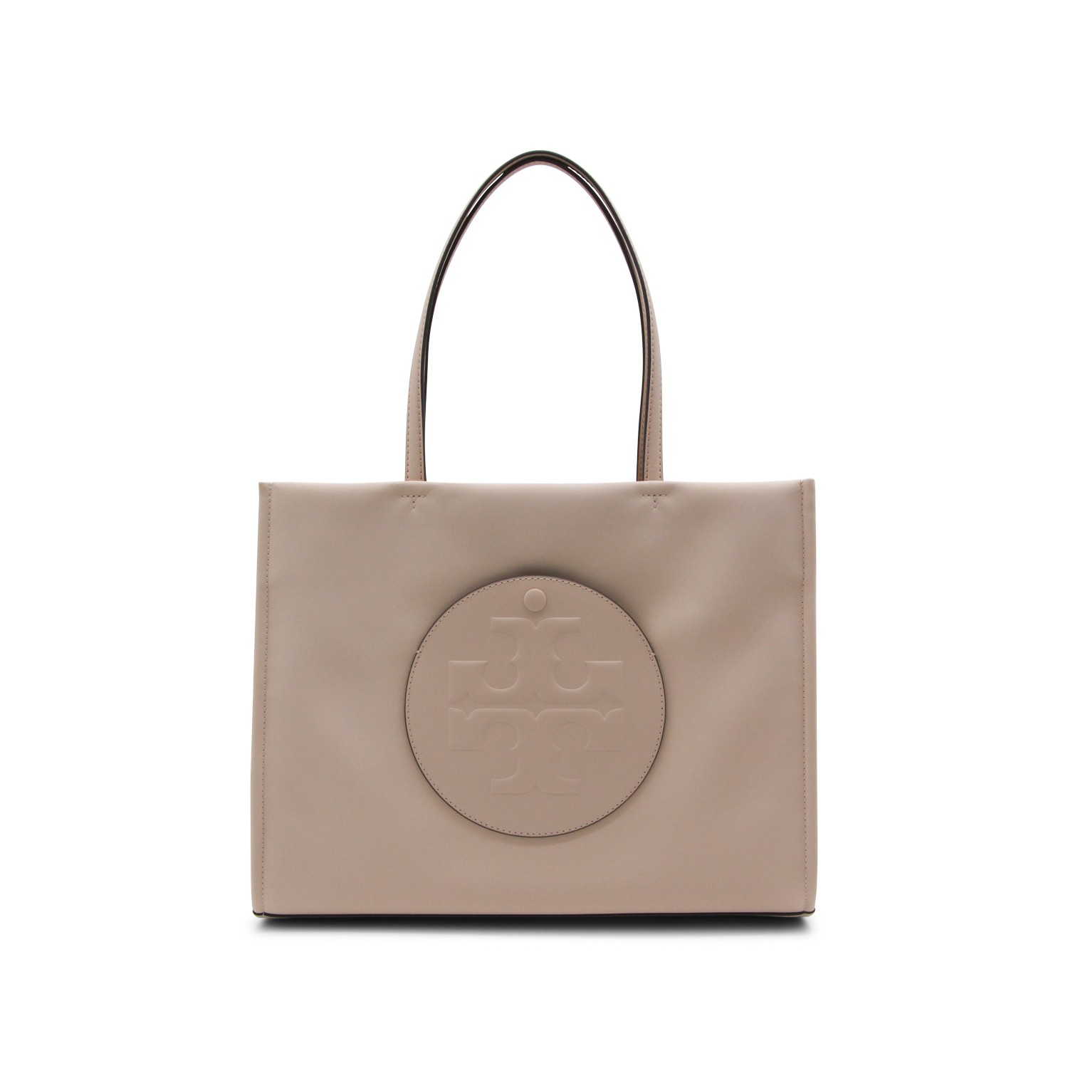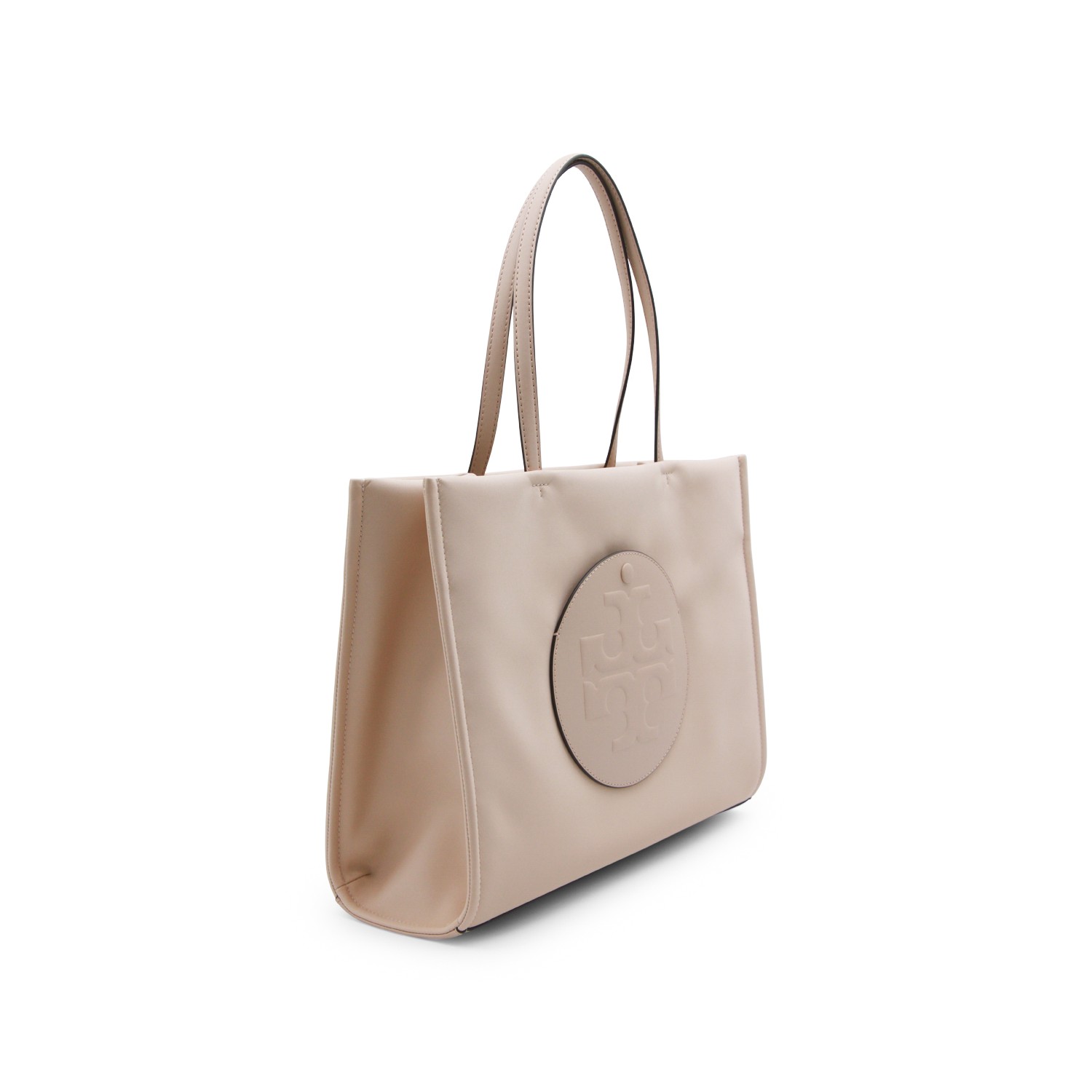 Light rose nylon Ella tote from Tory Burch featuring handles, logo patch in the front, magnetic closure, main compartment and internal zip pocket.