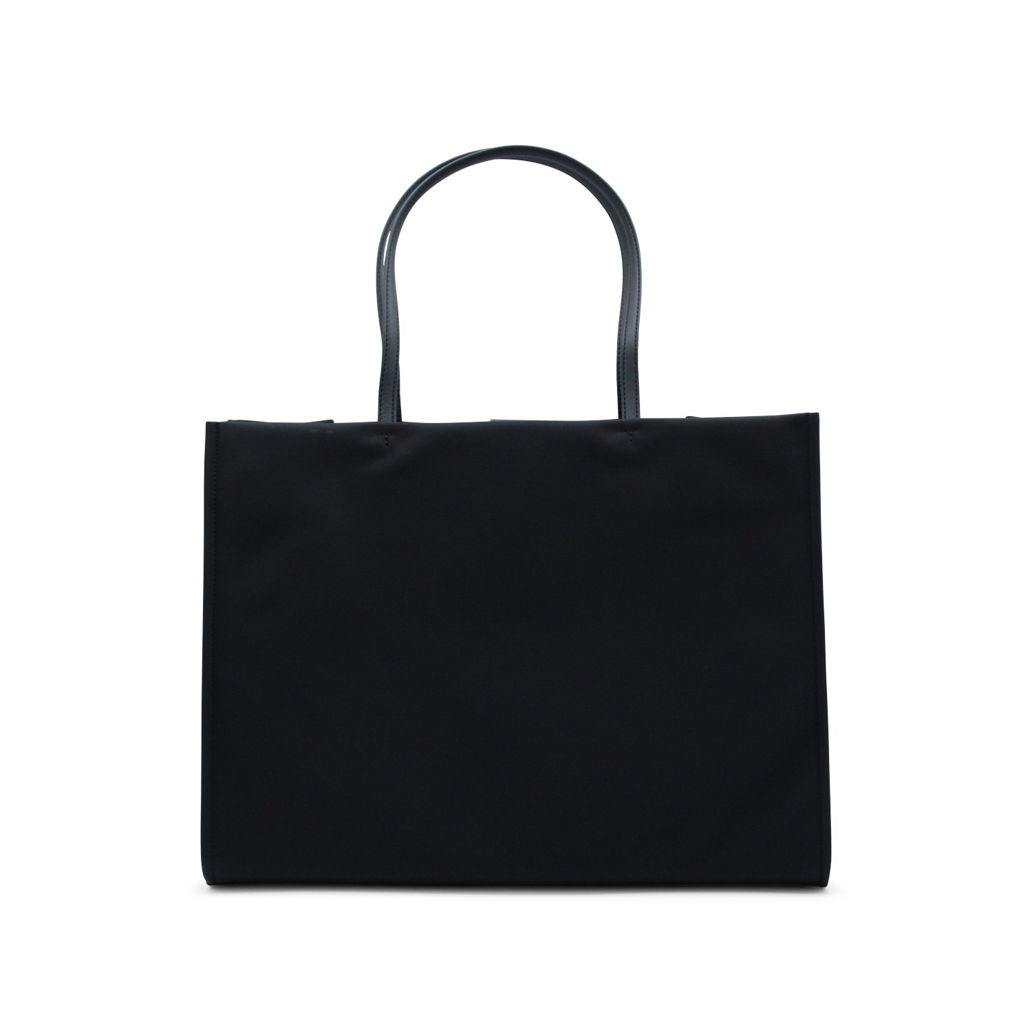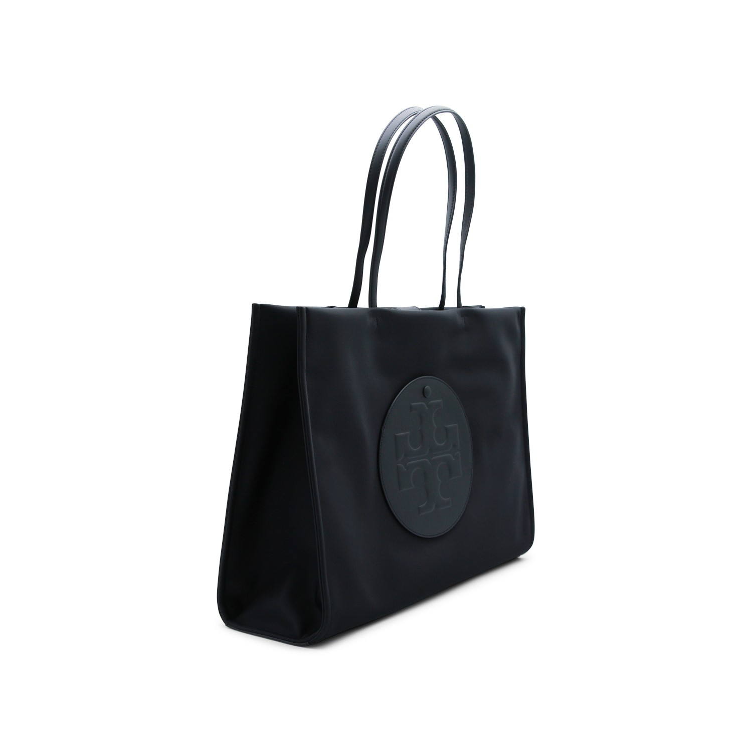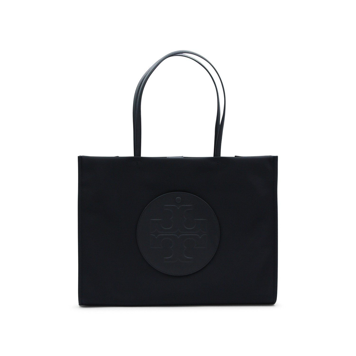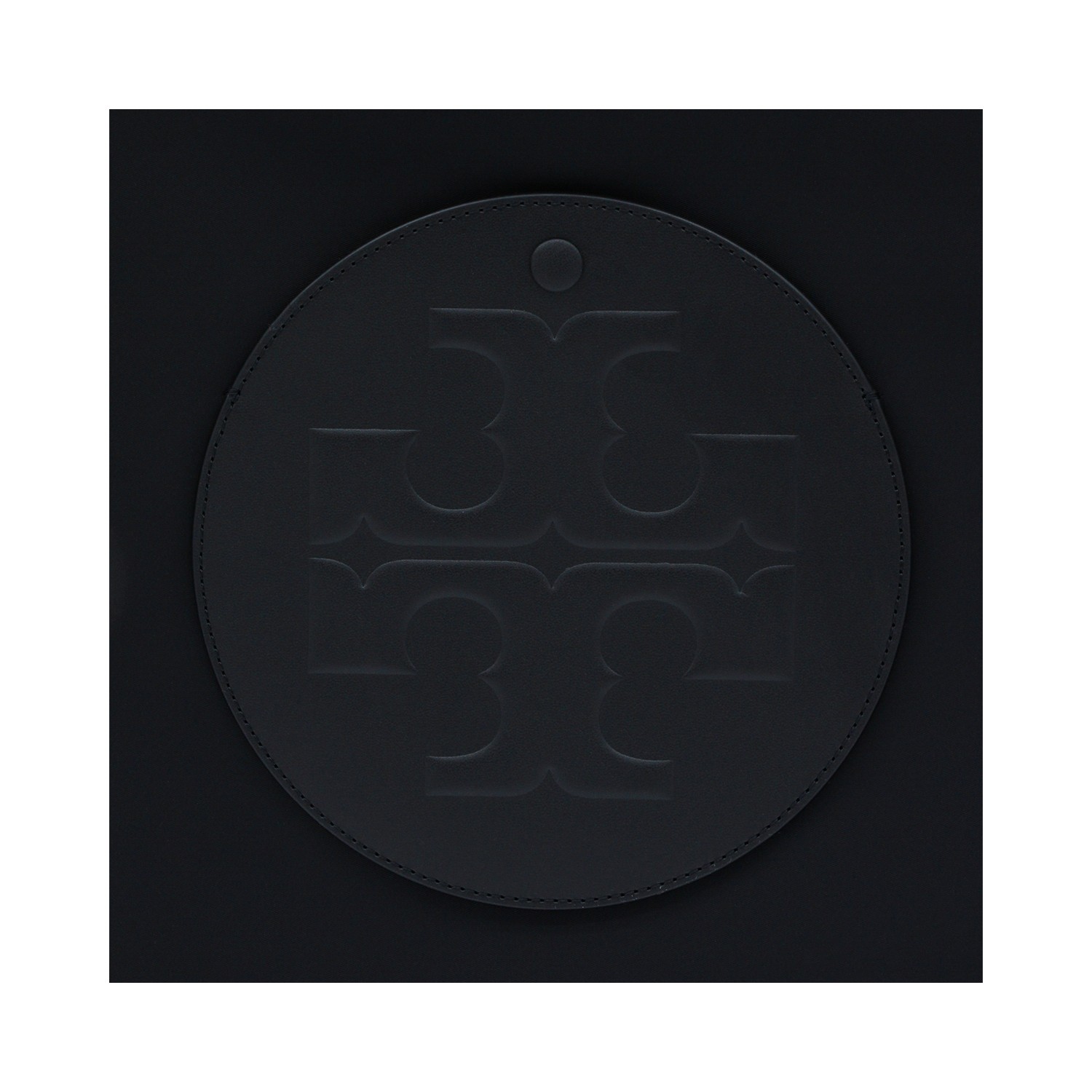 Black tote from Tory Burch featuring two handles, frontal logo pocket and single compartment.