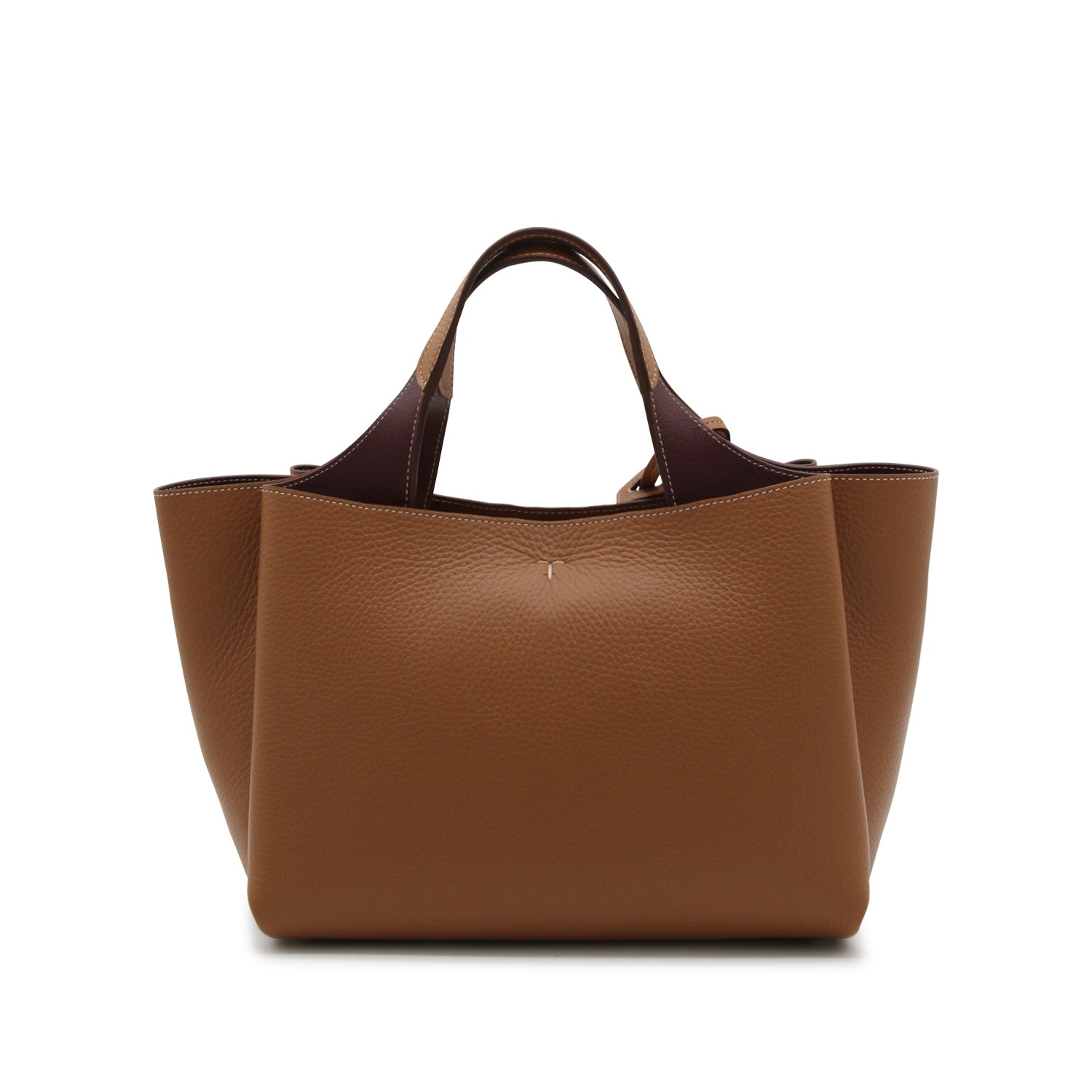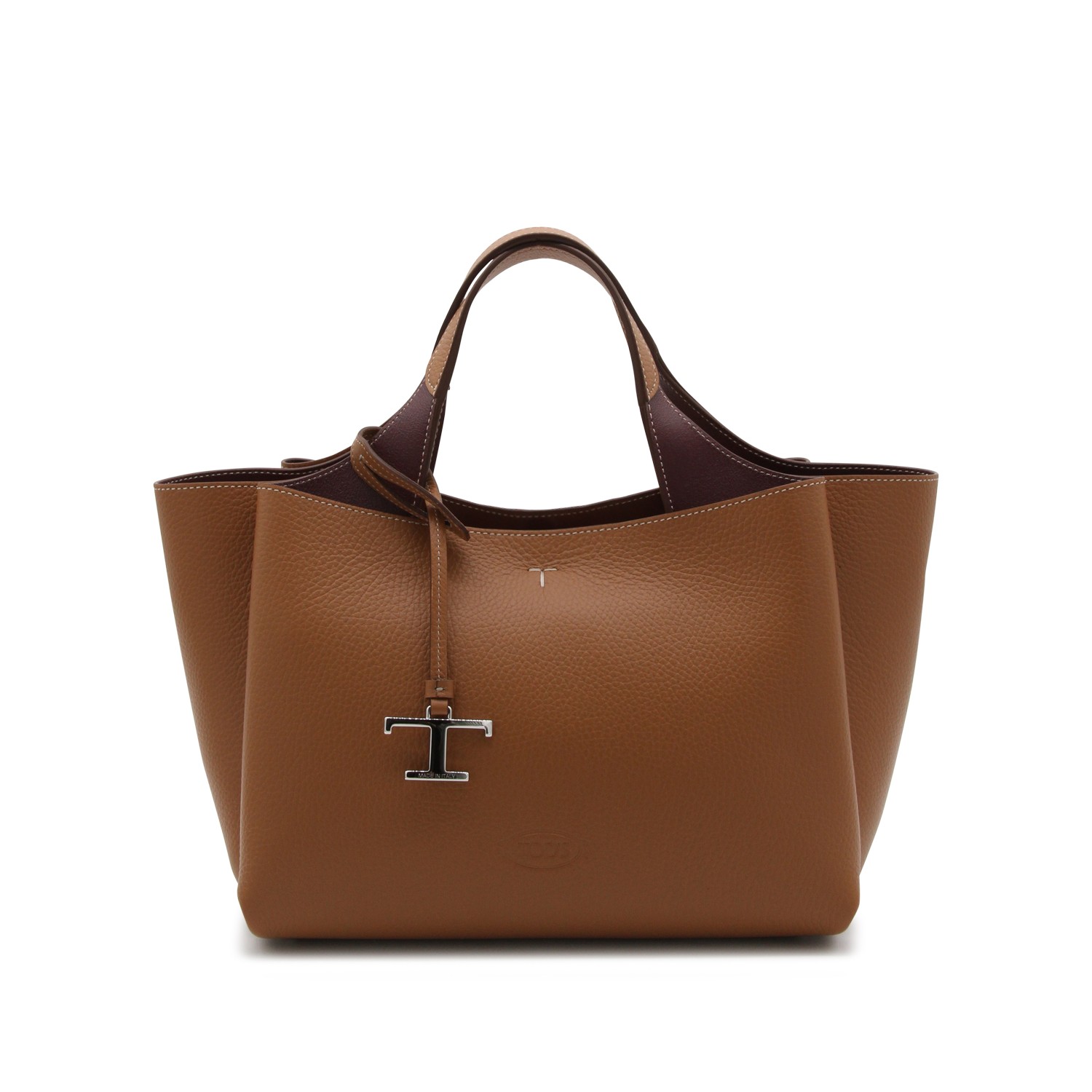 Brown leather tote bag from Tod's featuring embroidered logo to the front, two round top handles, adjustabel and detachable shoulder strap, internal clasp fastening, two internal zip pockets and three main compartments.