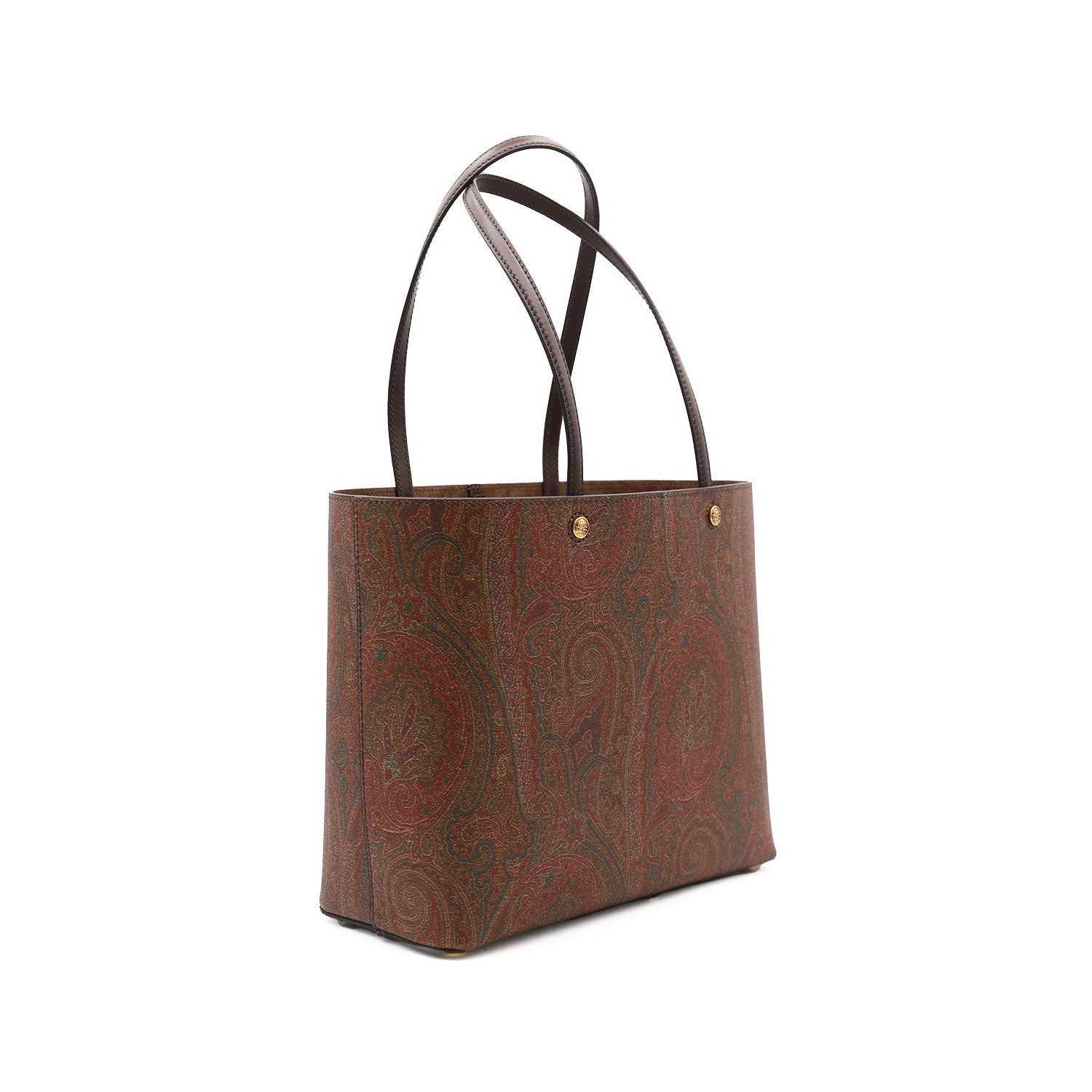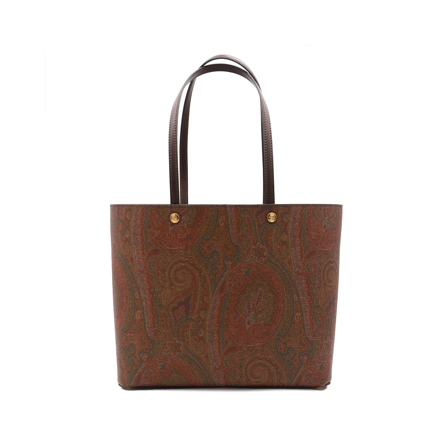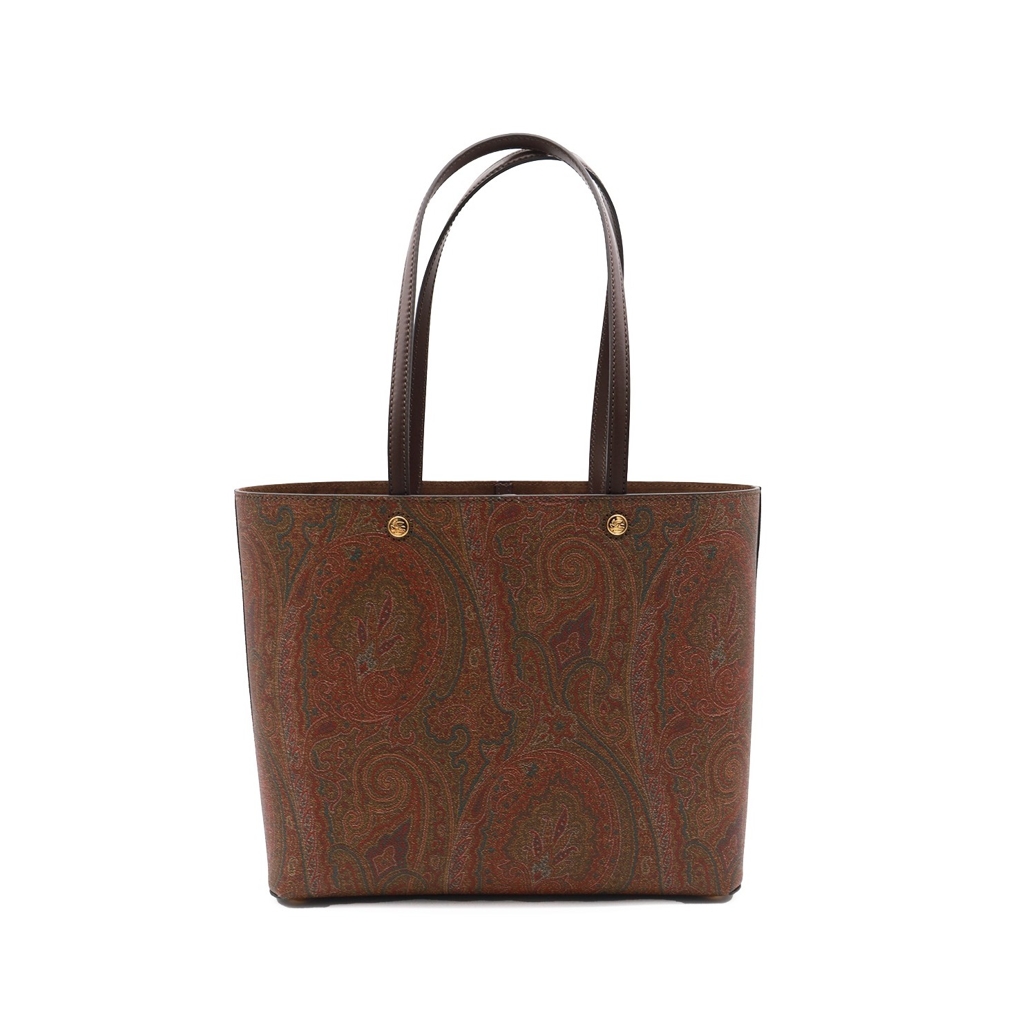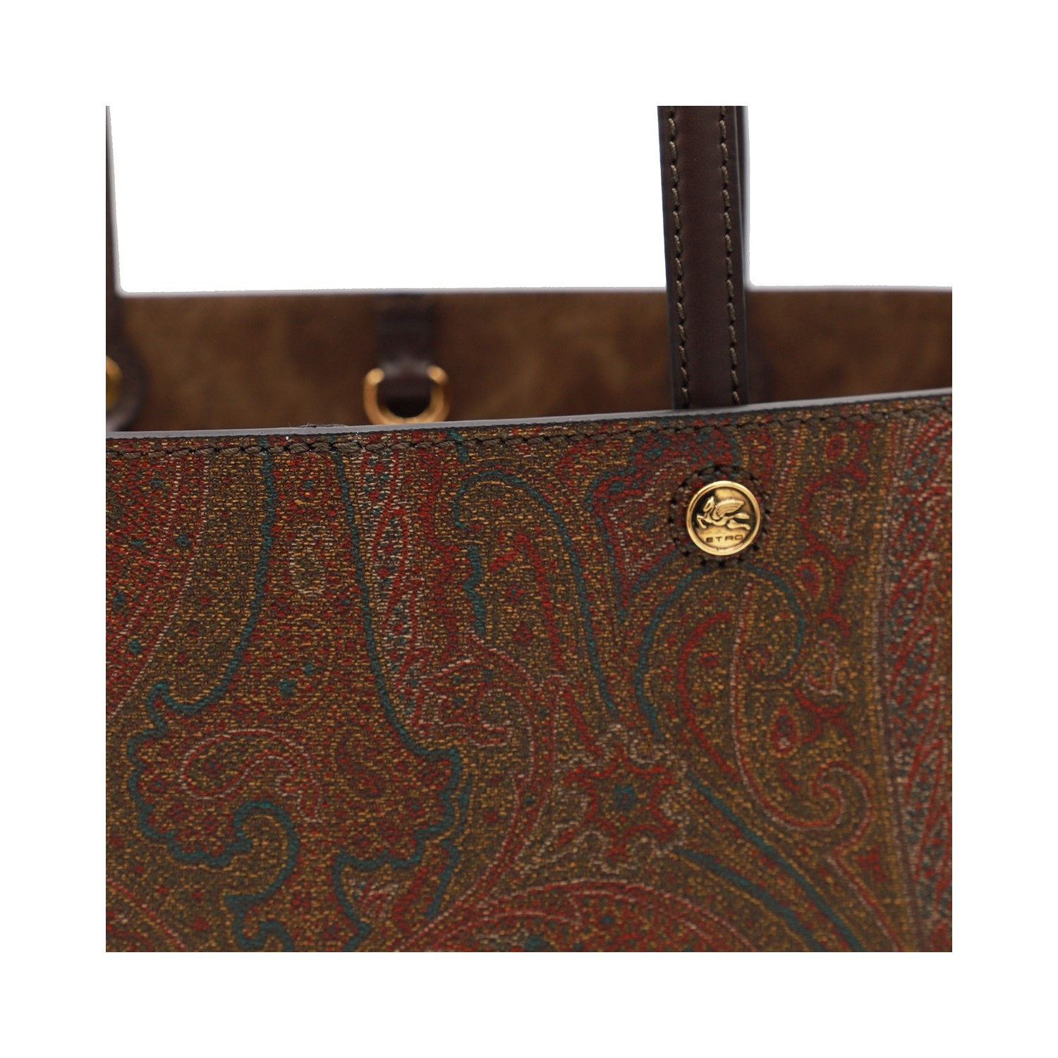 Brown tote from Etro featuring top handles, single compartment, gold tone hardware and all over pattern.