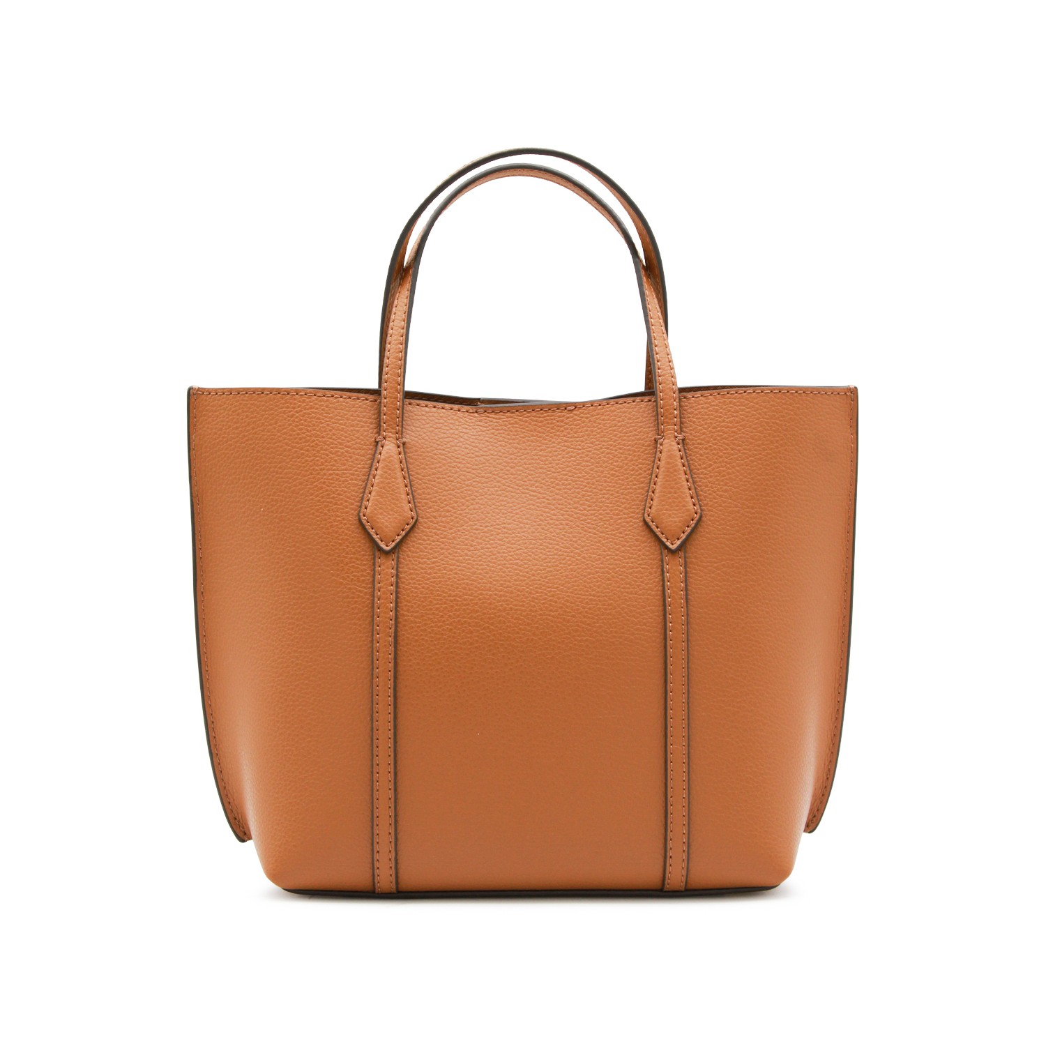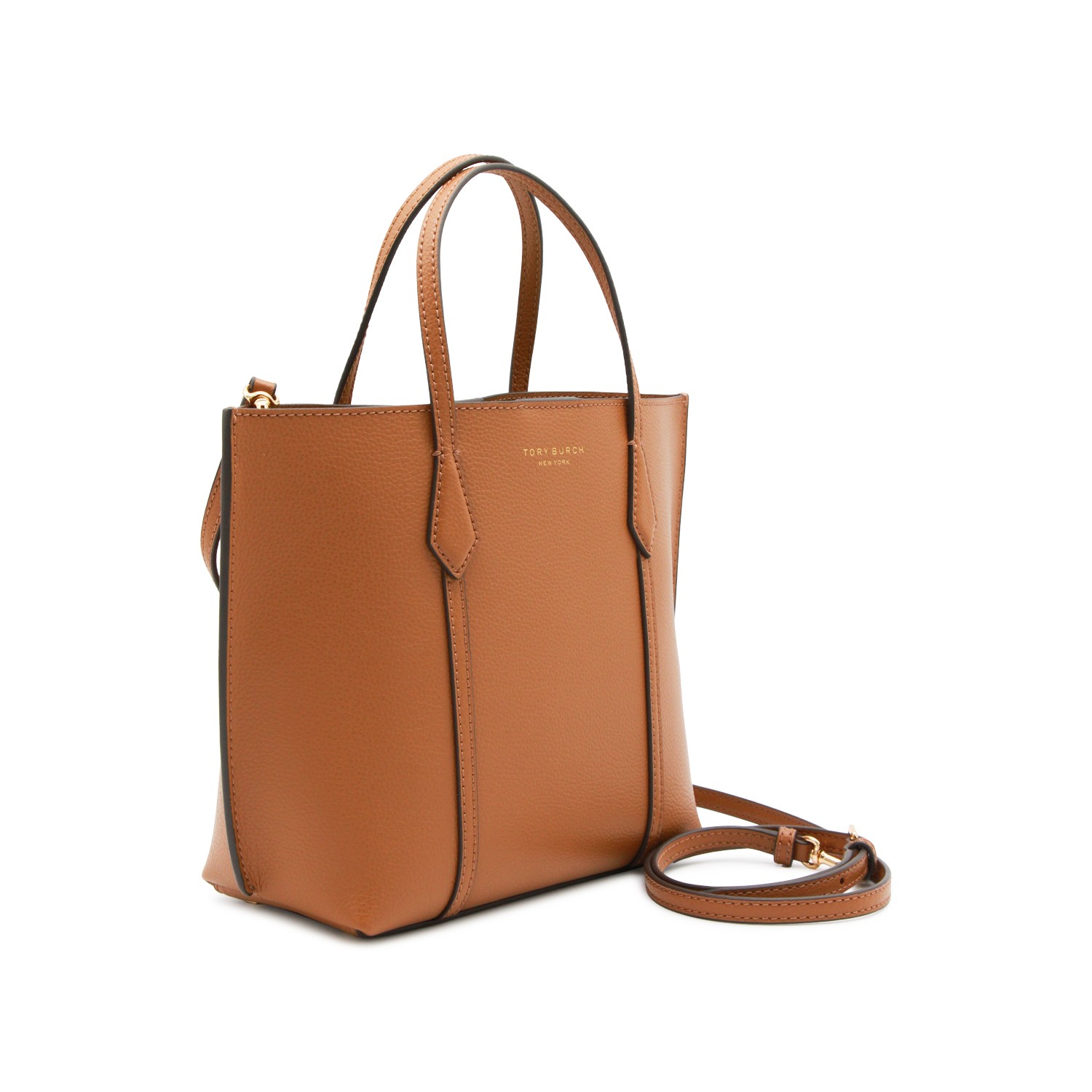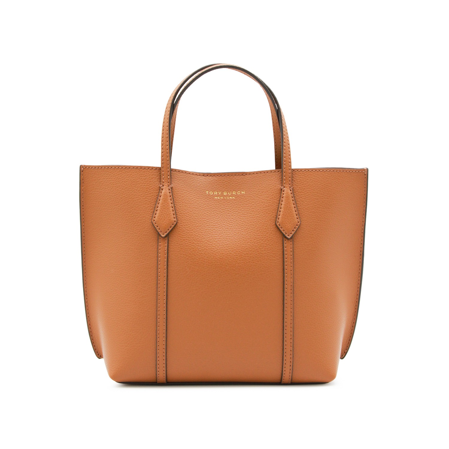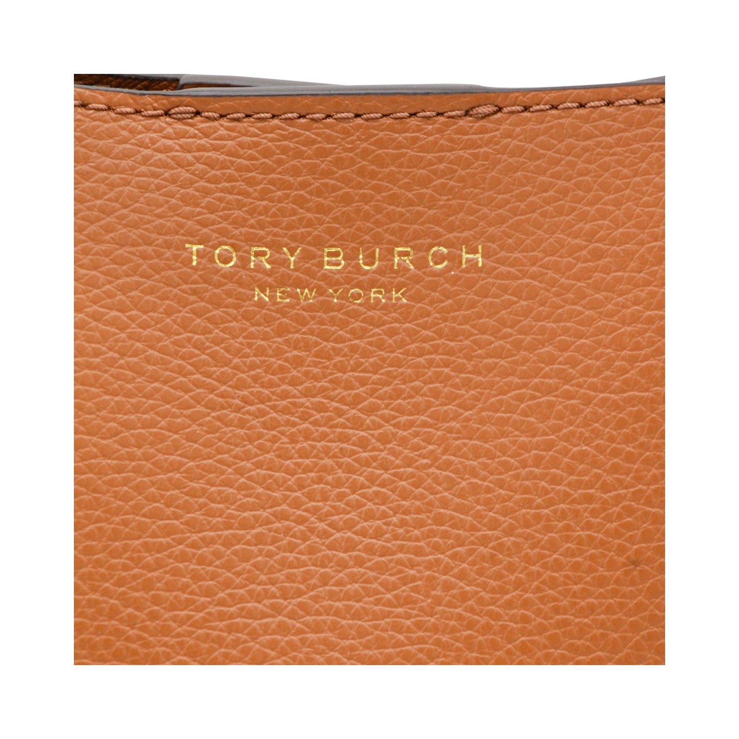 Brown leather tote from Tory Burch featuring top handles, printed logo and compartments.