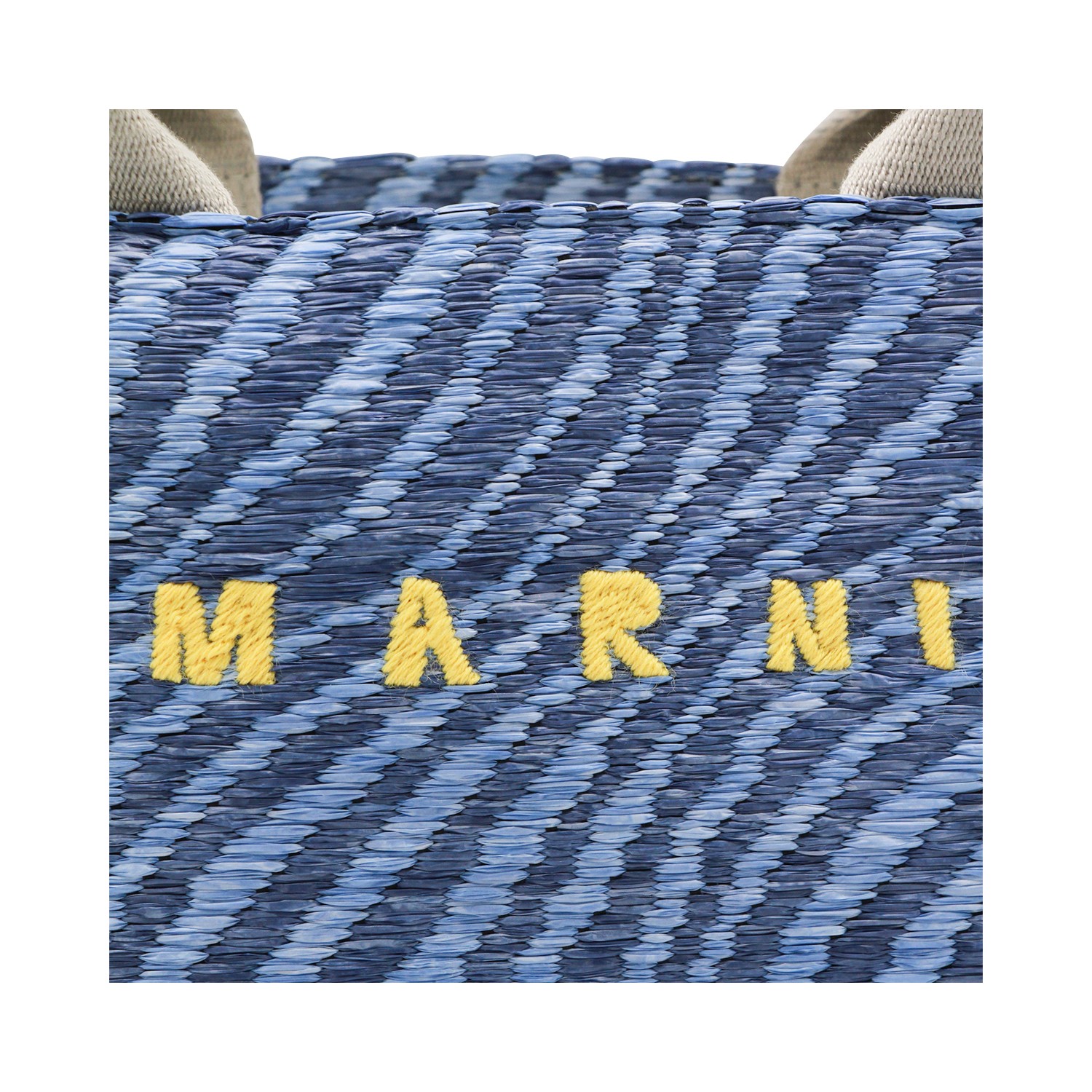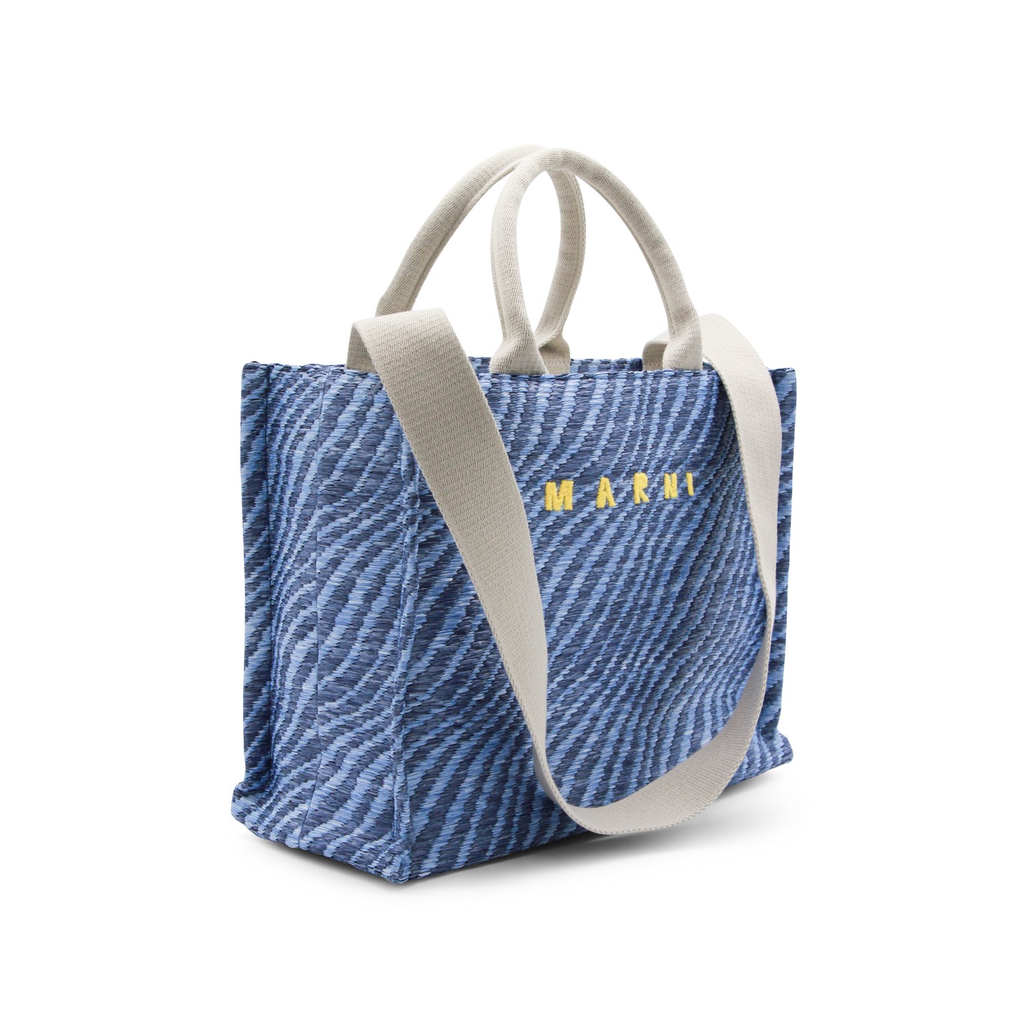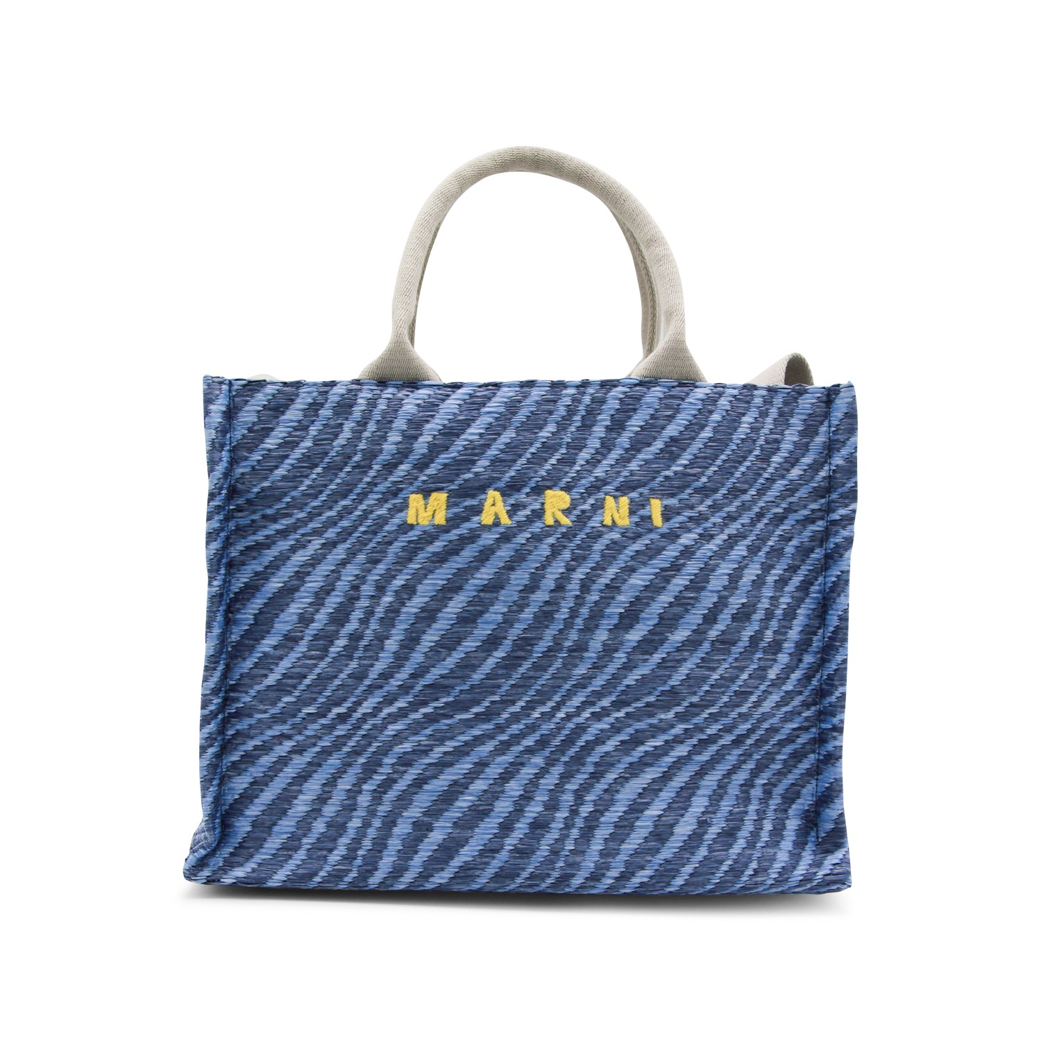 Blue tote from Marni featuring top handles, strap, frontal logo, all over pattern and main compartment.