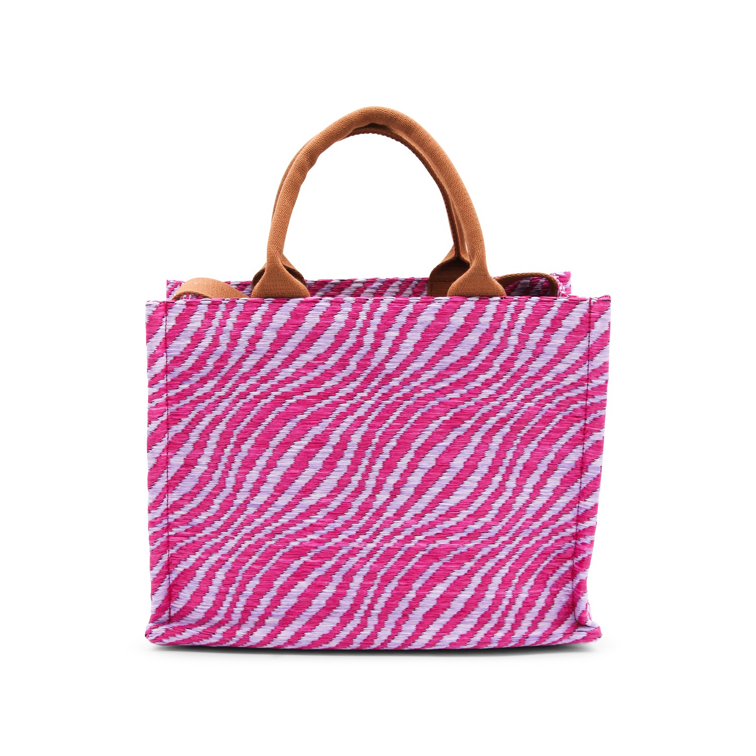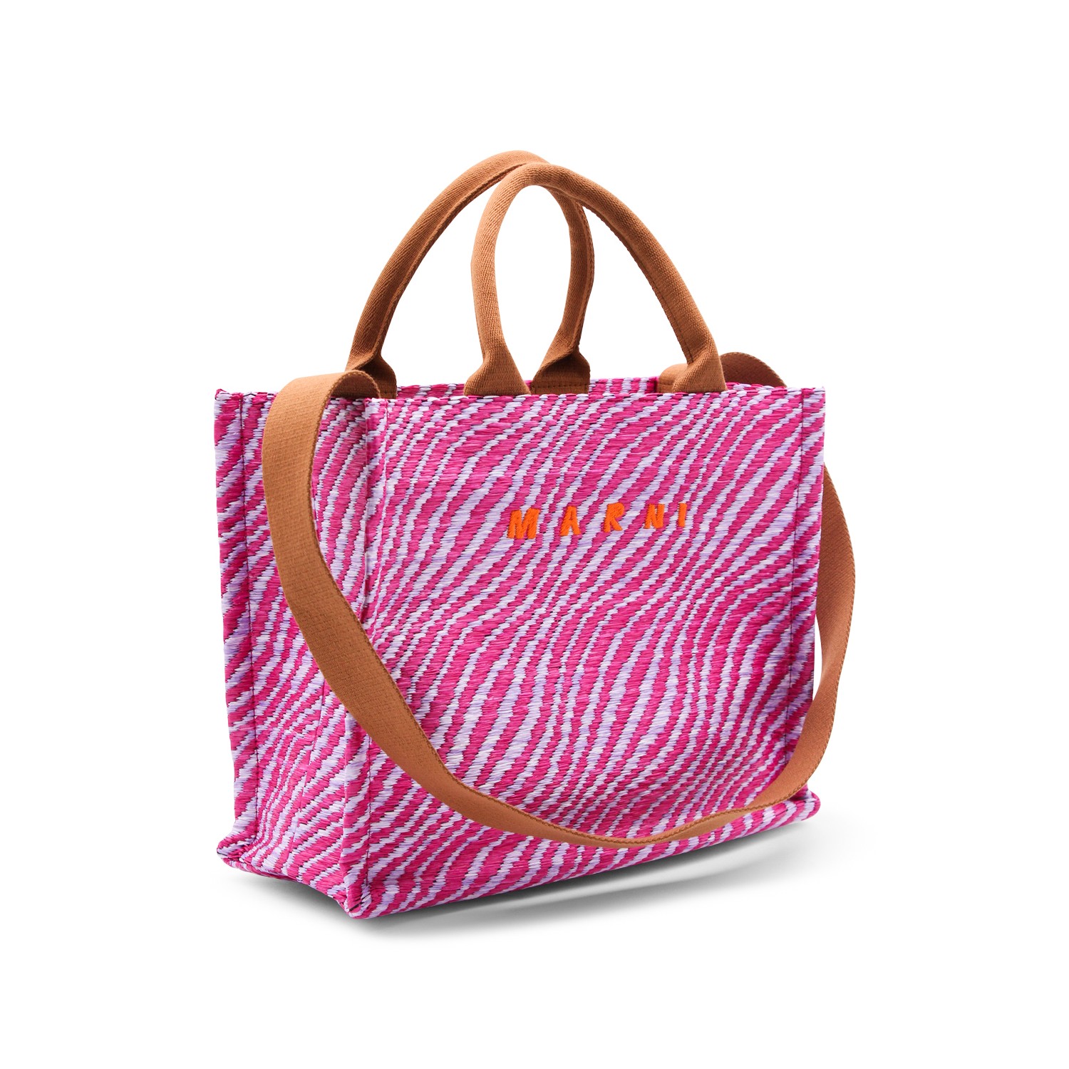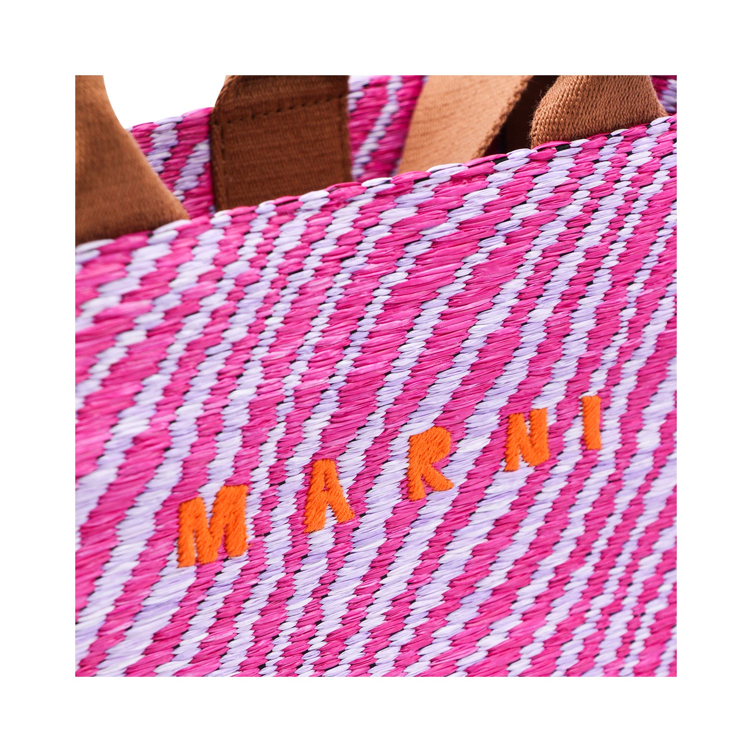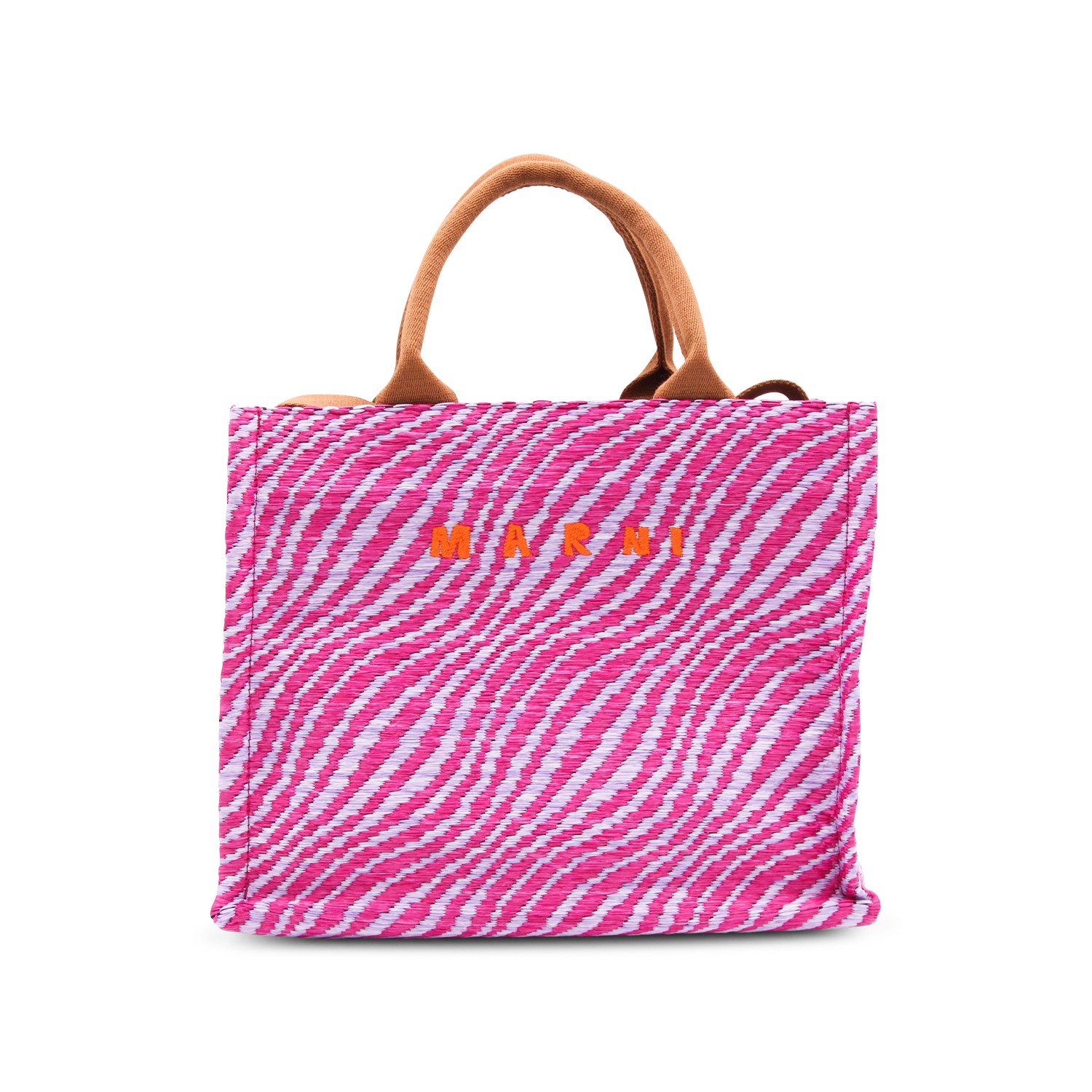 Pink tote from Marni featuring top handles, strap, frontal logo, all over pattern and main compartment.