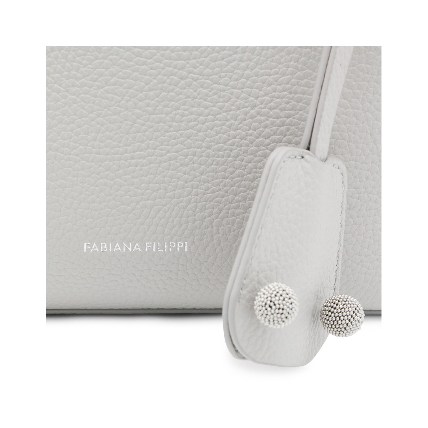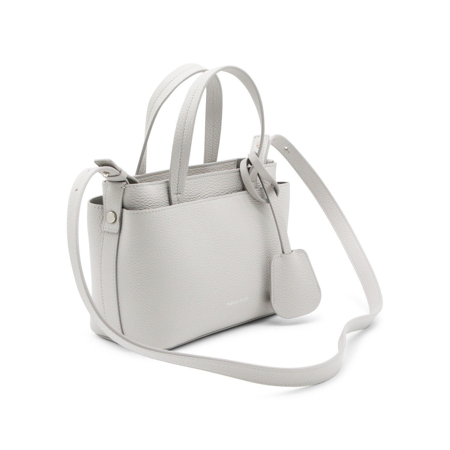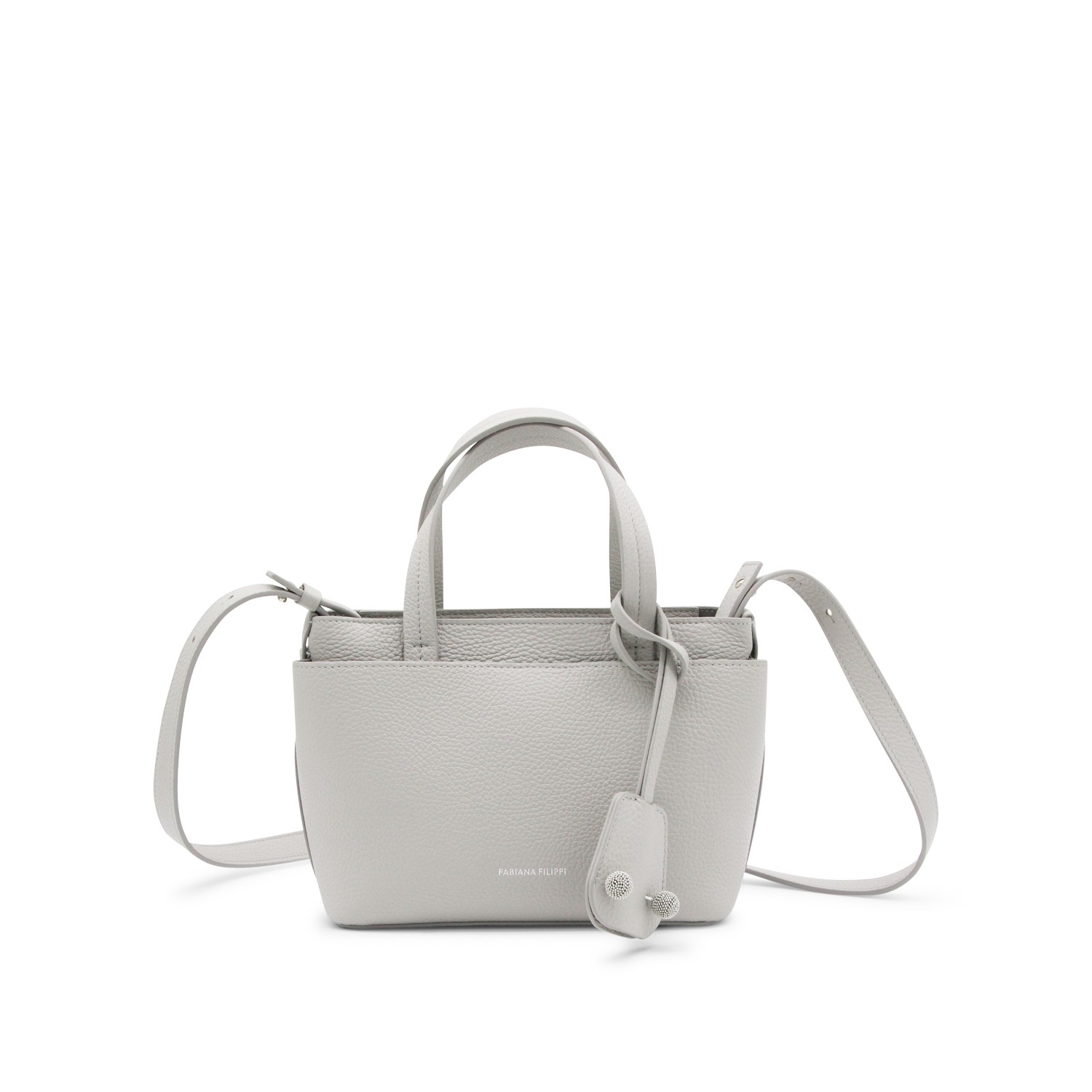 Grey leather top handle bag from Fabiana Filippi featuring top handles, adjustable shoulder strap, frontal logo, charms and comparments.