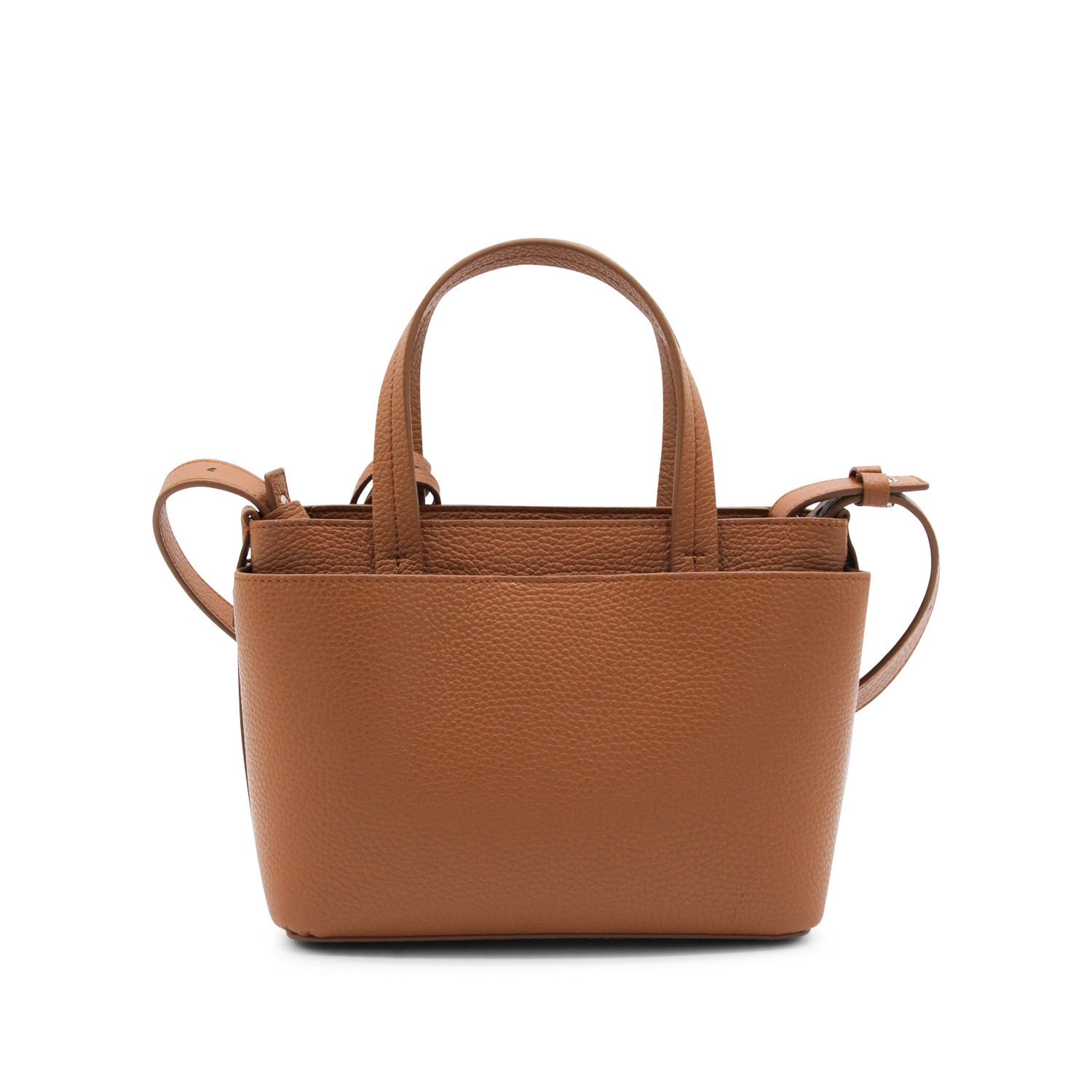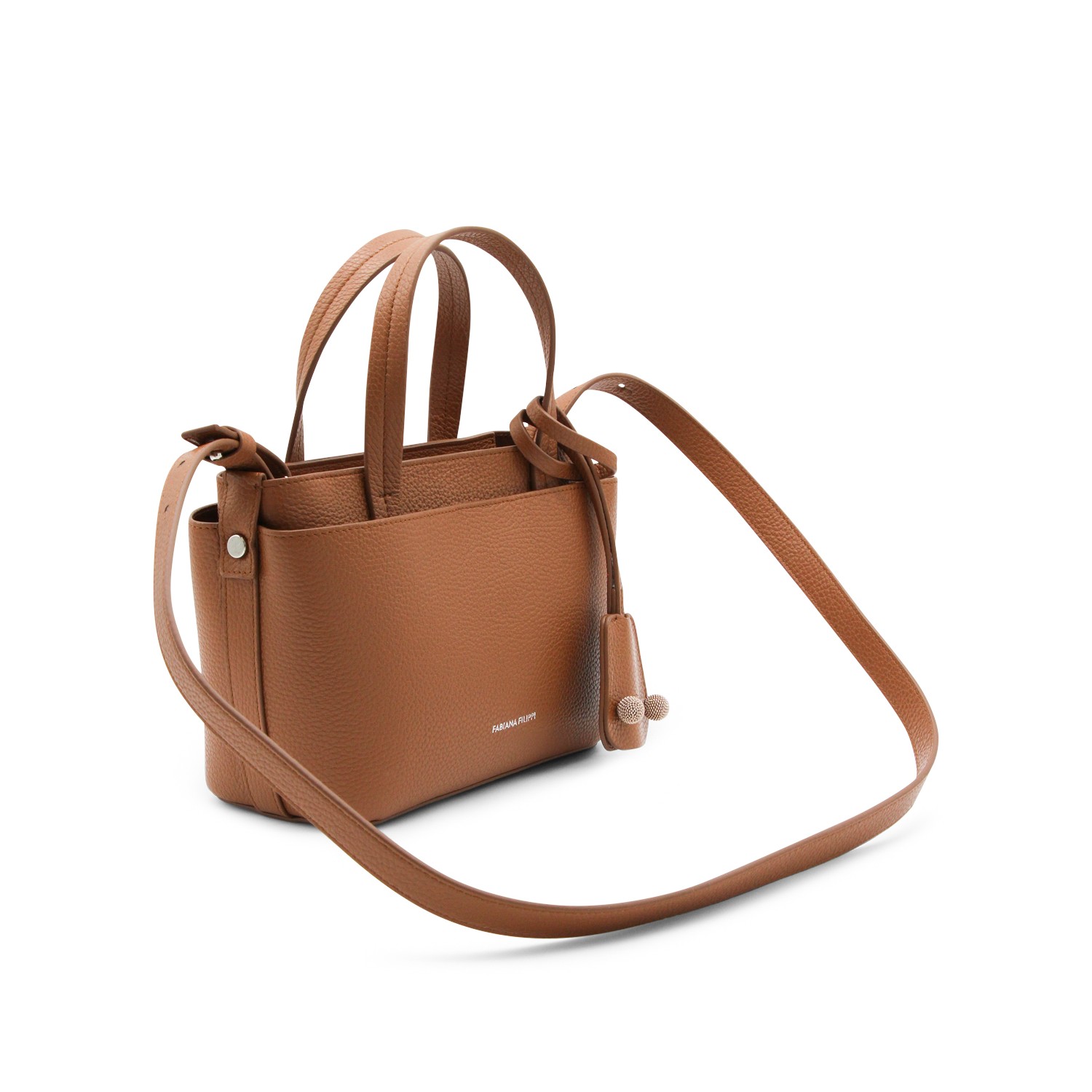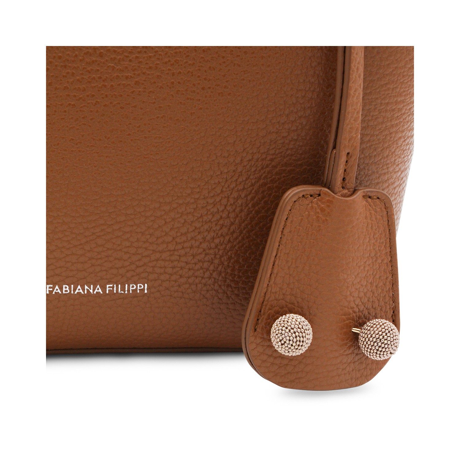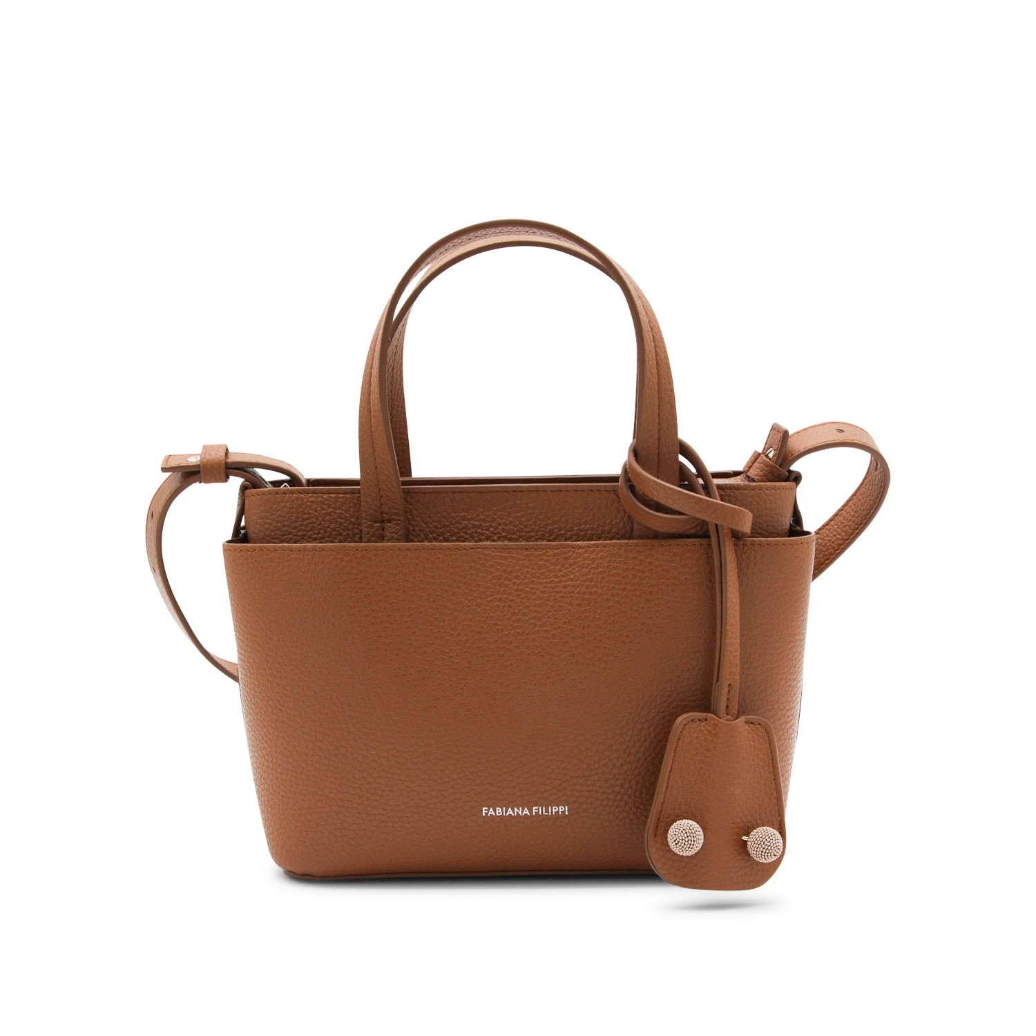 Brown leather top handle bag from Fabiana Filippi featuring top handles, adjustable shoulder strap, frontal logo, charms and comparments.