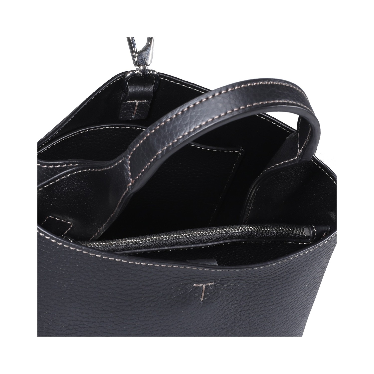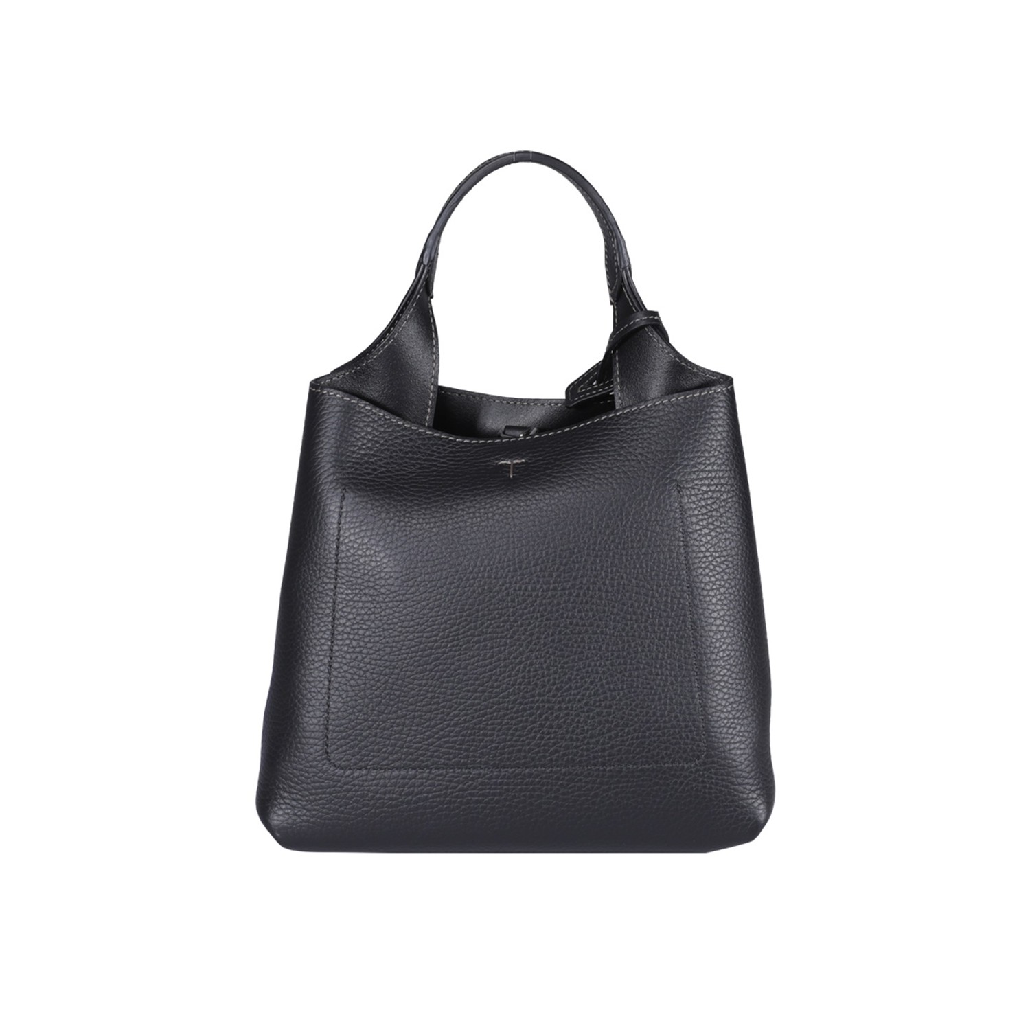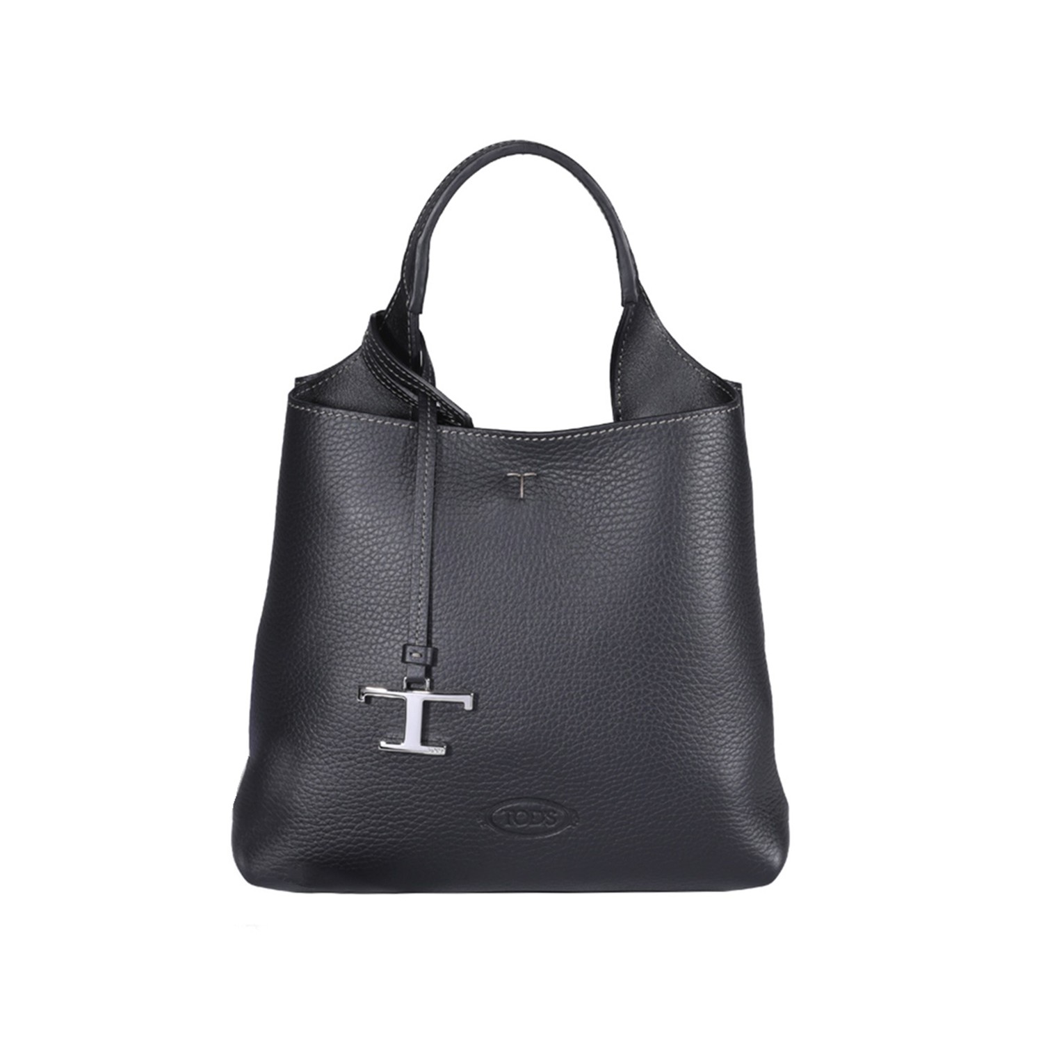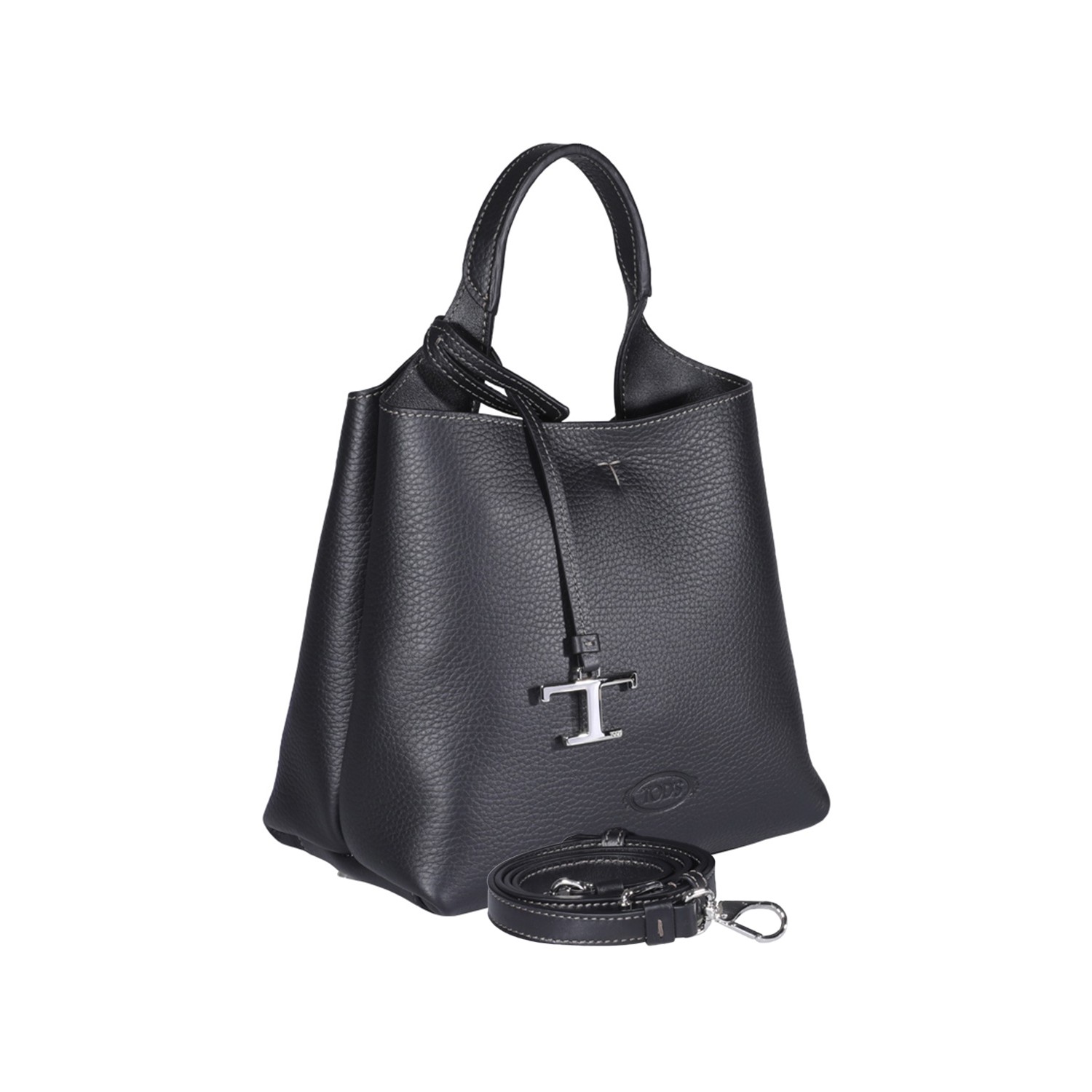 Black leather tote from Tod's featuring top handle, removable strap, main compartment, logo and silver tone hardware.