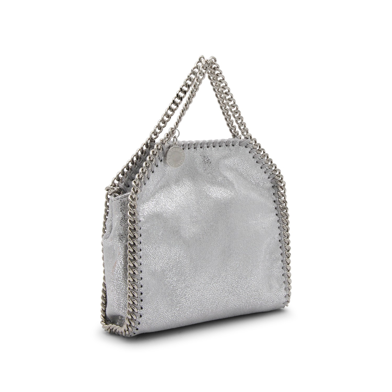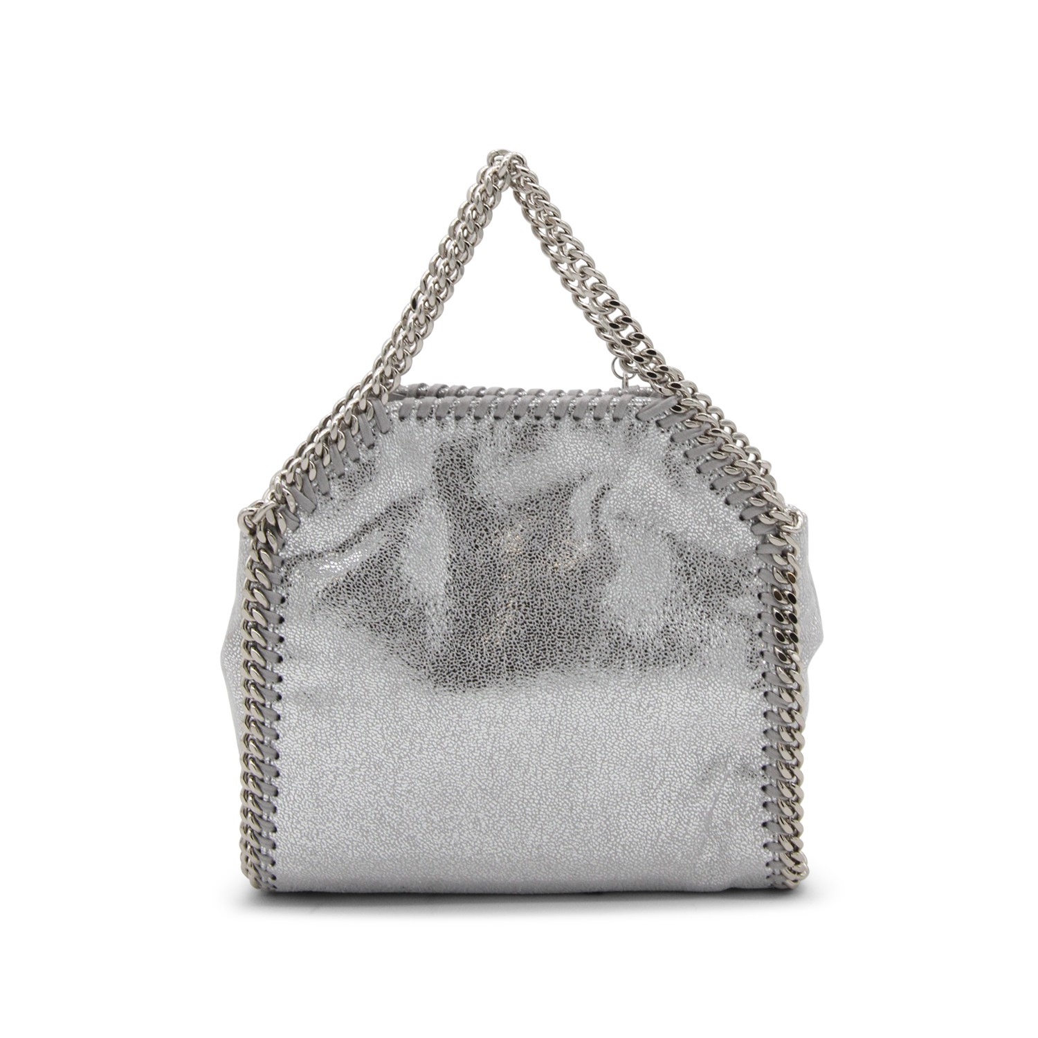 Silver metal faux leather Falabella micro tote from Stella McCartney featuring silver tone metal finishes, logo charm, detachable metal chain strap, main compartment, snap button closure and inside flat pocket.