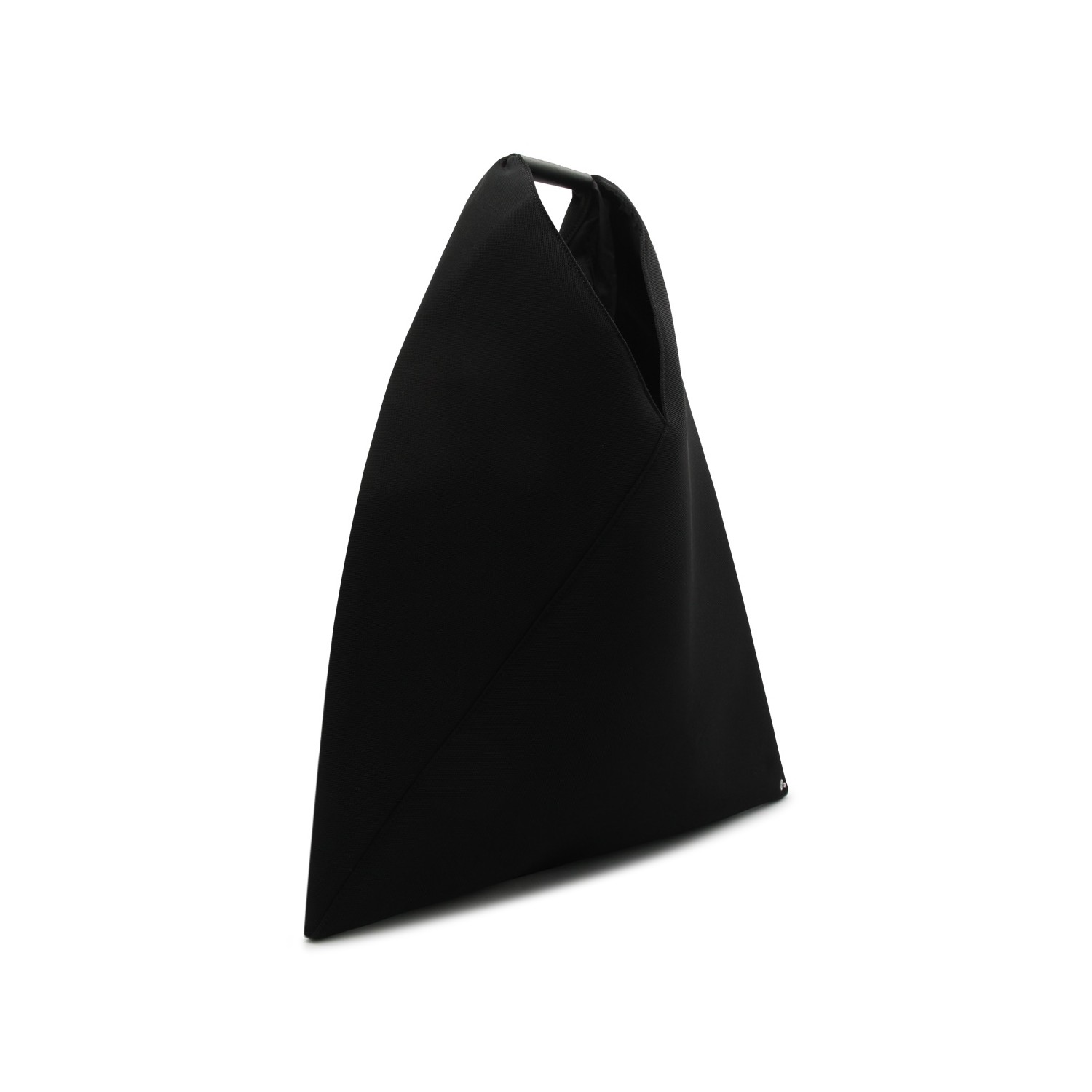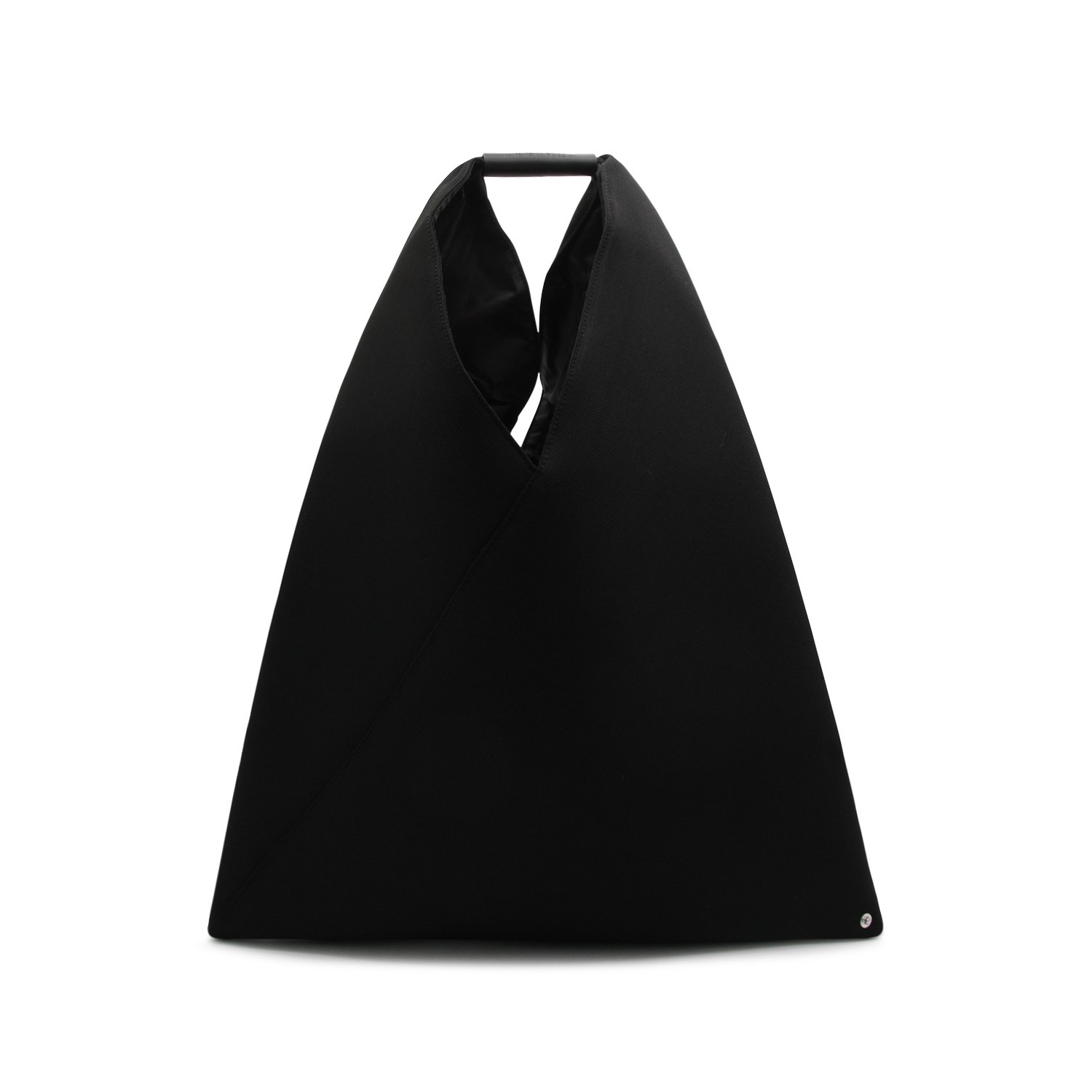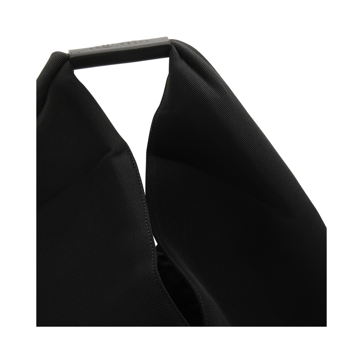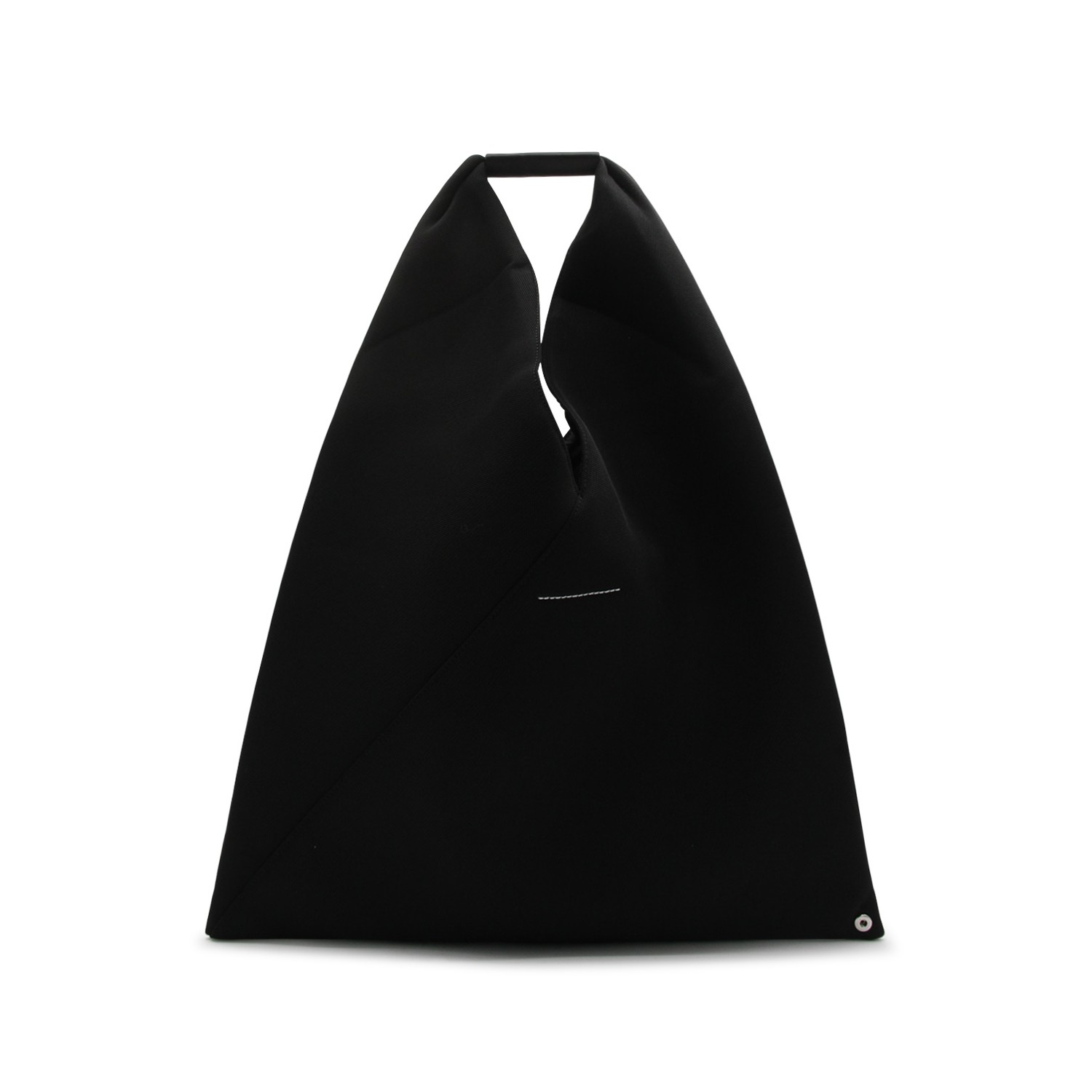 Black tote from Mm6 Maison Margiela featuring top handle, upper fastening with button and silver tone hardware.