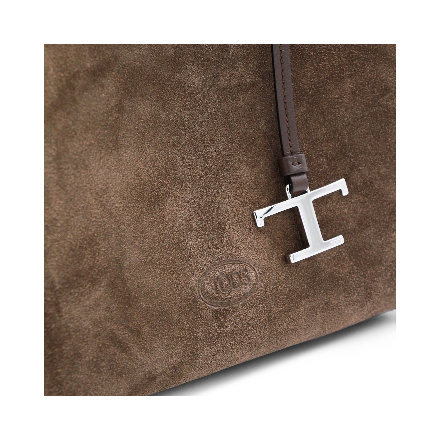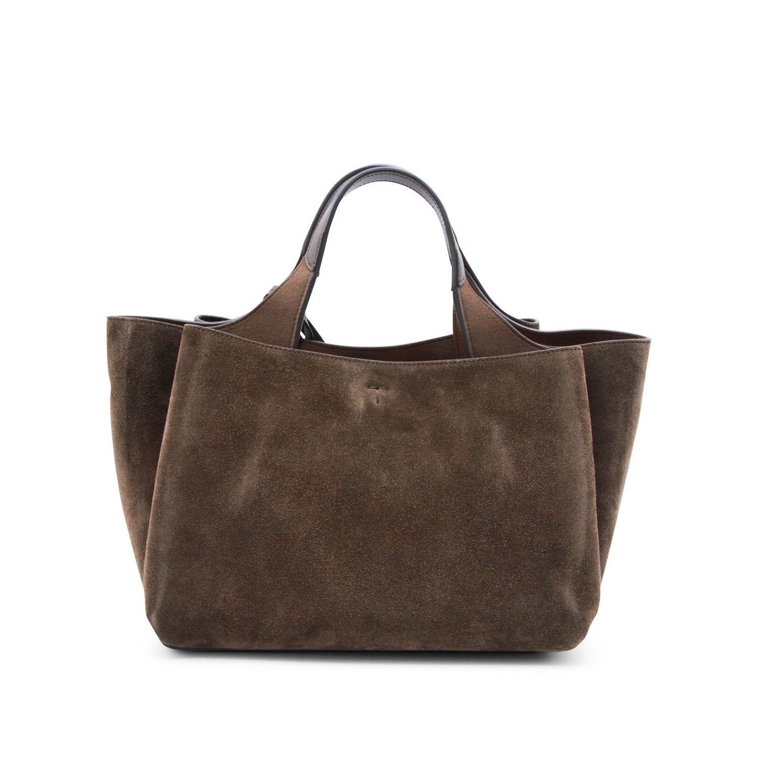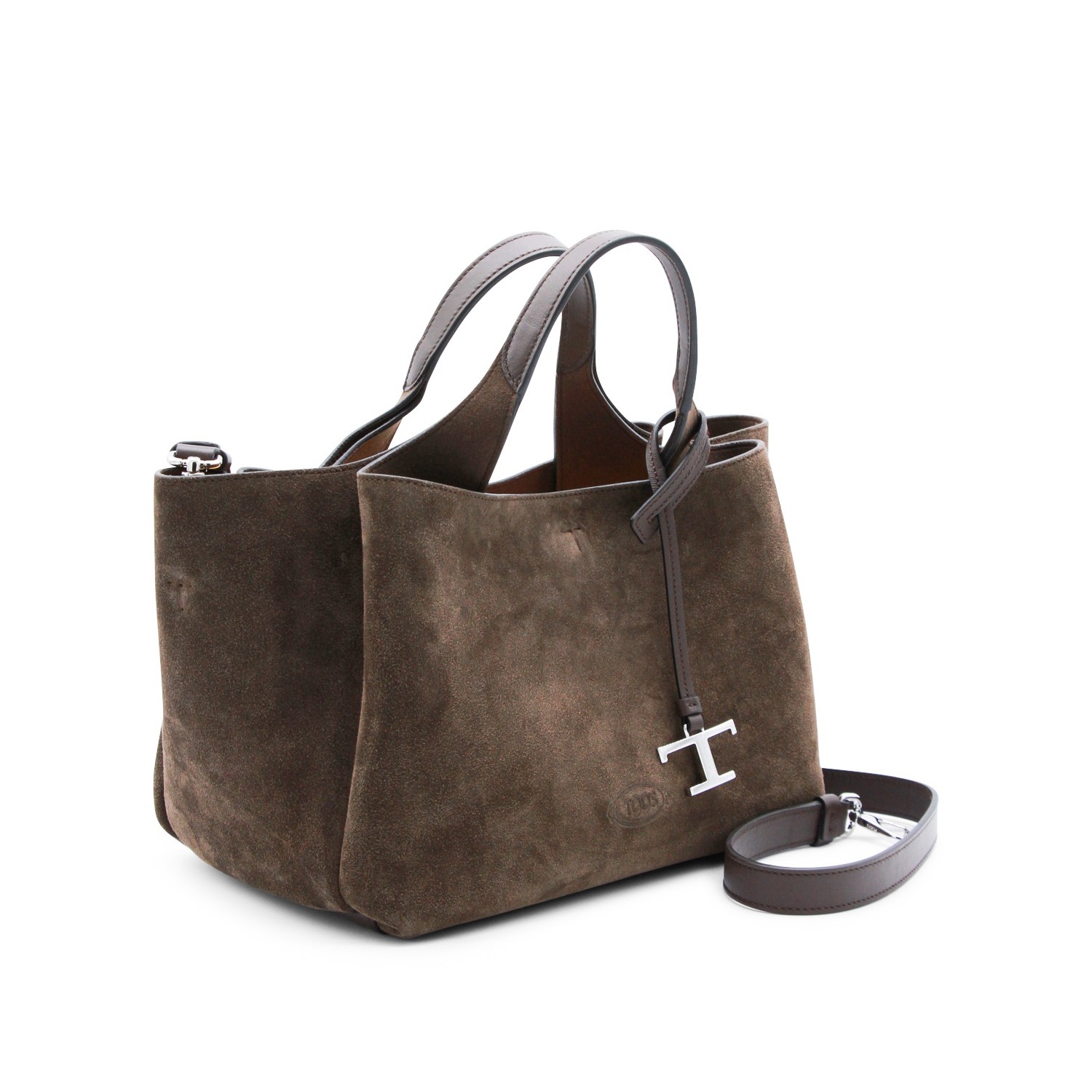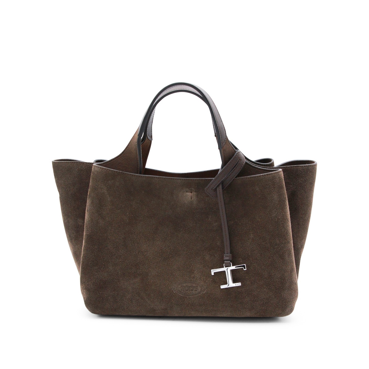 Brown suede leather top handle bag from Tod's featuring top handles, frontal silver tone logo, internal clasp fastening, adjustable shoulder strap and inside pocket.