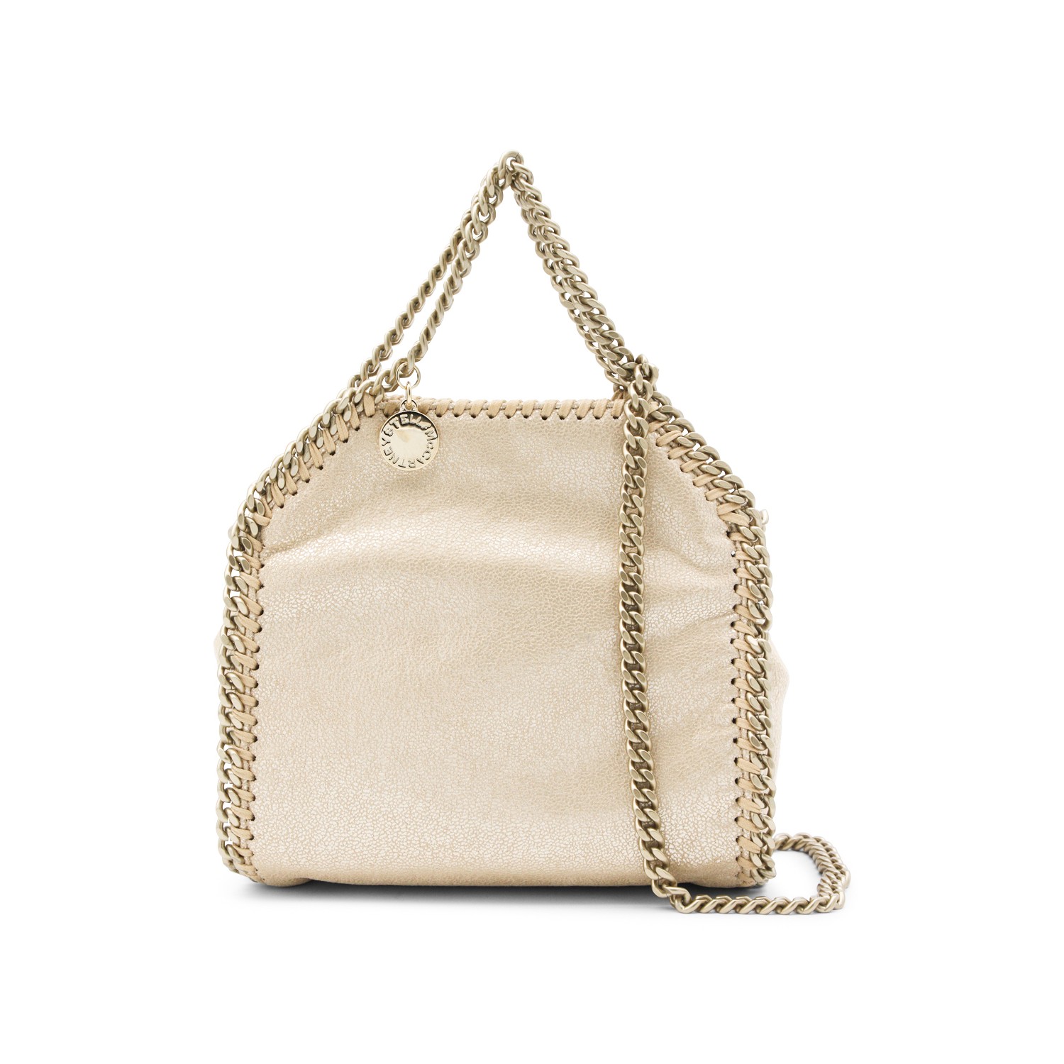 Gold faux leather Tiny tote from Stella McCartney featuring detachable chain shoulder strap, logo charm, snap button closure and main compartment.