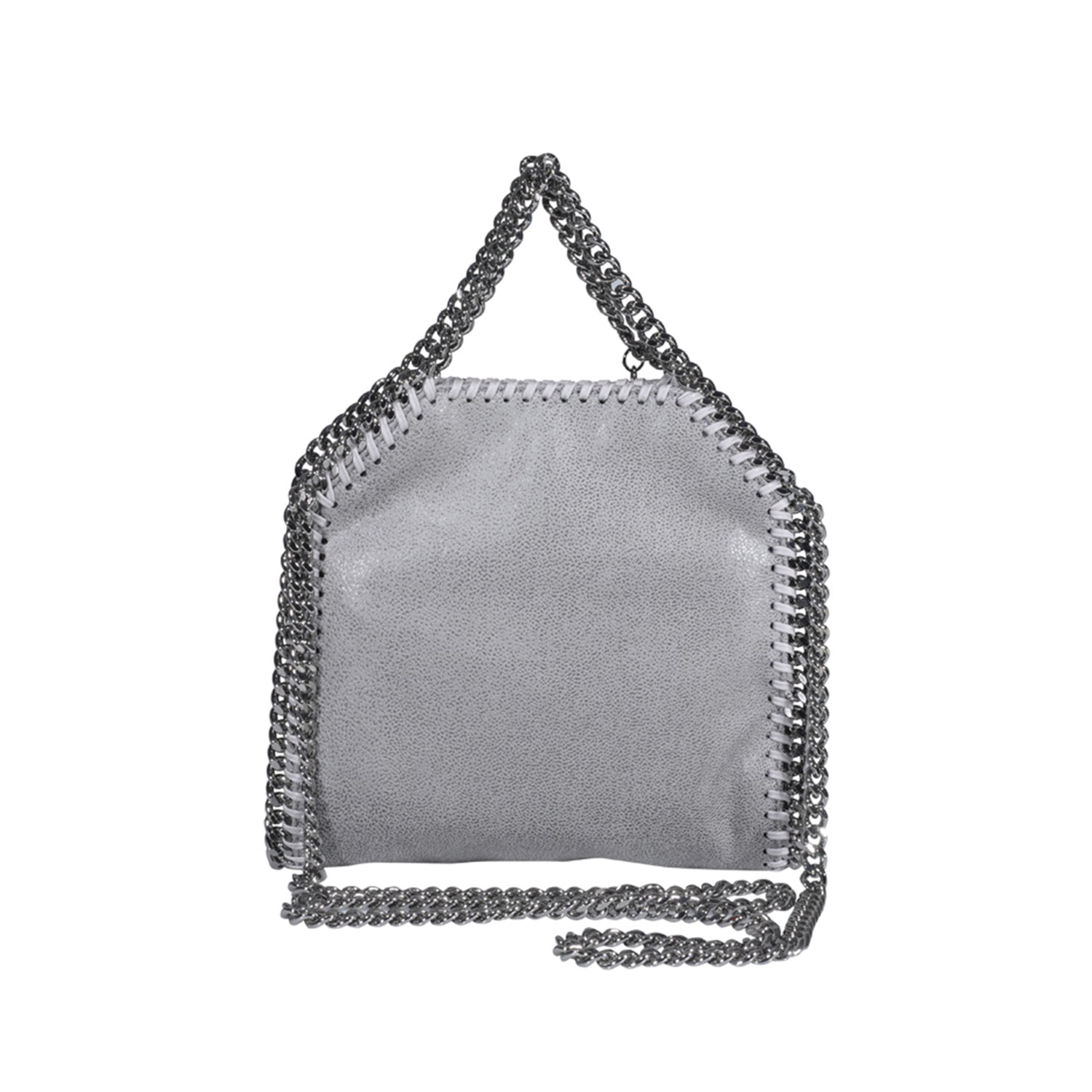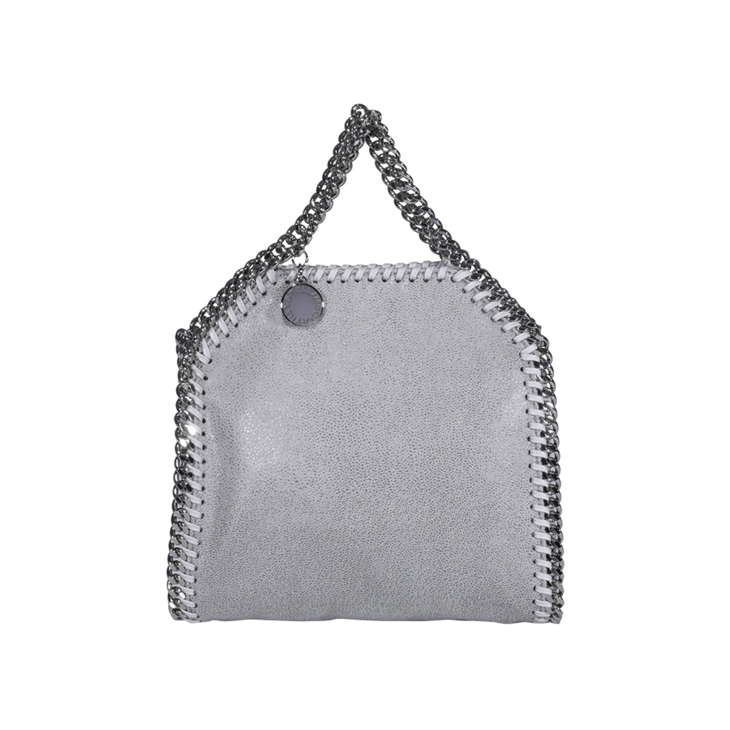 Pearl grey faux leather Tiny Falabella tote bag featuring top handles, shoulder strap, chain-link trims, magnetic fastening, internal slip pocket and pebbled effect.