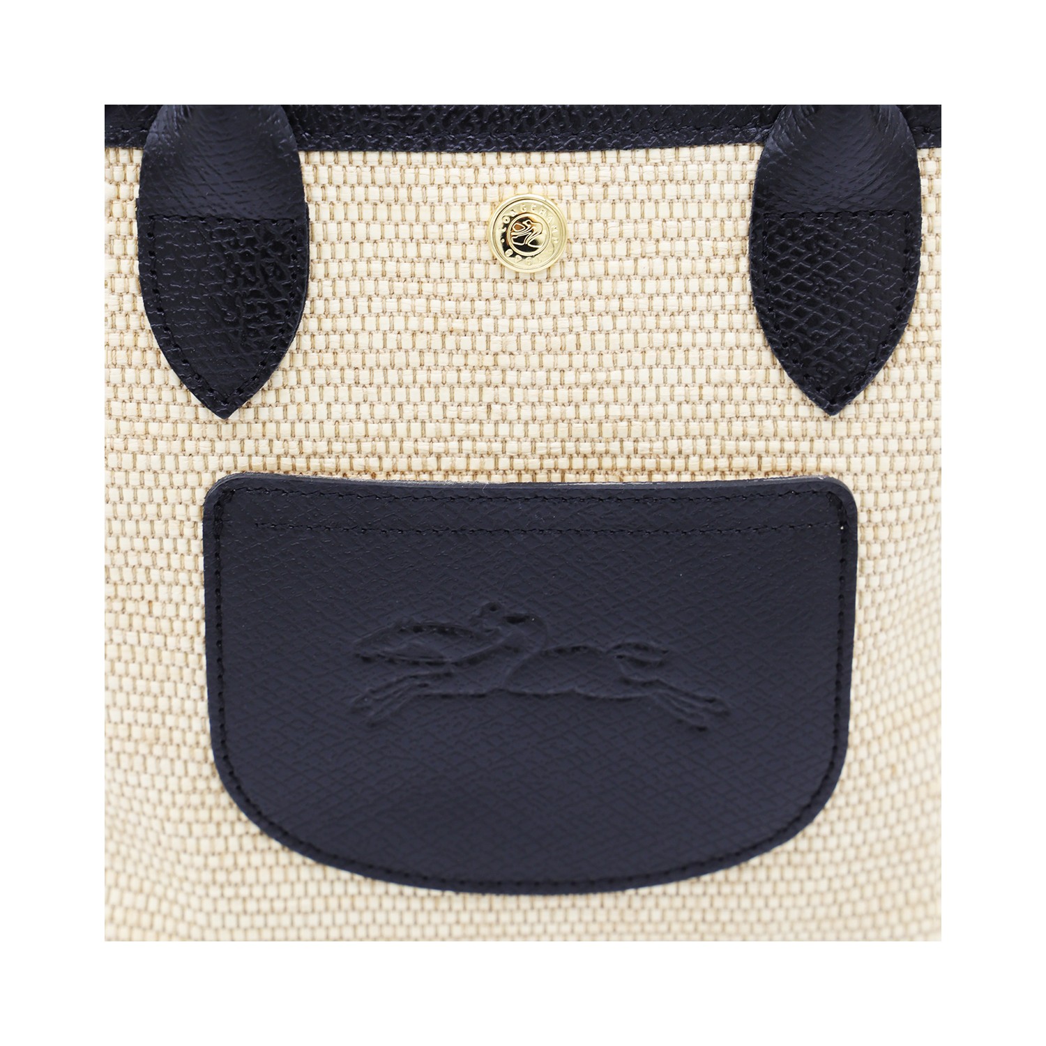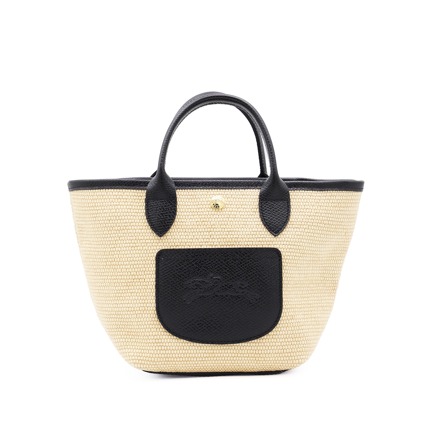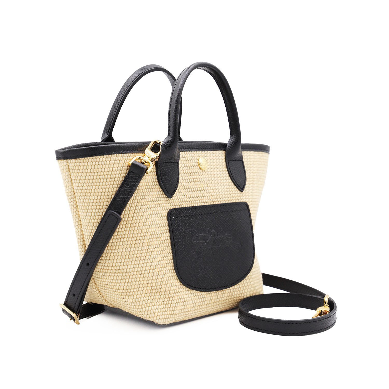 Natural raffia Le Pliage Xs tote from Longchamp featuring handles, removable shoulder strap, main compartment, snap button closure, inner zip pocket and leather.