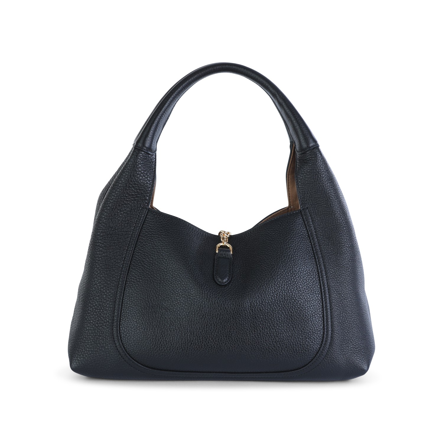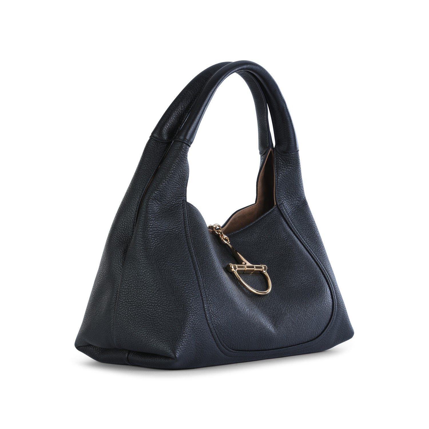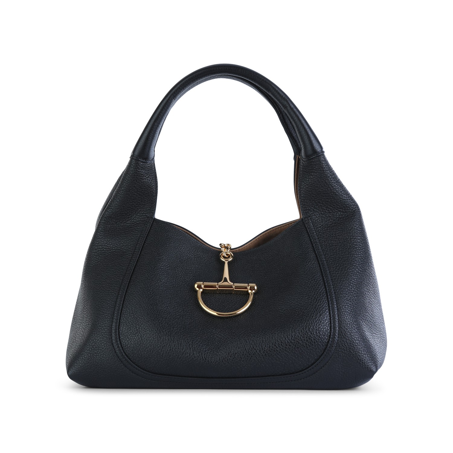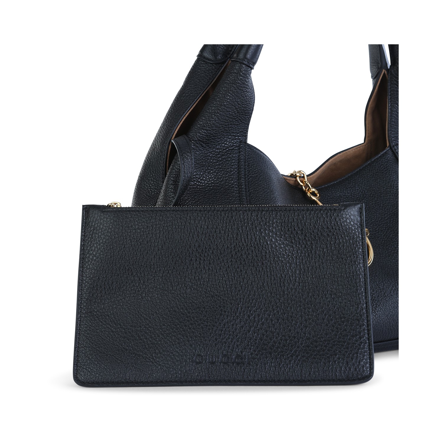 Black leather Softbit tote bag from Gucci featuring gold tone Morsetto detail, shoulder strap, main compartment and hidden pocket.