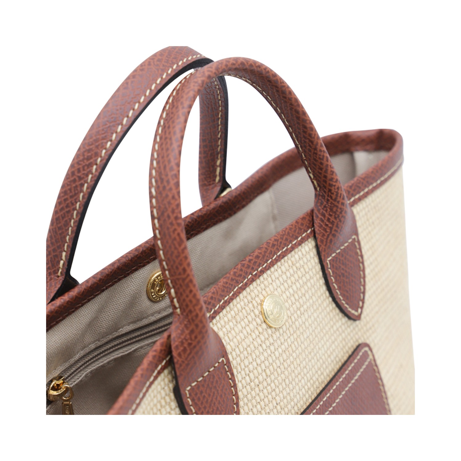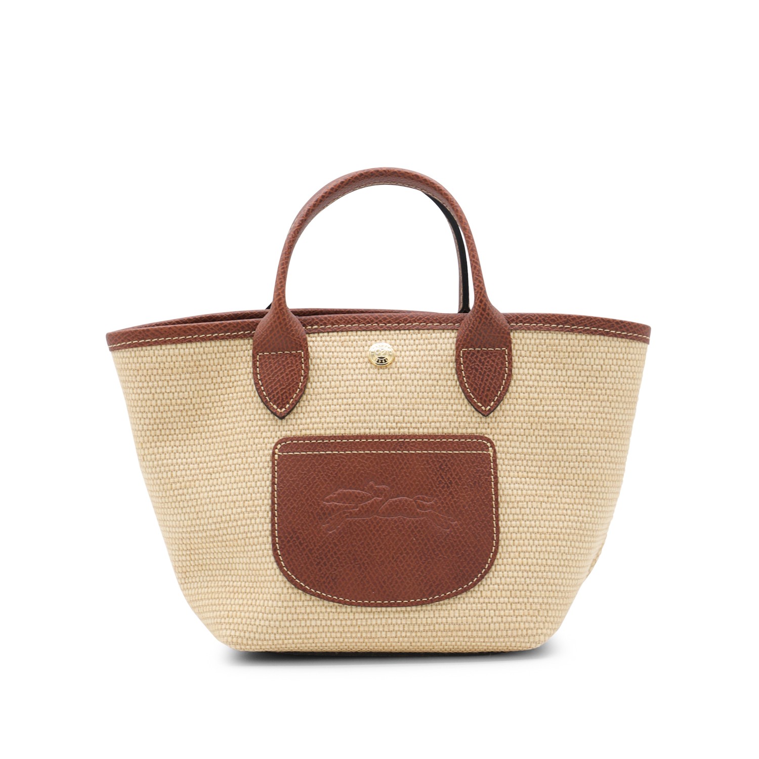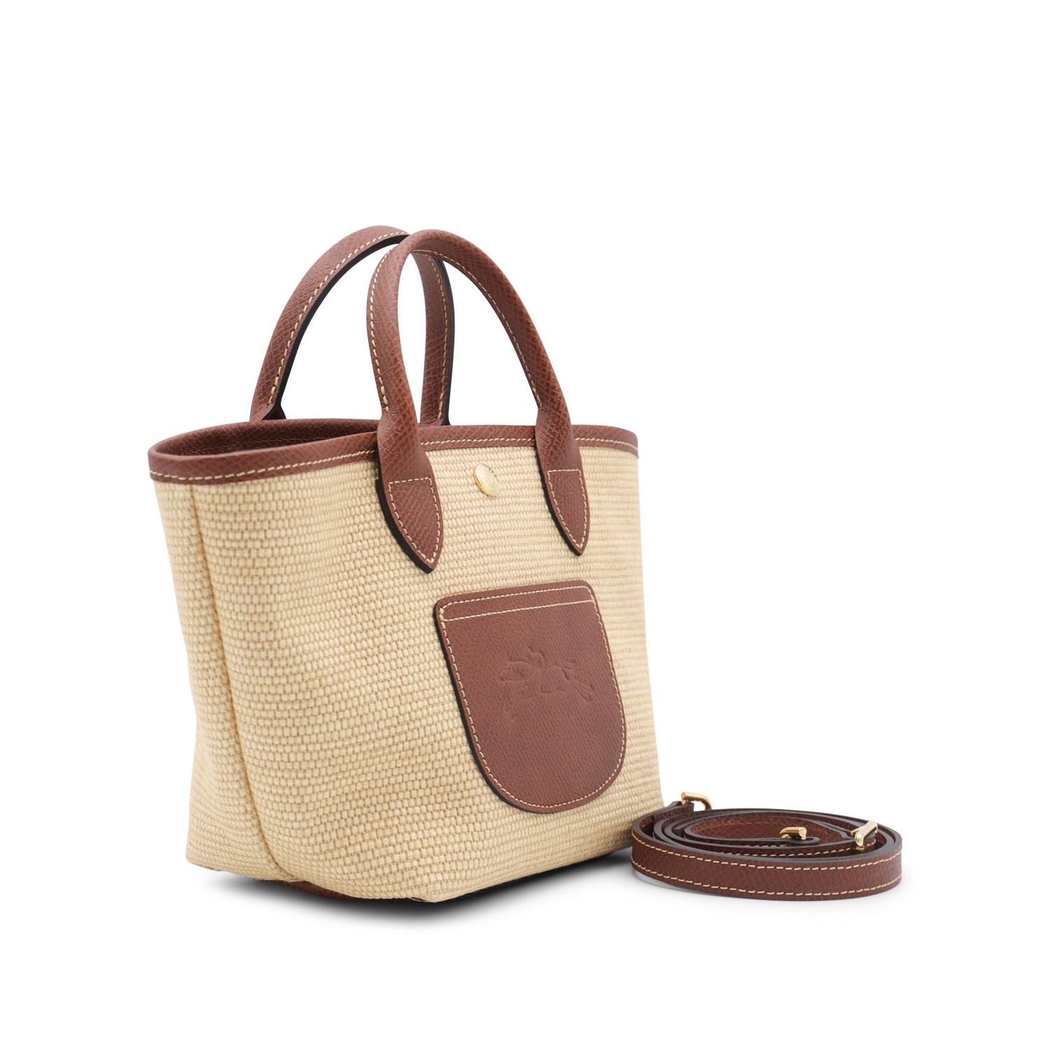 Beige and brown Raffia Le Panier Pliage Xs tote from Longchamp featuring top handles, frontal pocket with logo, button fastening and leather detail.