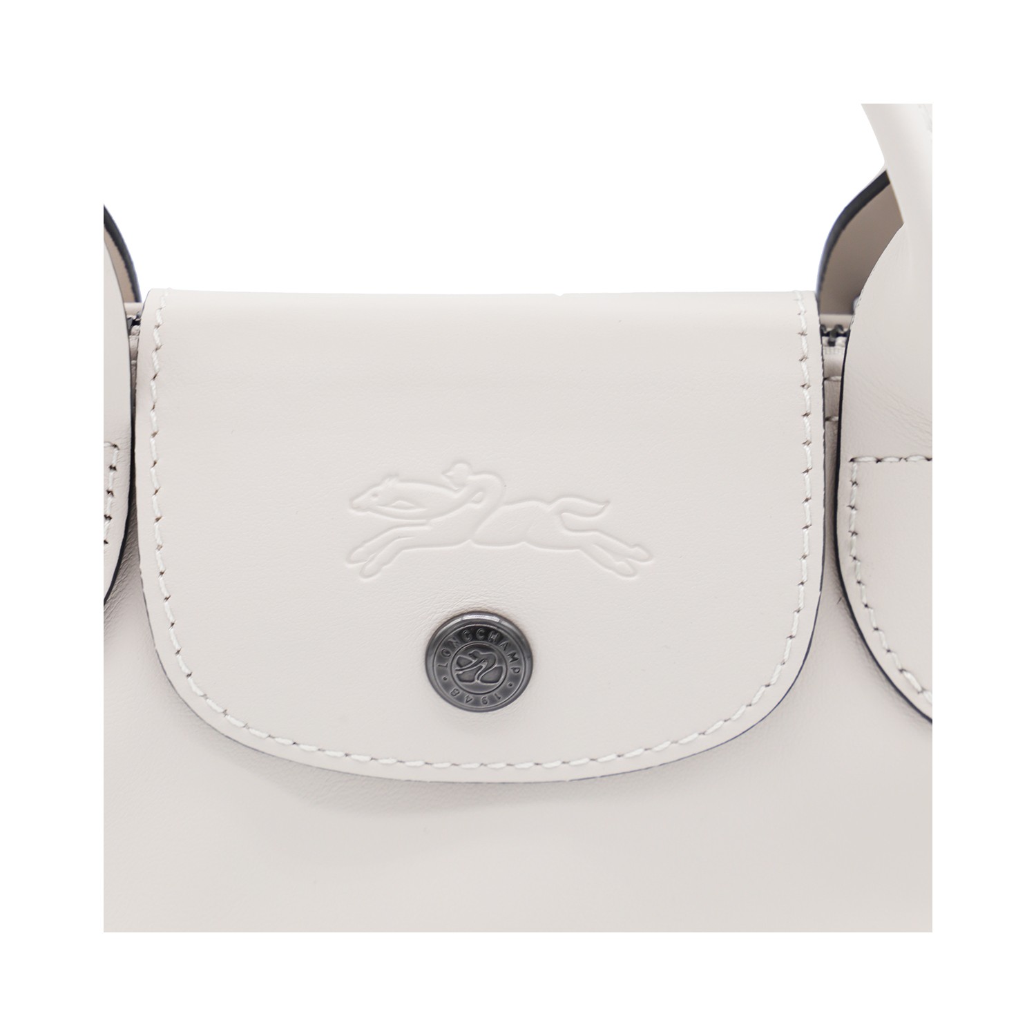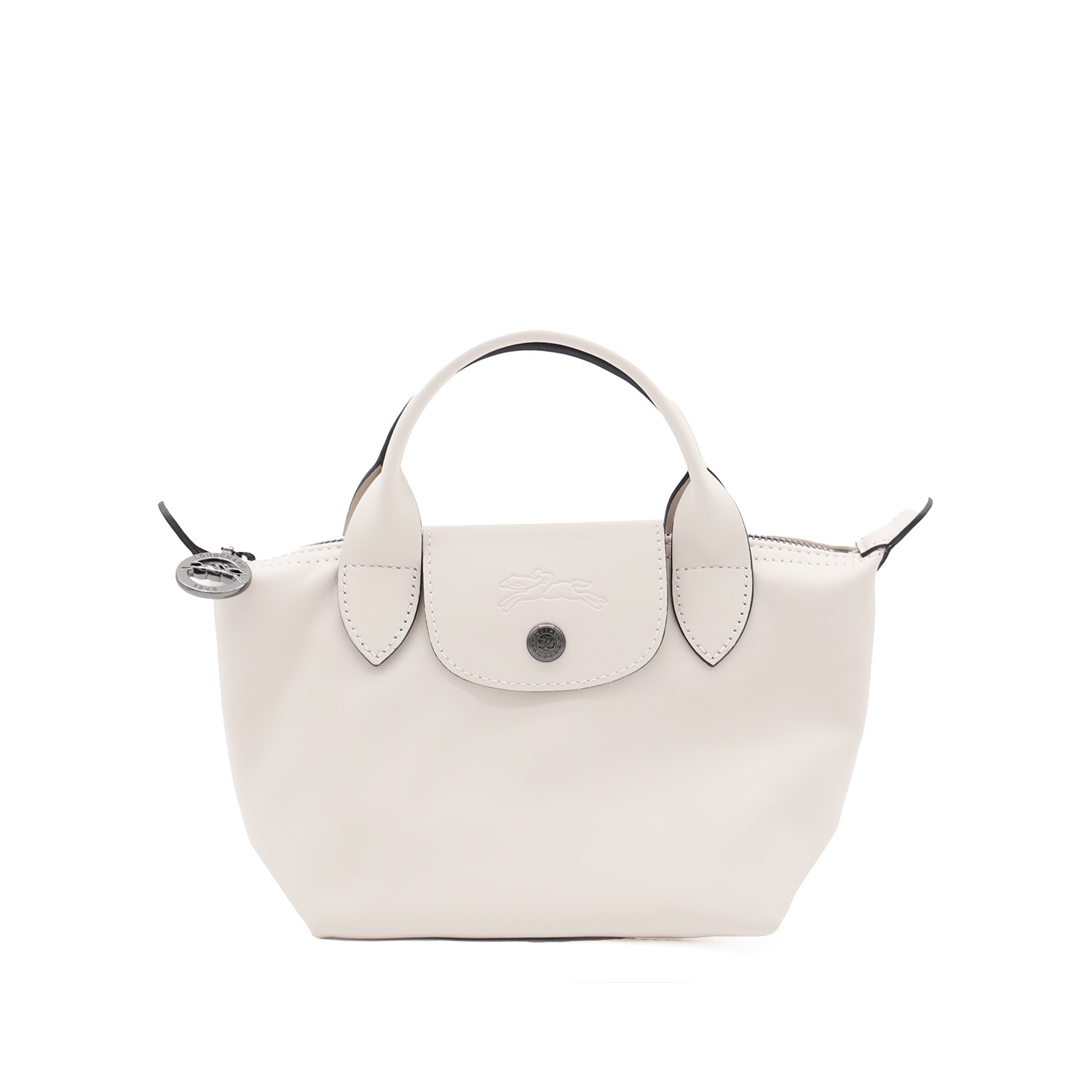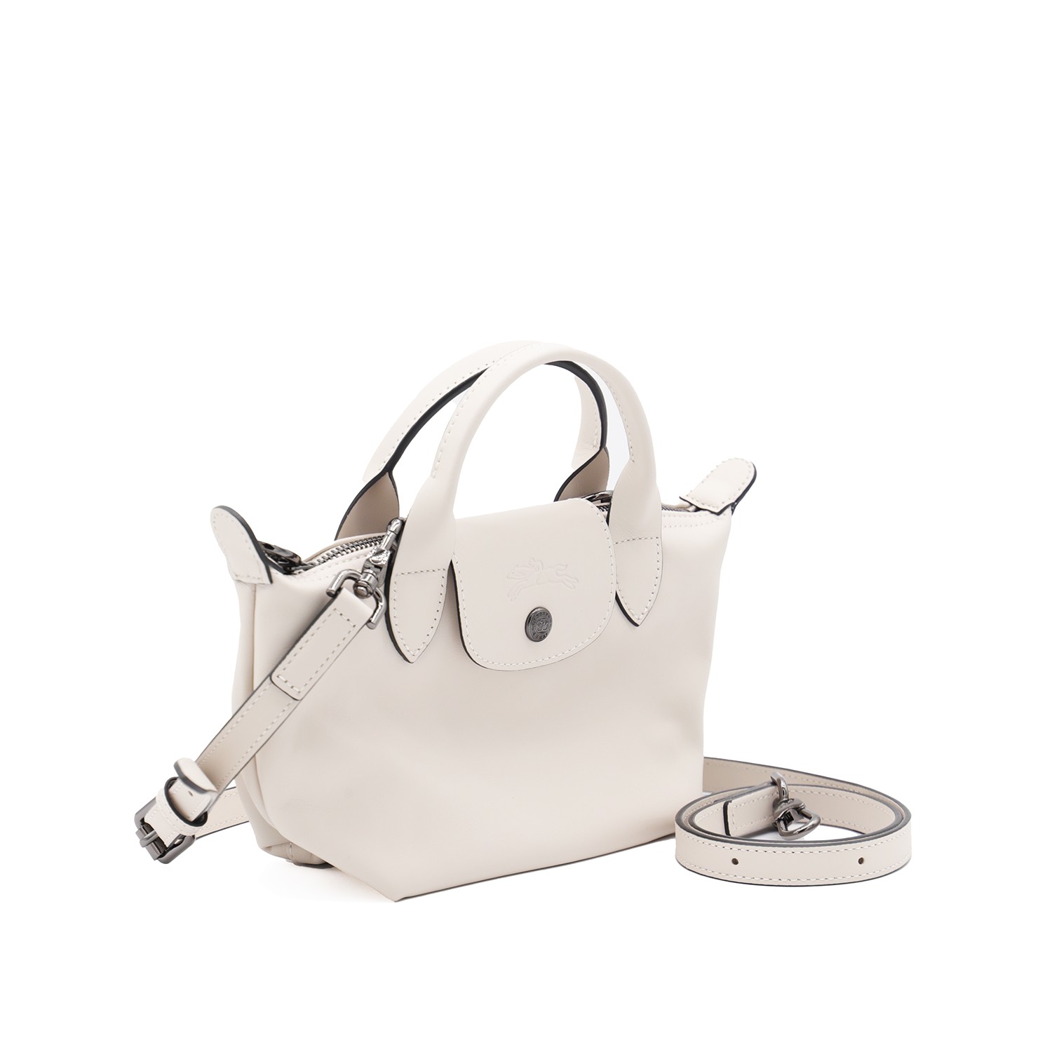 White leather Le Pliage Xtra Xs tote from Longchamp featuring short handles, zip fastening, snap button, main compartment, adjustable and removable shoulder strap and inner flat pocket.