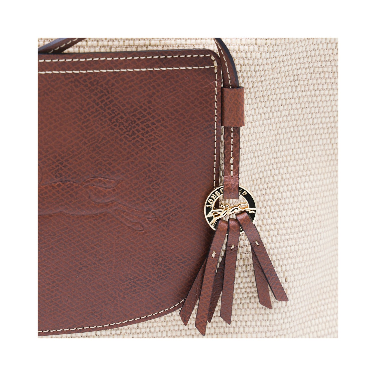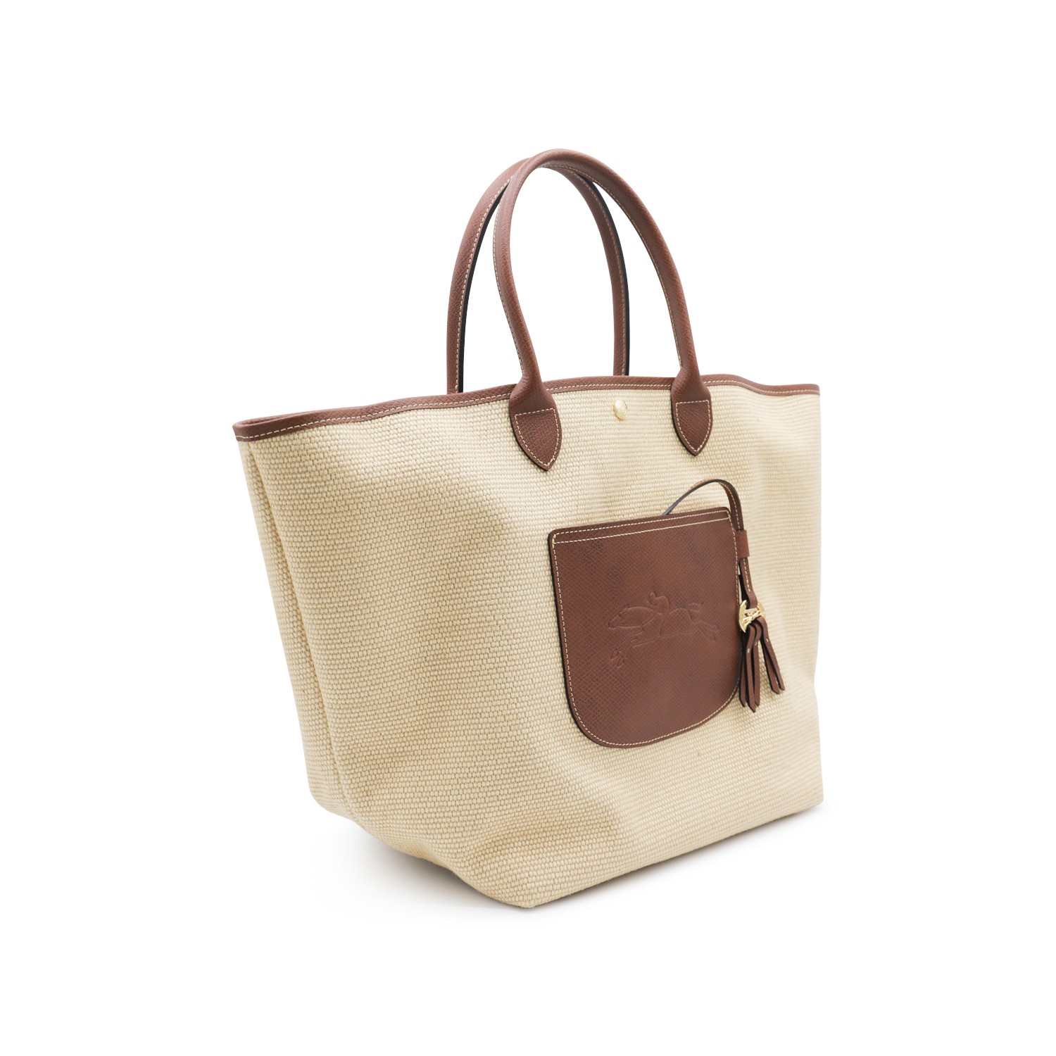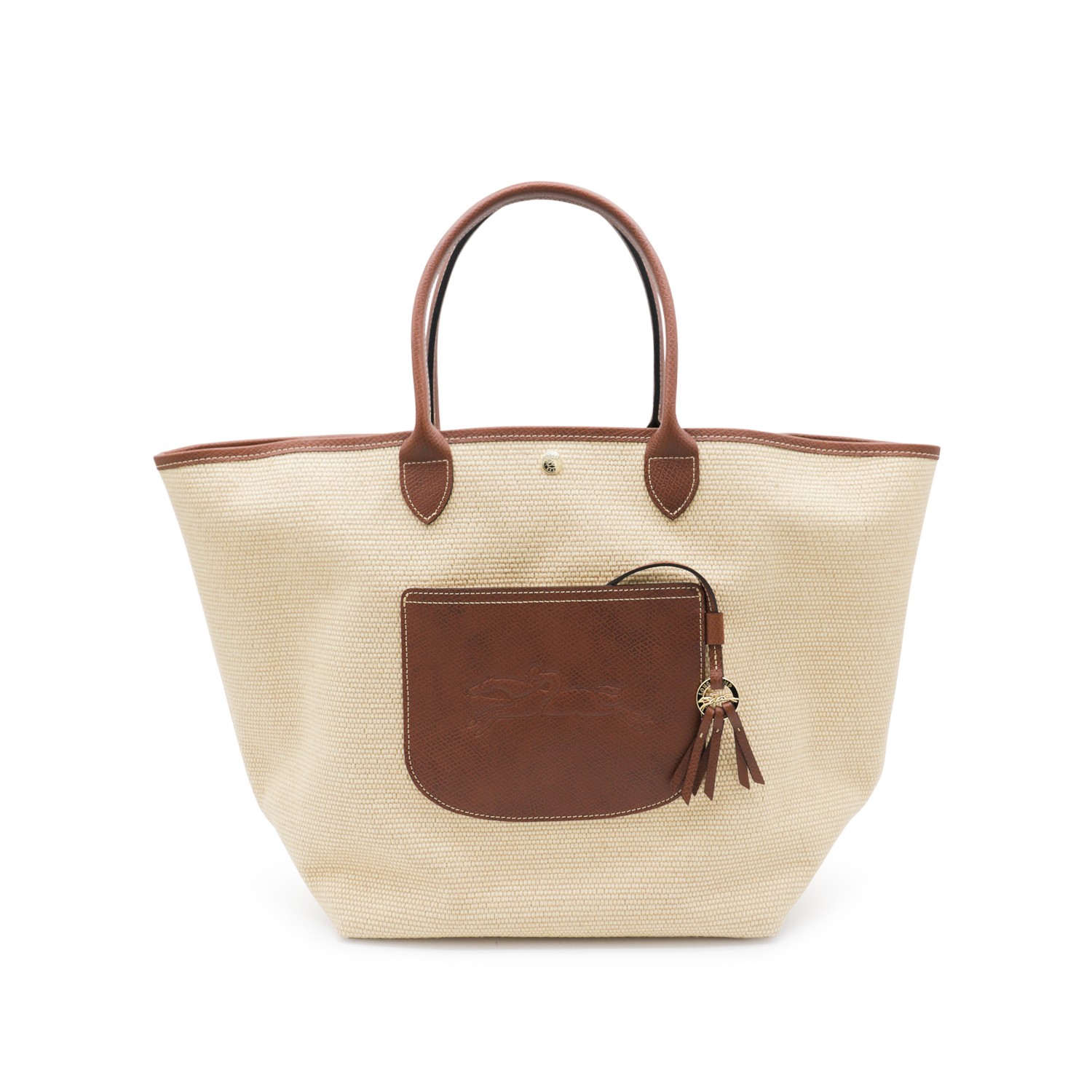 Beige and brown Raffia Le Panier Pliage L totes from Longchamp featuring top handles, frontal logo, button fastening and pocket.
